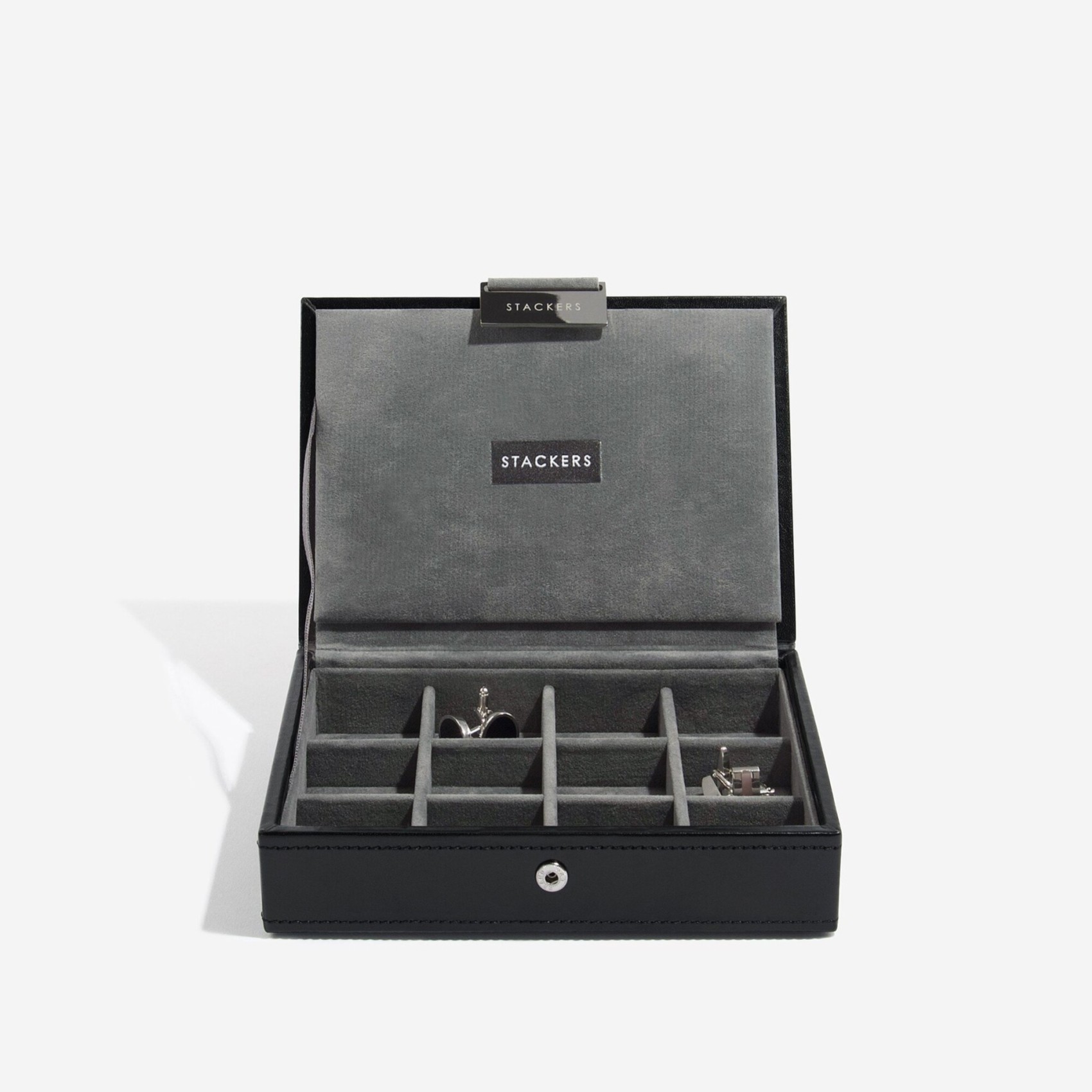 Keep your cufflinks organized in style. Made from smooth black vegan faux leather this cufflink box features a quality velvet lining and sits neatly on top of the Stackers watch layer.