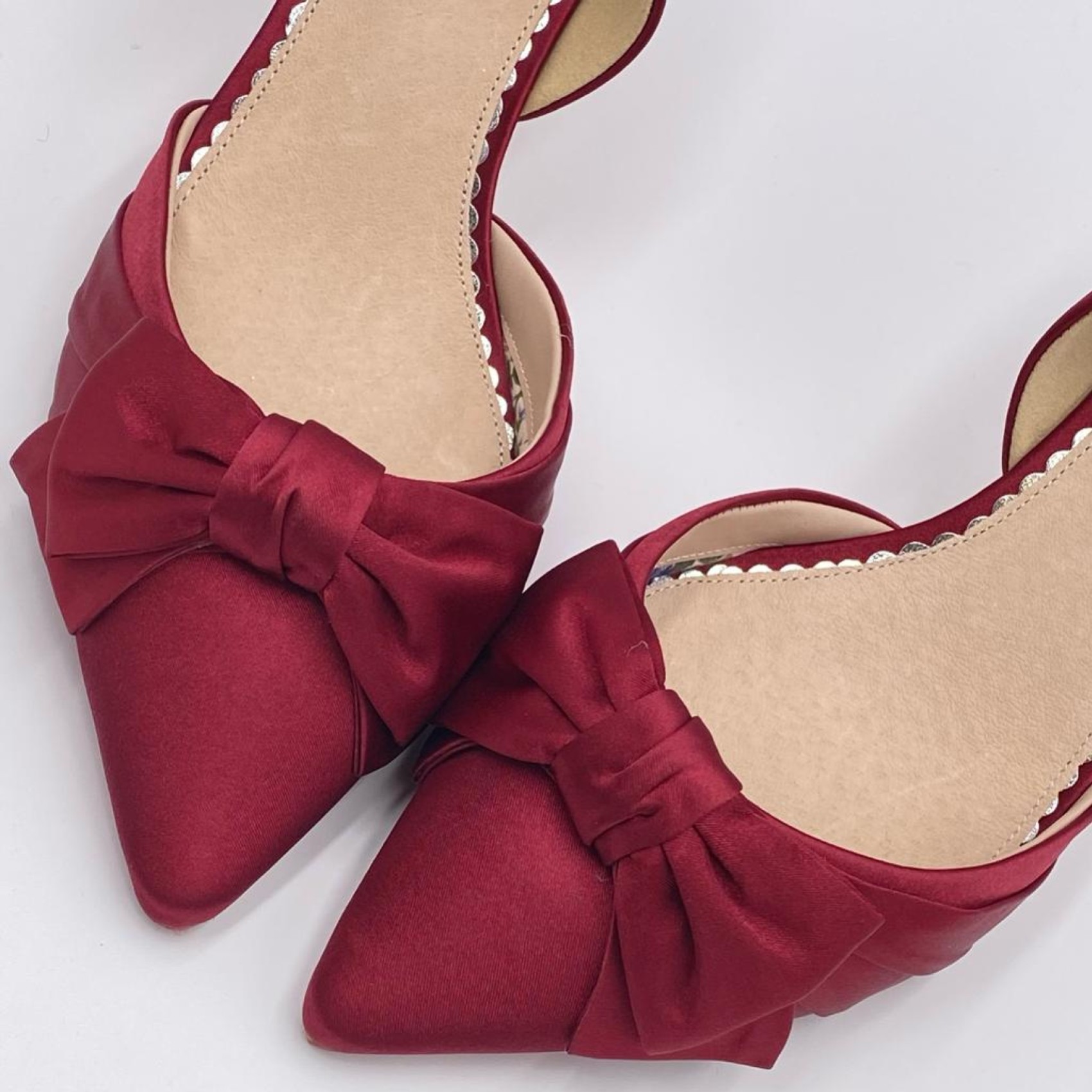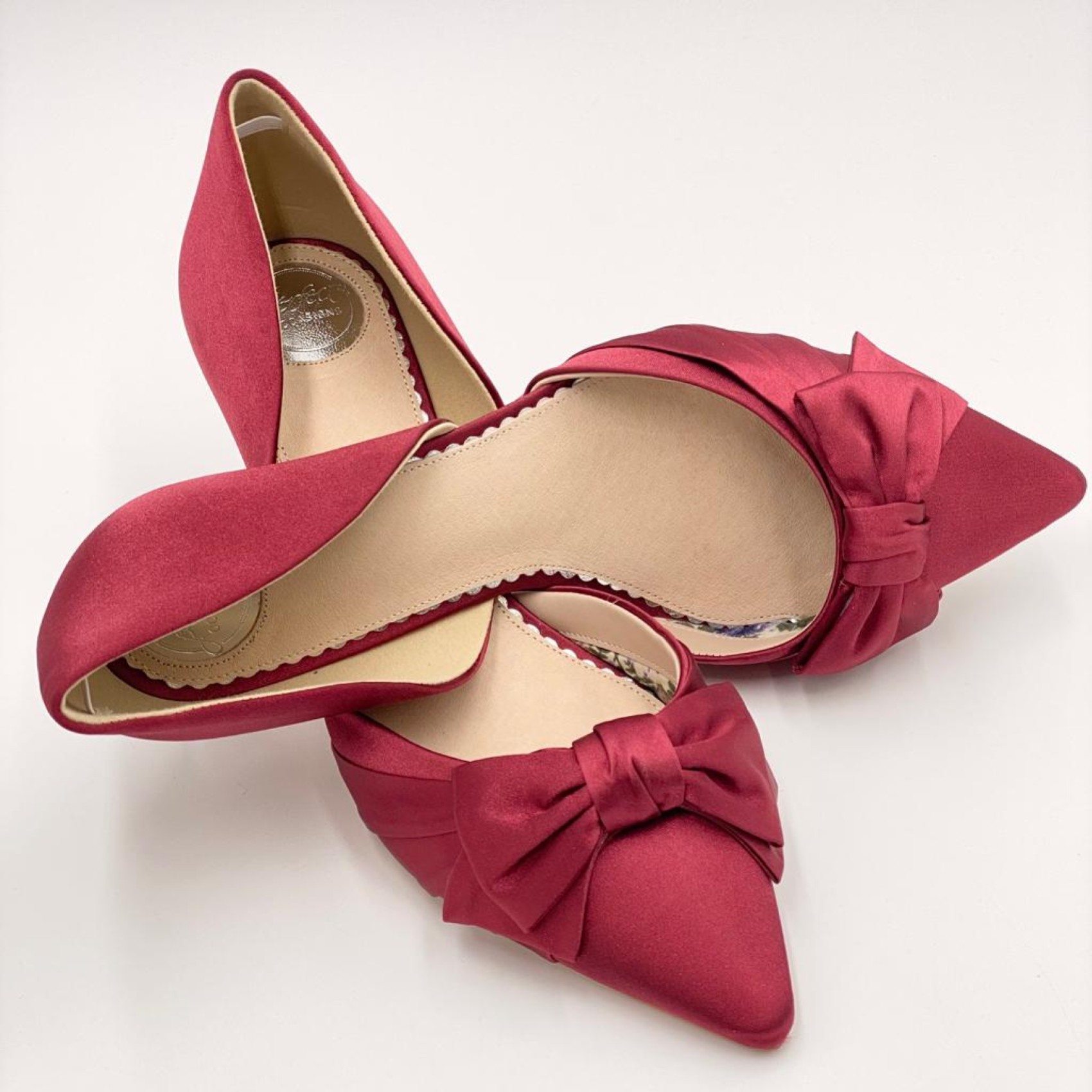 Our new Margo heels are just gorgeous! An elegant mid heel court shoe featuring a sophisticated pointed toe adorned with the cutest bow detail. Made from beautiful berry satin these special occasion shoes are perfect for the mother of the bride or groom, wedding guests, or a bride wanting a colored shoe. Burgundy shoes are a gorgeous choice for Winter and Christmas events!