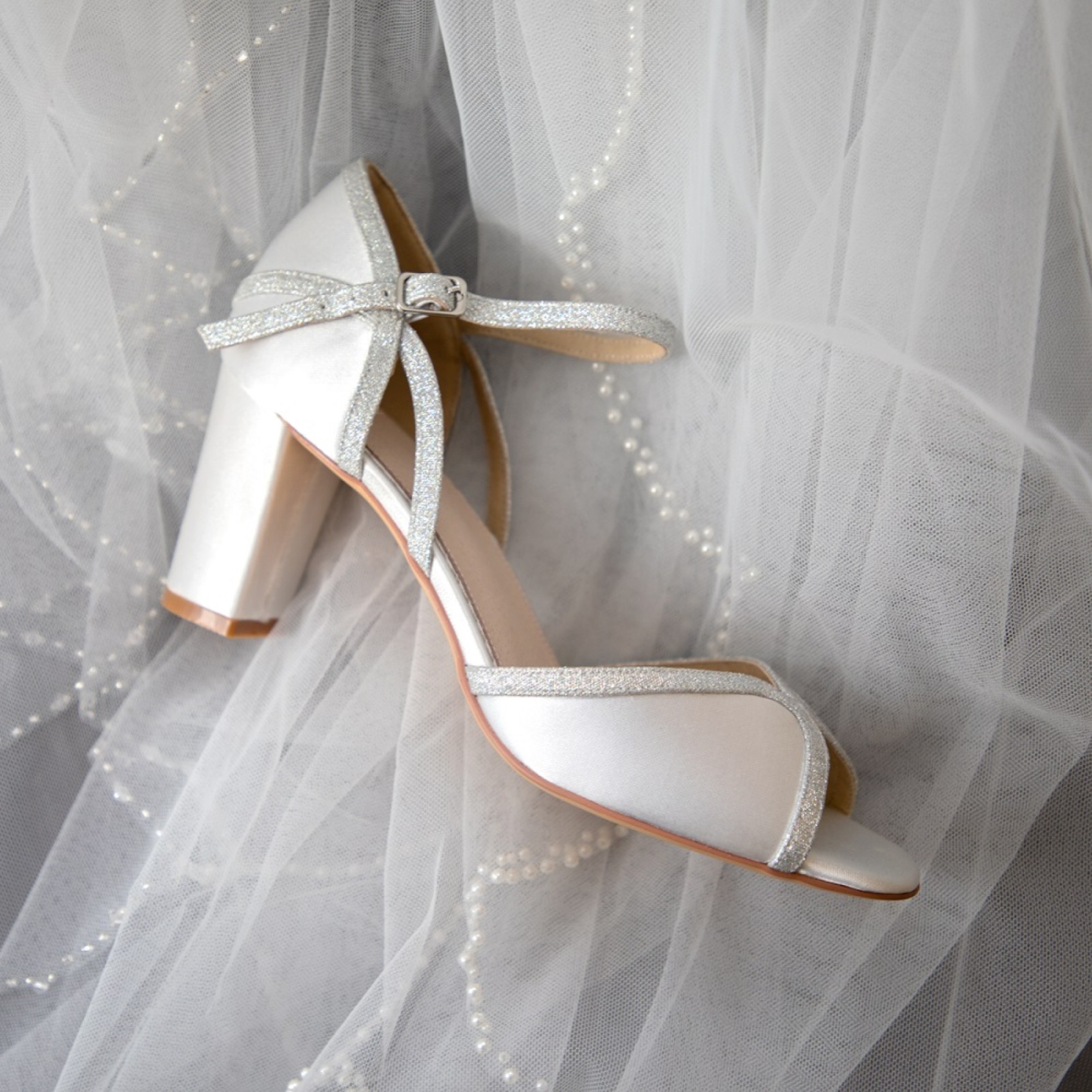 A stylish mid block heel peep toe bridal sandal crafted in dyeable ivory satin, Sabrina features silver fine shimmer glitter trim and delicate ankle strap. Perfect for brides looking for wedding shoes with a little touch of sparkle that won't catch on their dress! Complete with a cushioned leather insole for comfort.
