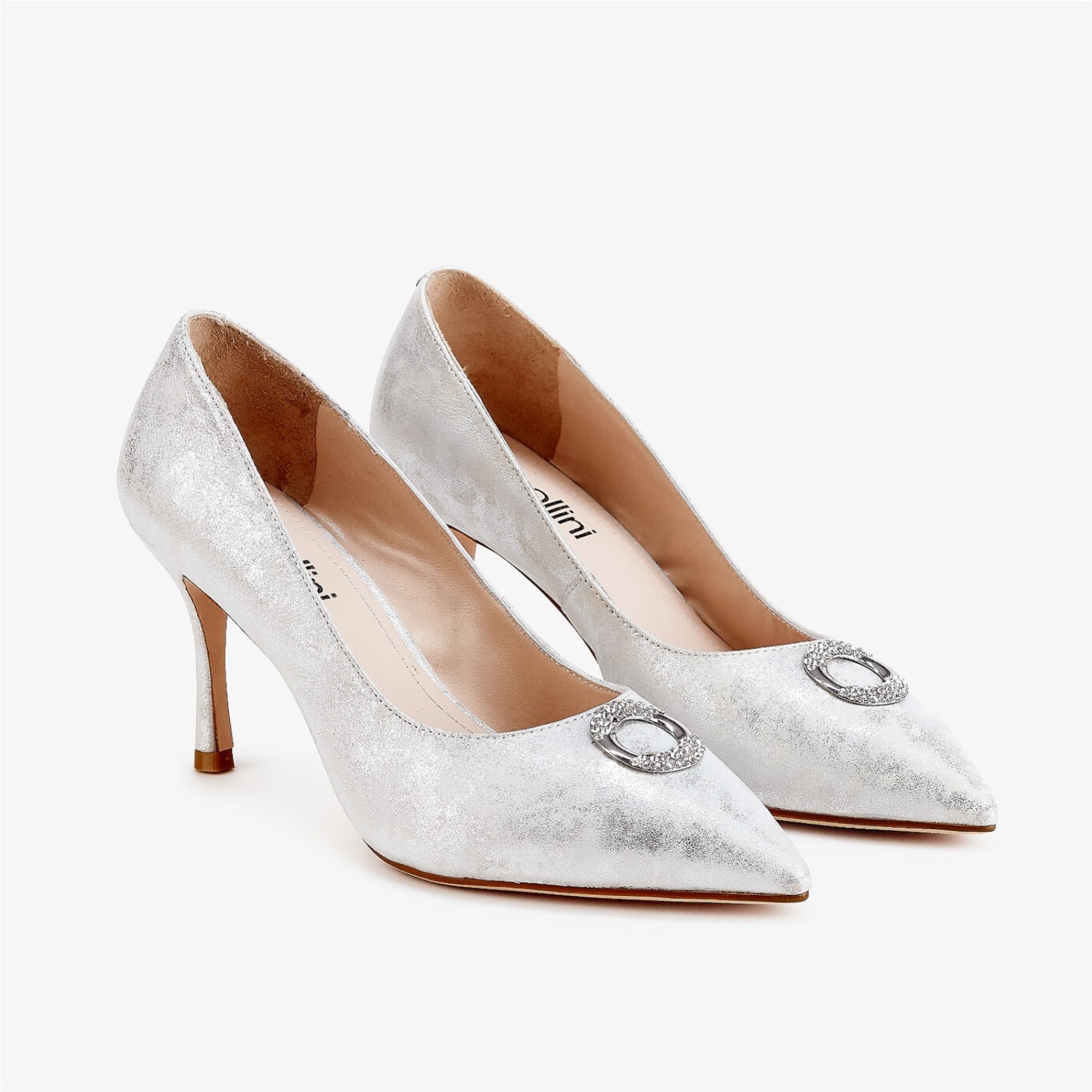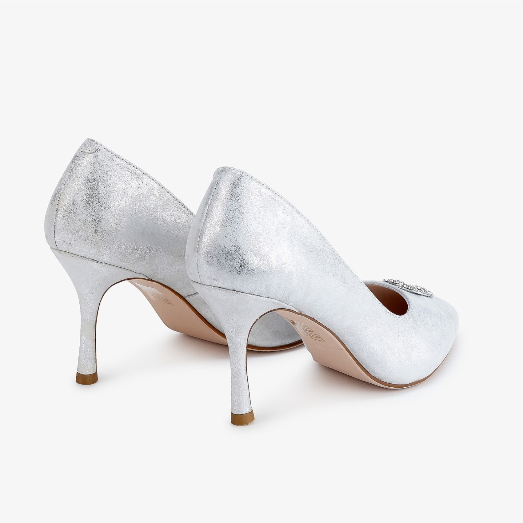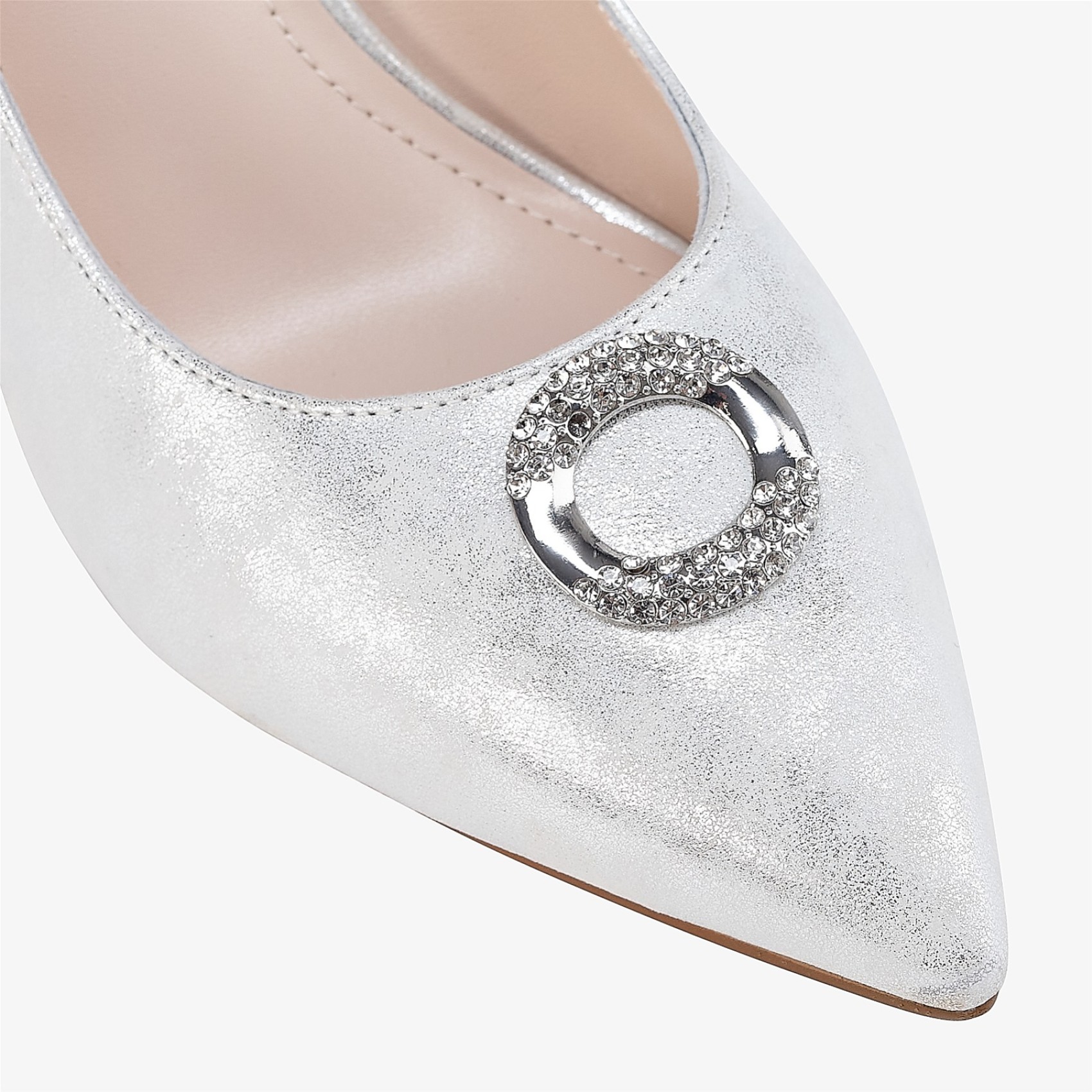 Handmade from pale silver nubuck leather these high heel court shoes boast an elegant pointed toe adorned with a diamante trim for a touch of glamor. The shimmering metallic fabric lends a luxe finish to this sophisticated style. A gorgeous choice for mother of the bride or groom, wedding guests and bridesmaids.