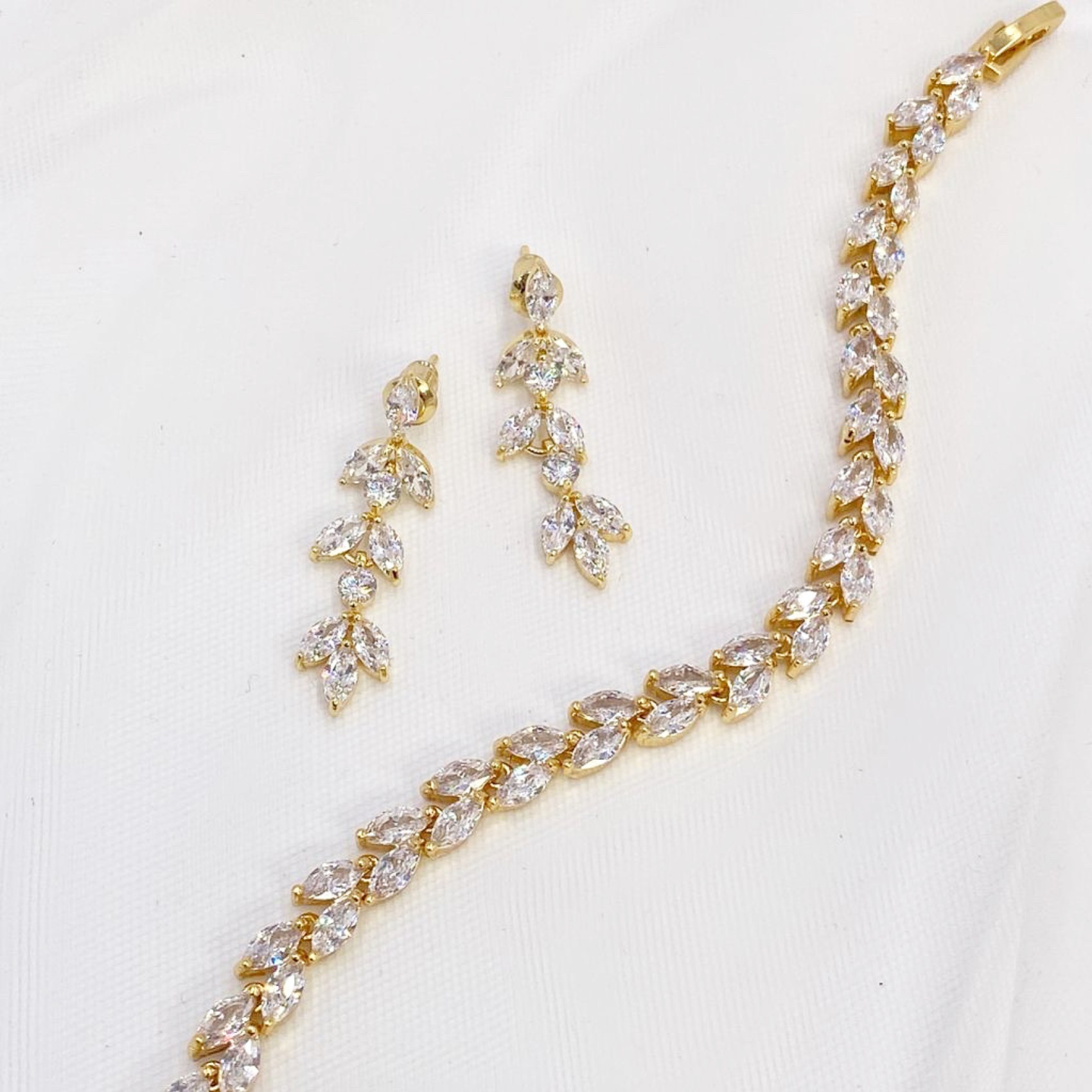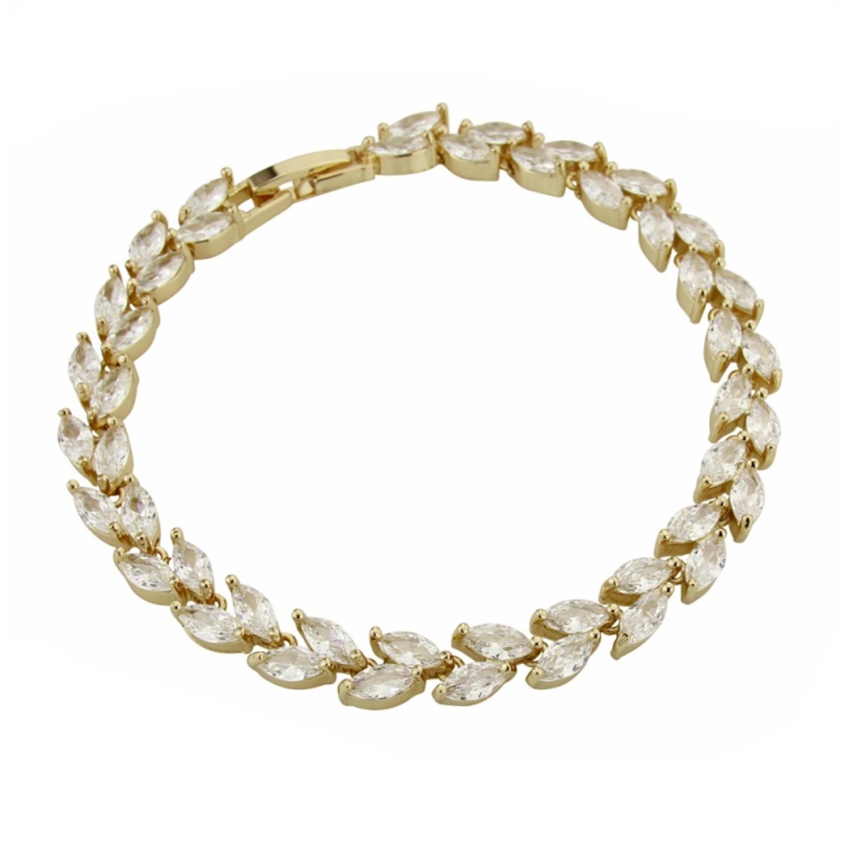 A beautiful crystal wedding bracelet adorned with marquise cubic zirconia crystals in gold settings, forming a glistening vine of leaves. It fastens with a fold over clasp. A versatile choice to complement classic, vintage of bohemian dresses.