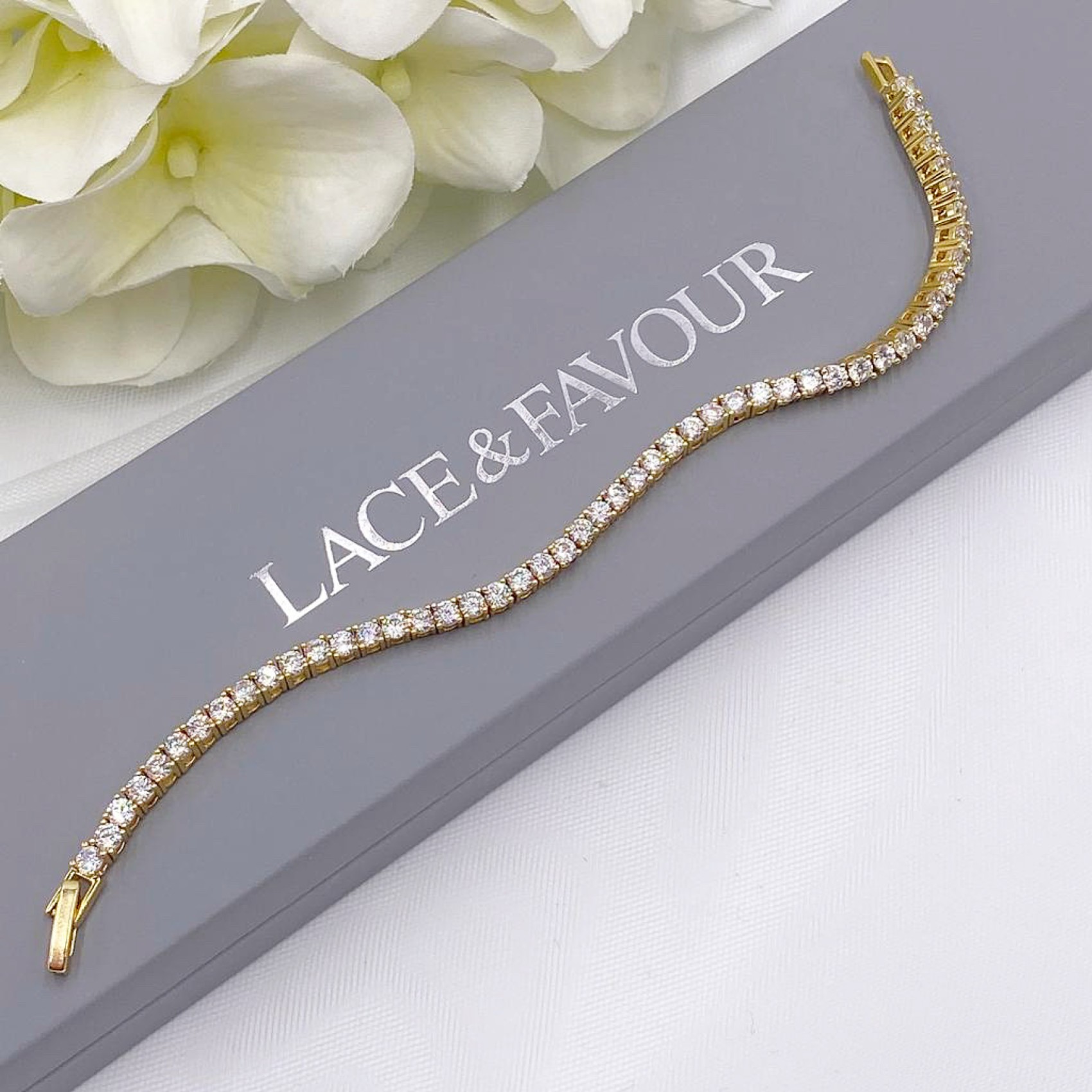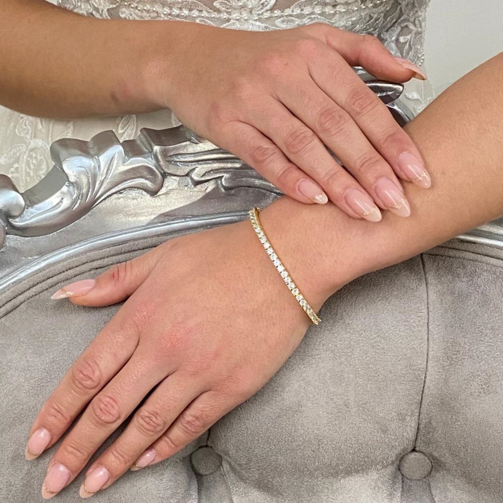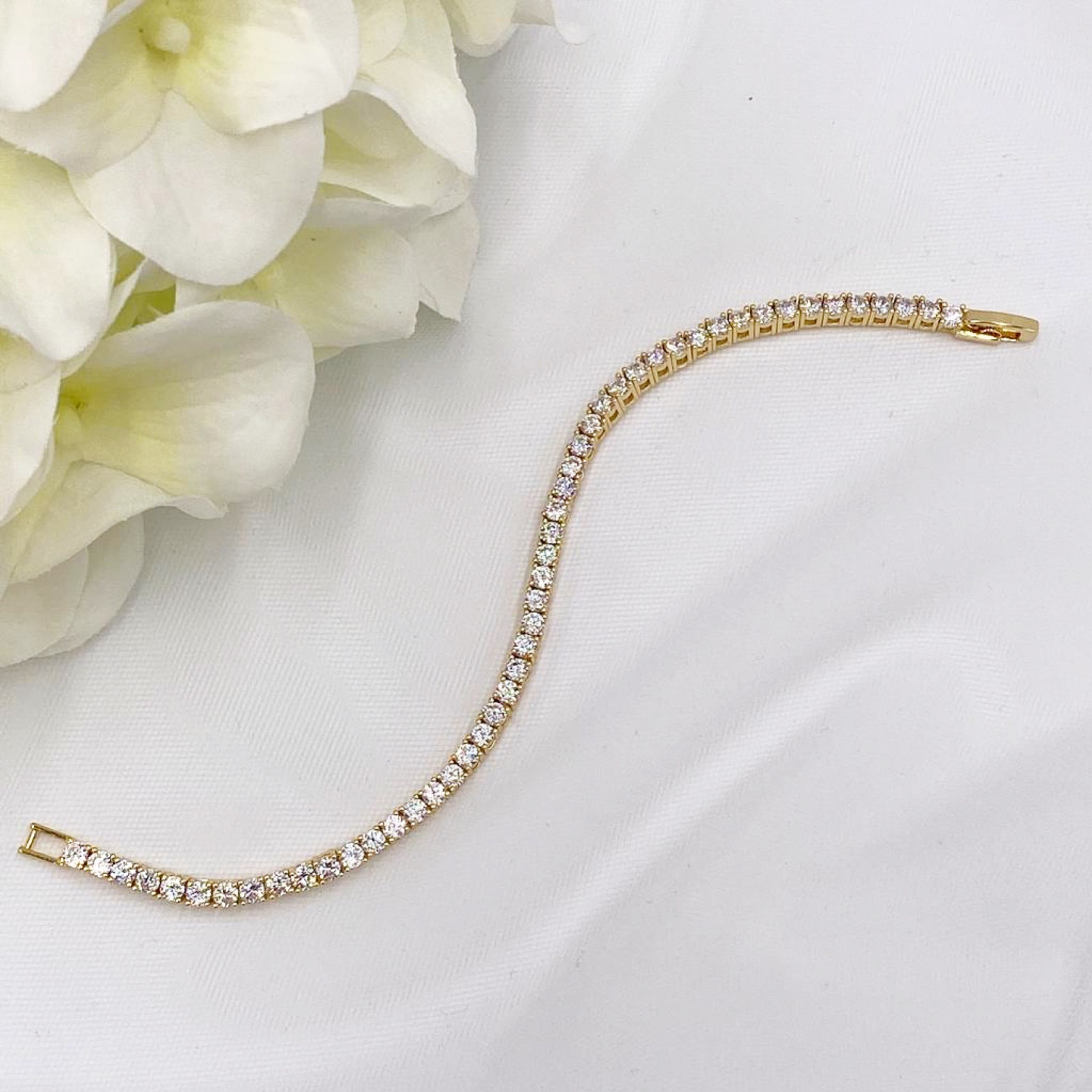 A delicate line of twinkling cubic zirconia crystals encircle the wrist in this slim gold tennis bracelet. A dainty and elegant choice for brides and a stunning jewelry gift for bridesmaids too.