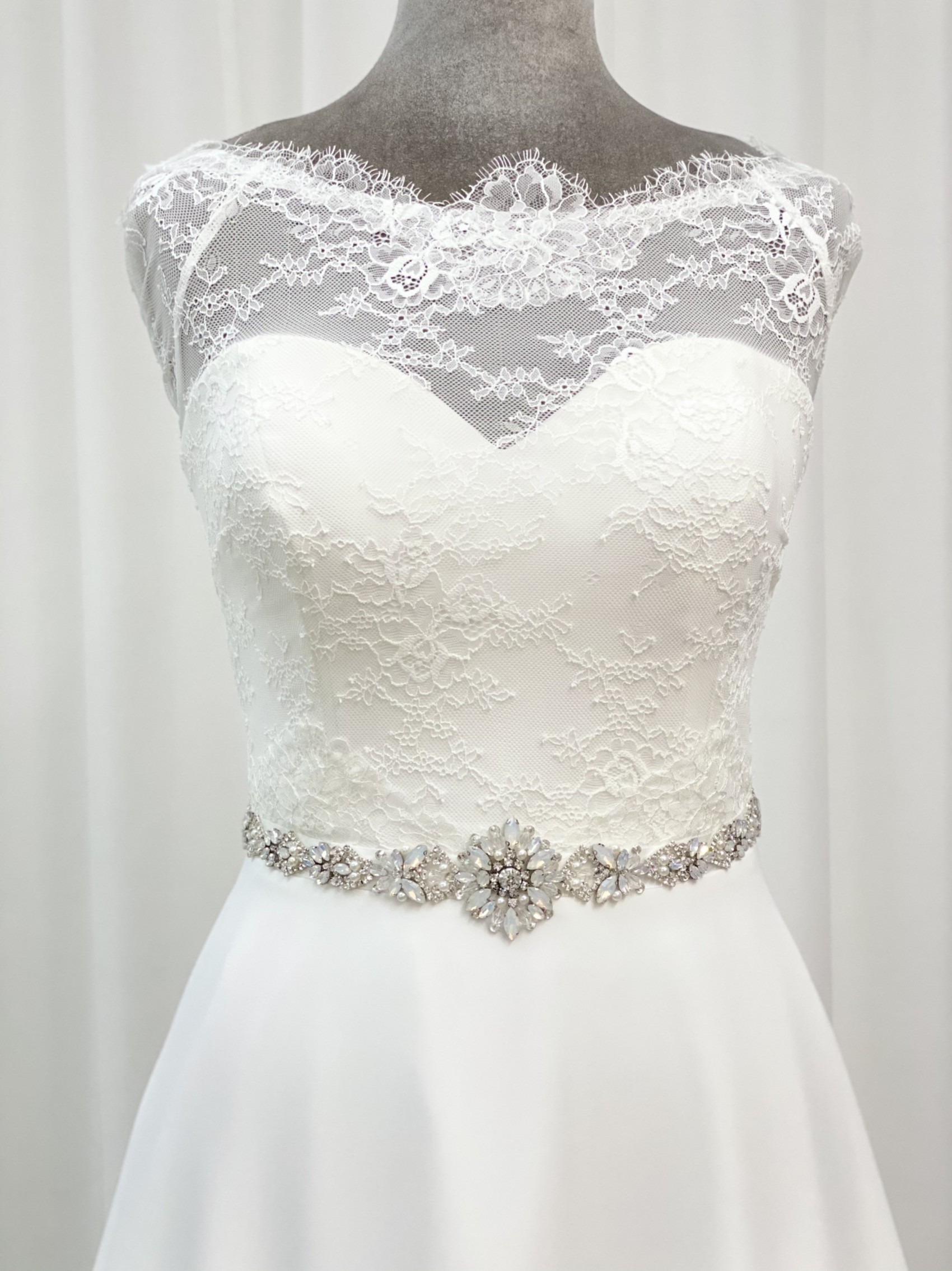 Gorgeous opalescent crystal and clear crystal sash belt with a central floral motif. Finished with ivory pearl accents. The beautiful details are mounted onto ivory satin ribbon which can be tied in a bow at the back of the dress. The perfect bridal belt to complement opal wedding accessories.