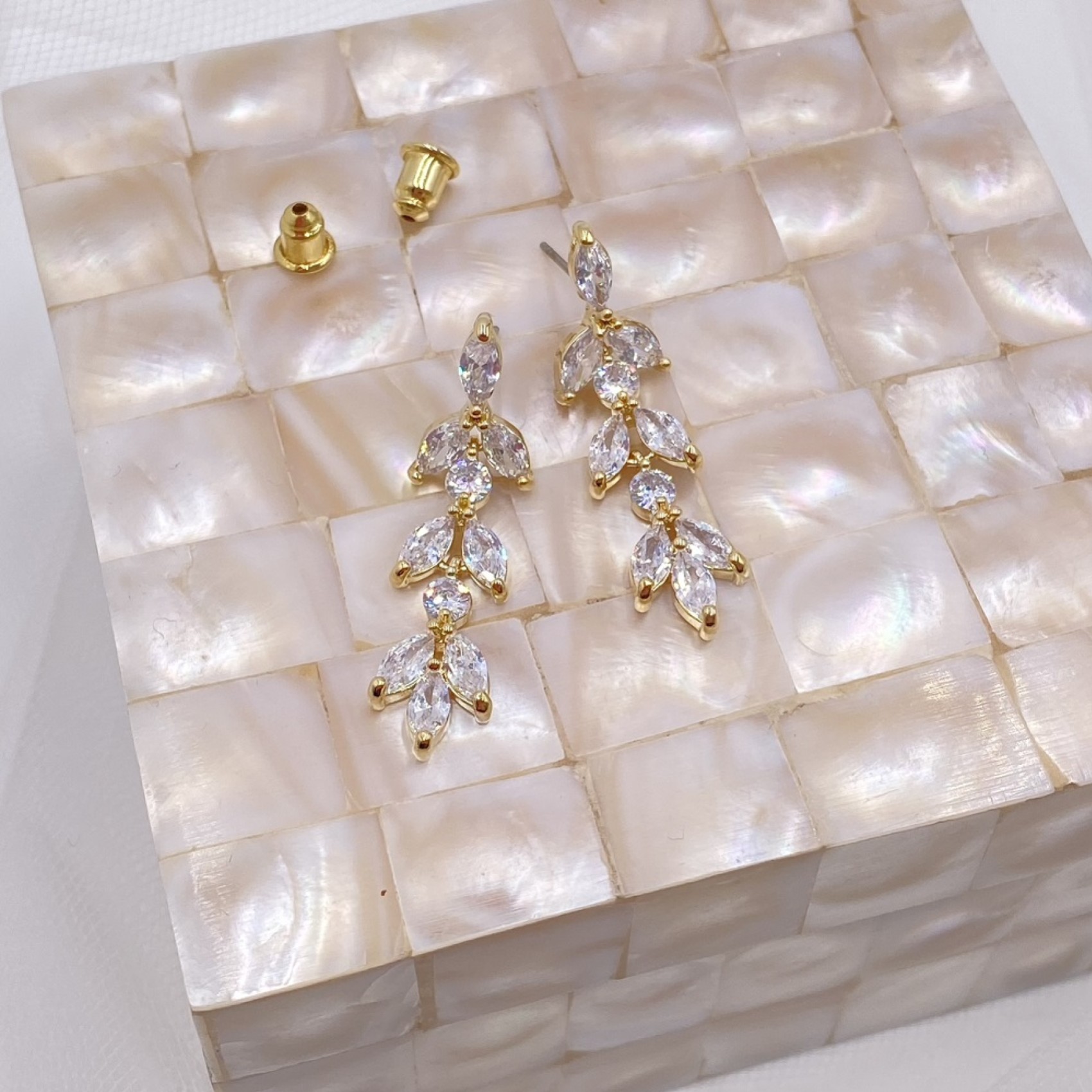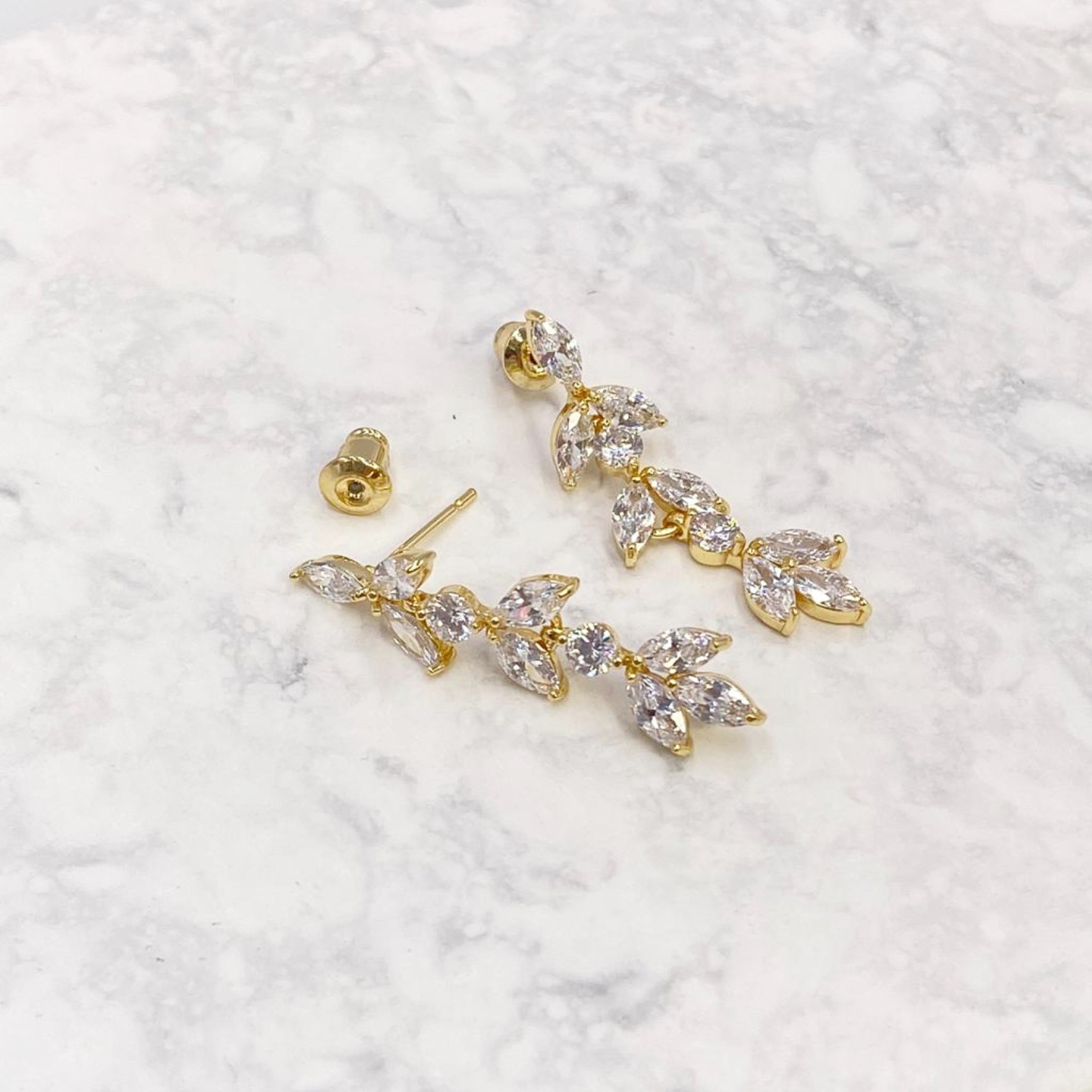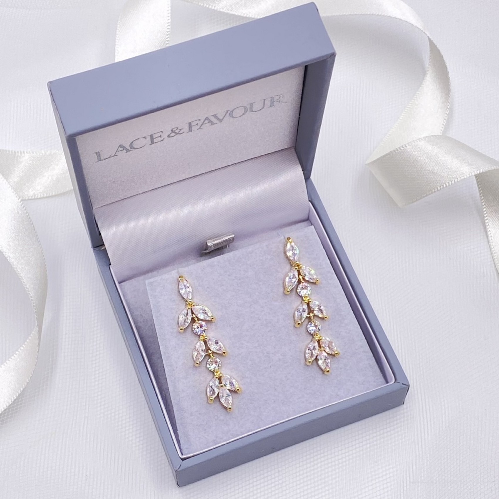We are totally in love with this delicate pair of gold crystal drop earrings. New in for 2019, our Aria earrings feature leaf-like cubic zirconia crystals, interspersed with glistening solitaires in an elegant drop design. Perfect for both brides or bridesmaids.