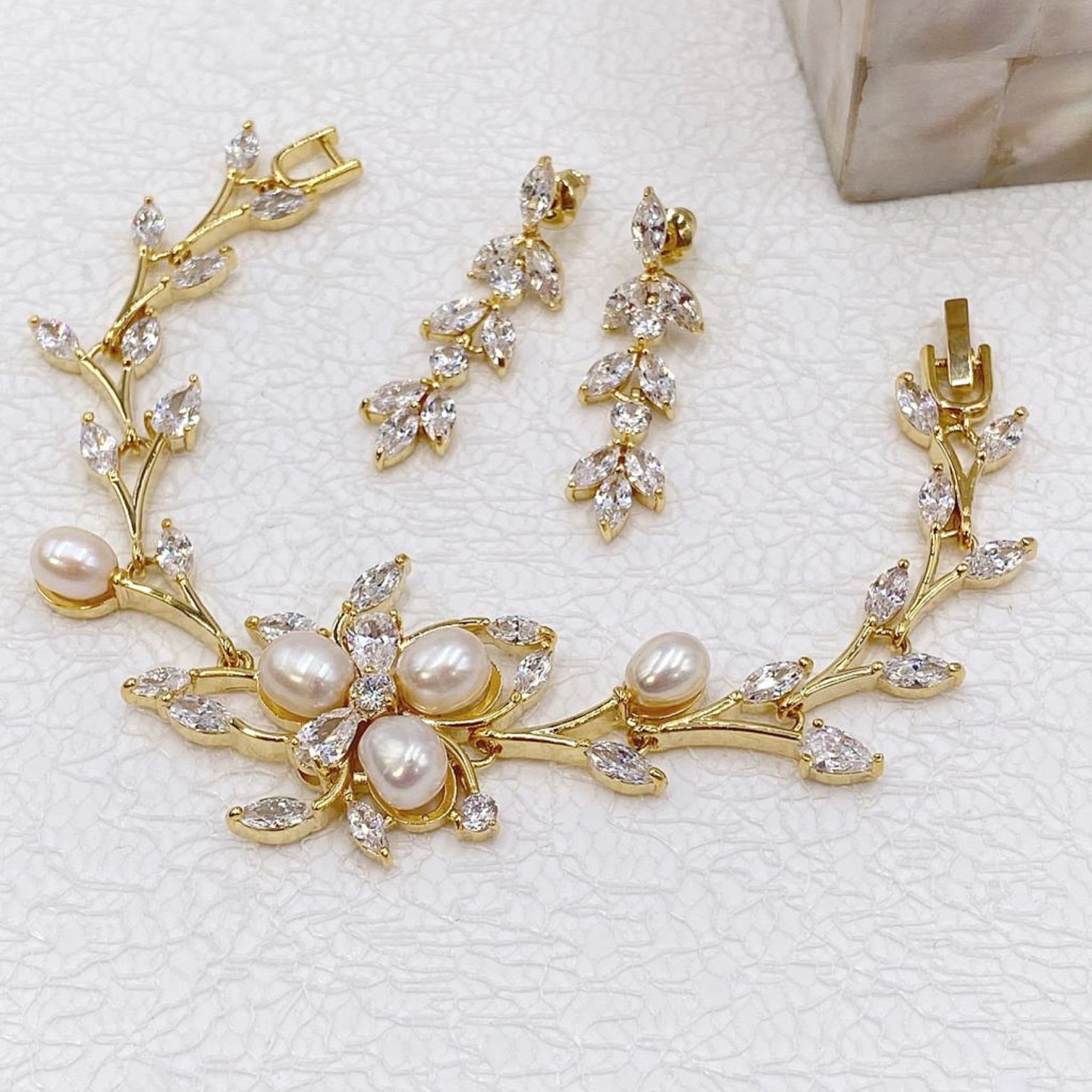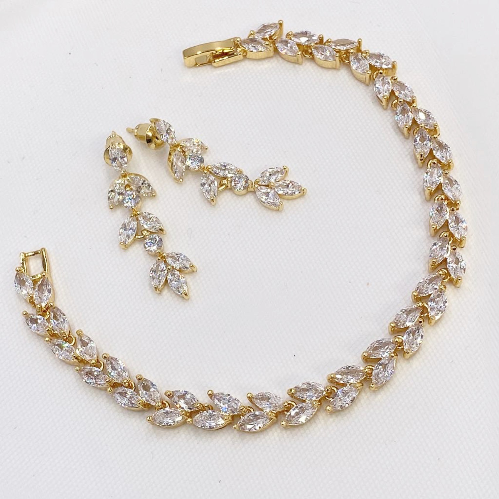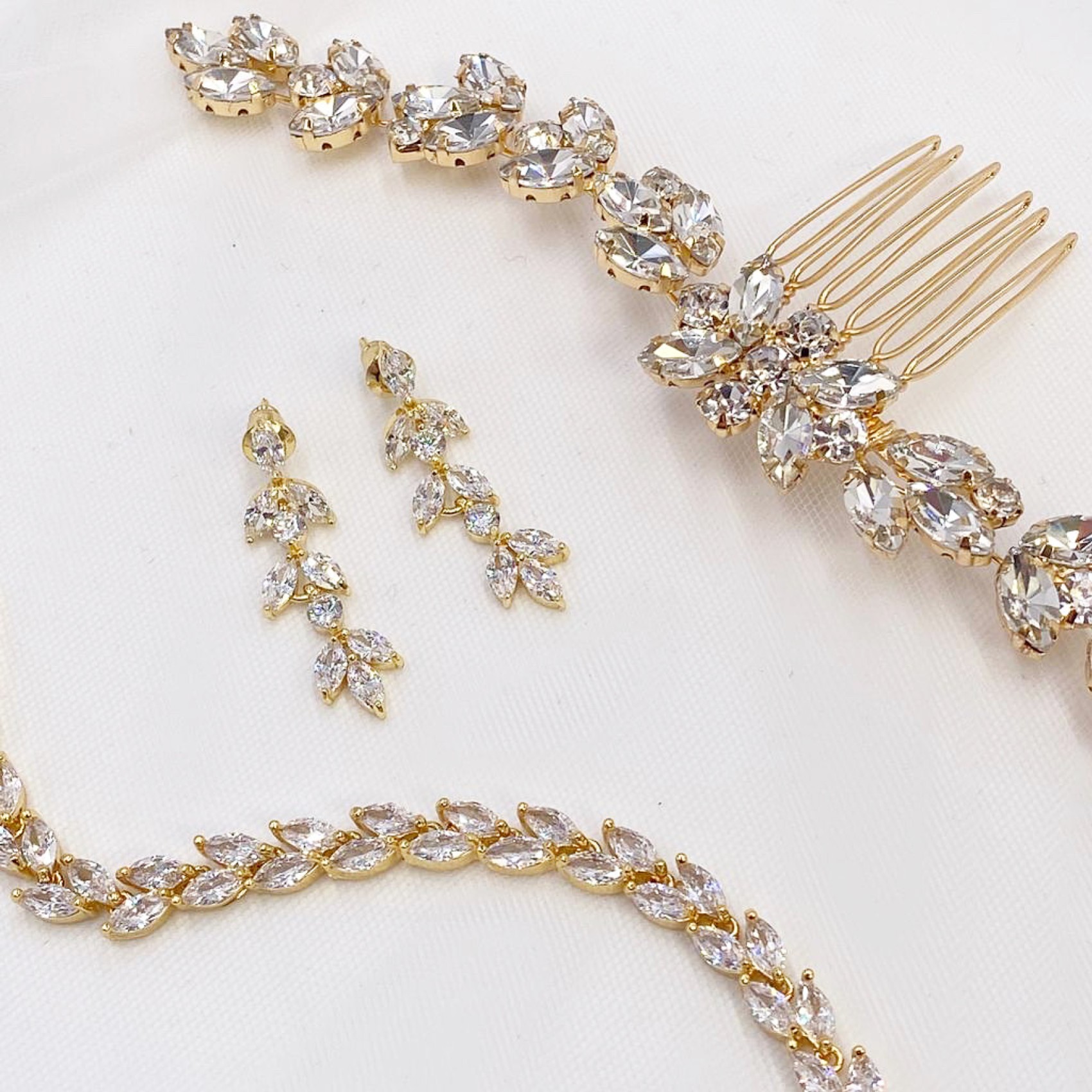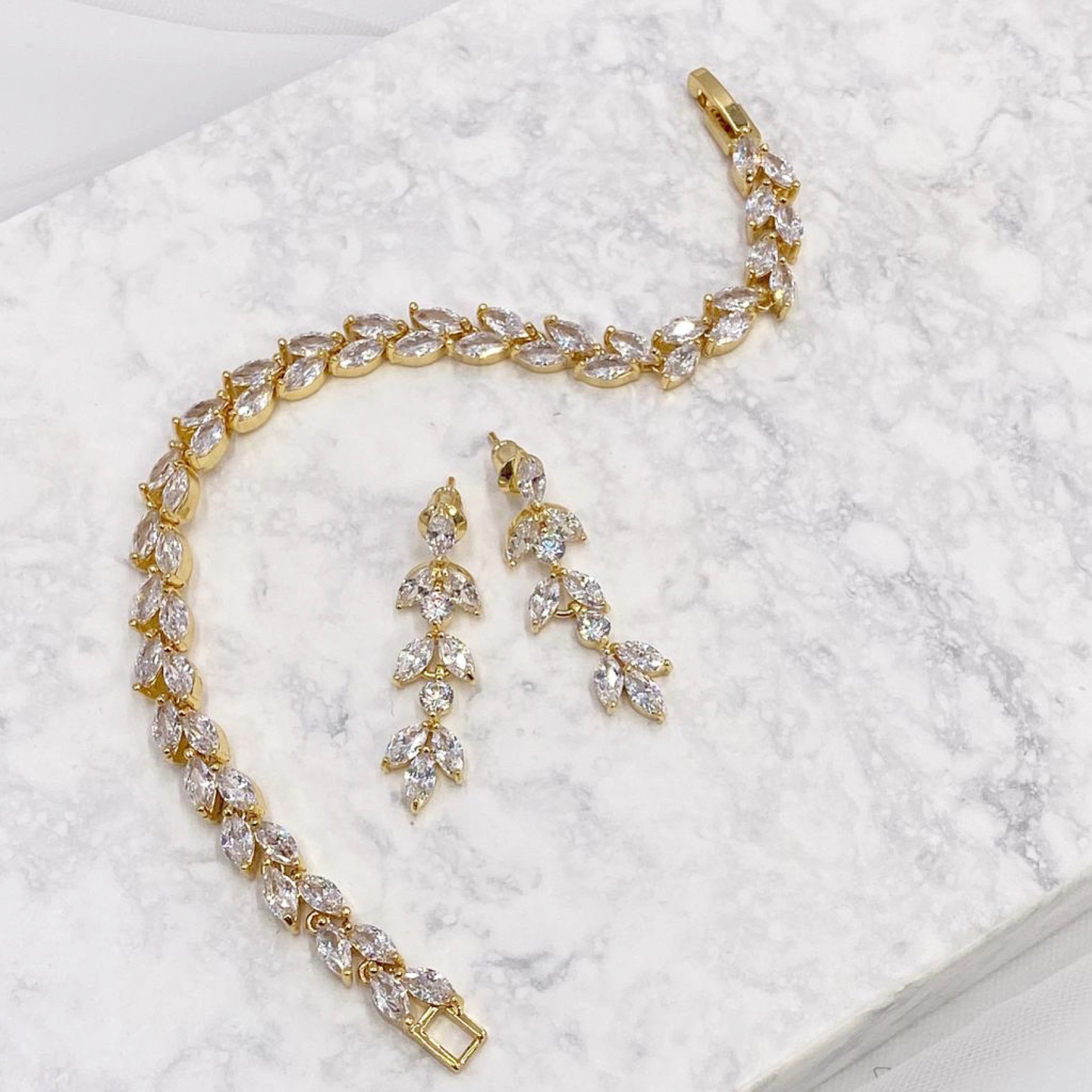 We are totally in love with this delicate pair of gold crystal drop earrings. New in for 2019, our Aria earrings feature leaf-like cubic zirconia crystals, interspersed with glistening solitaires in an elegant drop design. Perfect for both brides or bridesmaids.
