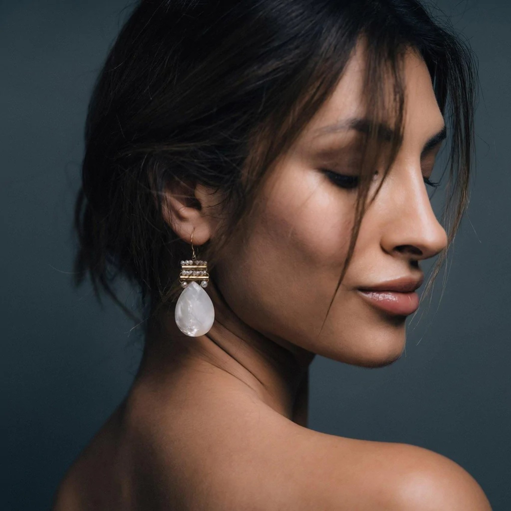 These gorgeous light-to-wear bridal earrings by Freya Rose feature a shimmering pear-shaped Mother of Pearl, topped with small seed pearls. These statemnet pearl earrings have been handcrafted by artisans. As a result, the end finish is a truly treasurable piece of jewelry for weddings and special occasions. Team with a pair of mother of pearl heels for a show stopping look.