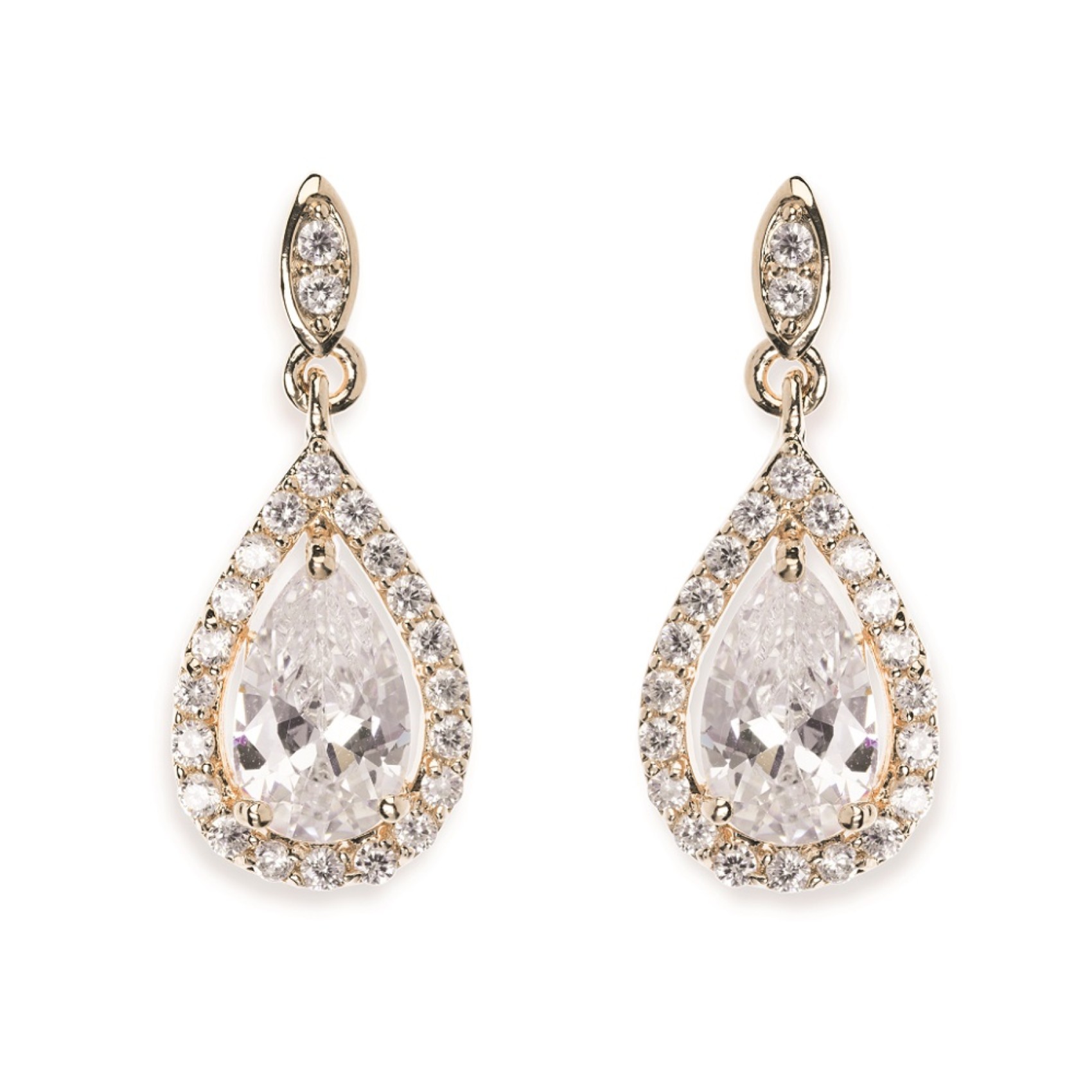 A beautiful and classic design the Belmont earrings are a firm favorite! Featuring twinkling faceted teardrop stones surrounded by tiny pave set crystals which suspends from a slender stud. These refined crystal drop earrings will complement any bridal style and the dainty design makes this pair perfect for bridesmaids too.