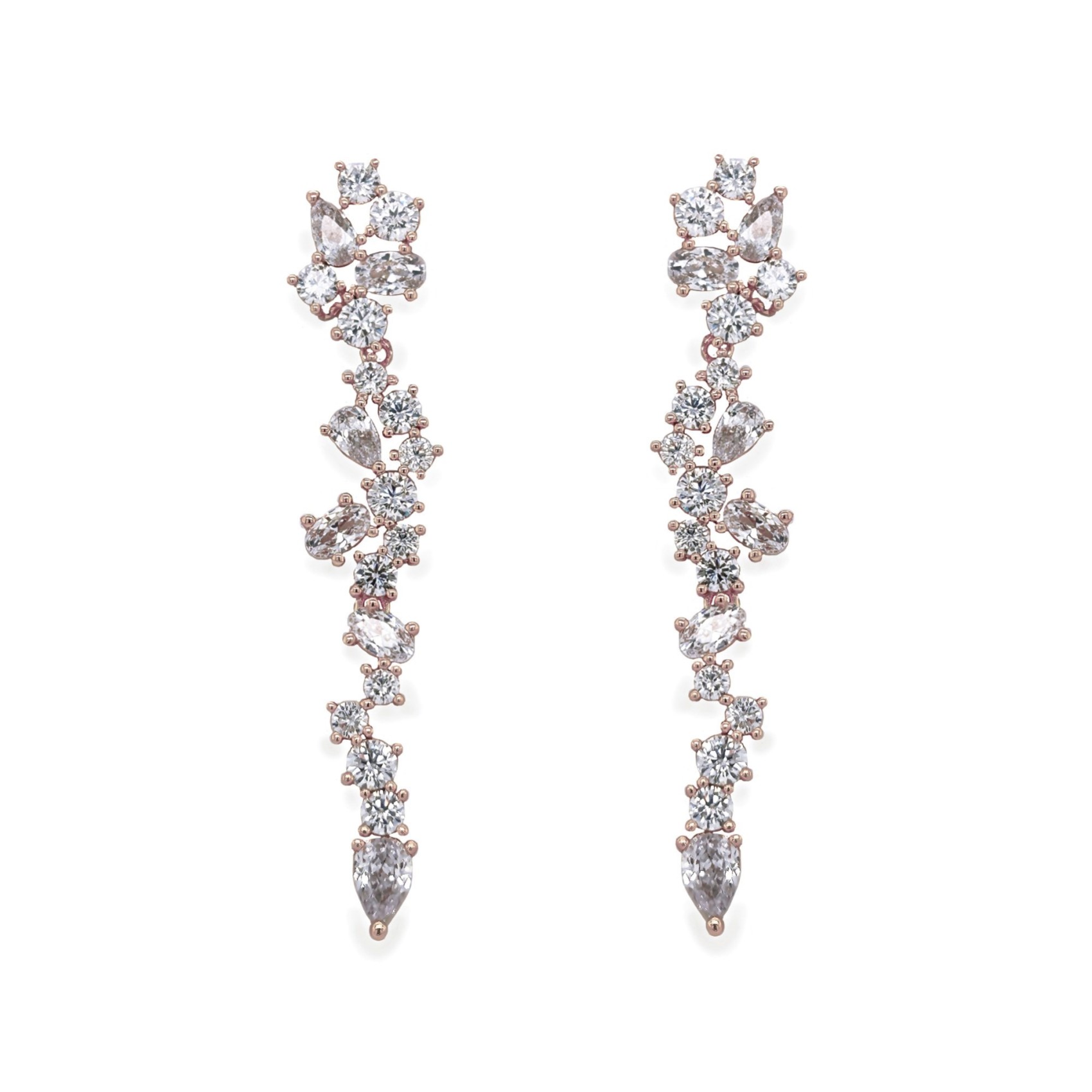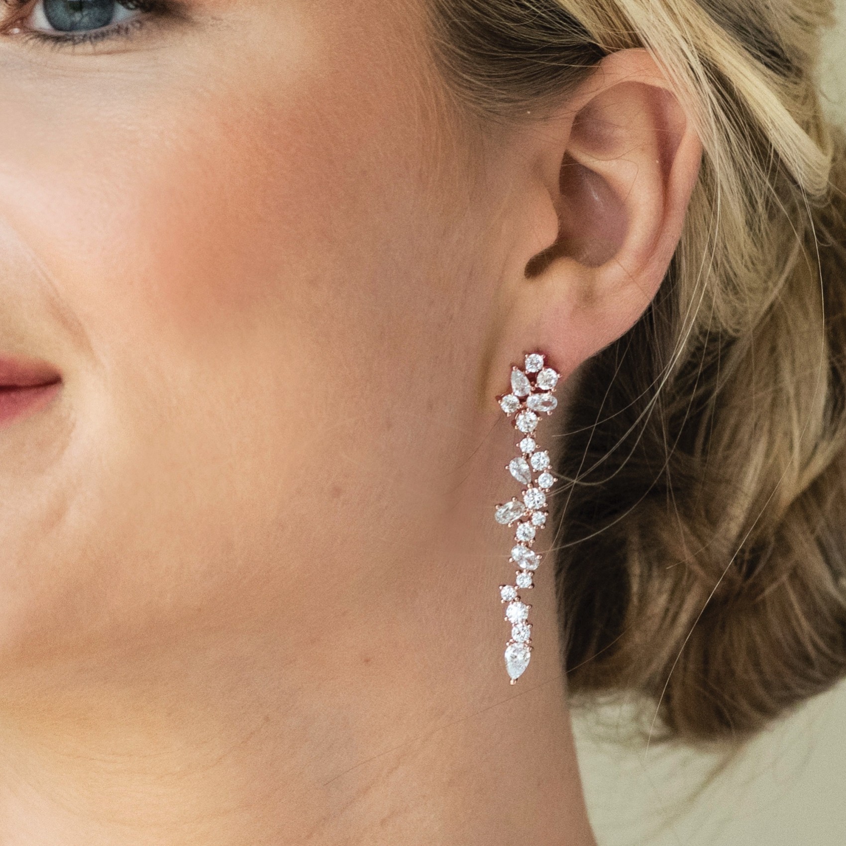 Statement rose gold earrings with plenty of sparkle have never been so popular! With our new Islington design we combine cutting edge designer styling and sparkling faceted crystals in a sophisticated cluster drop for maximum impact. This timeless design with a contemporary twist will add a striking element to any bridal look.