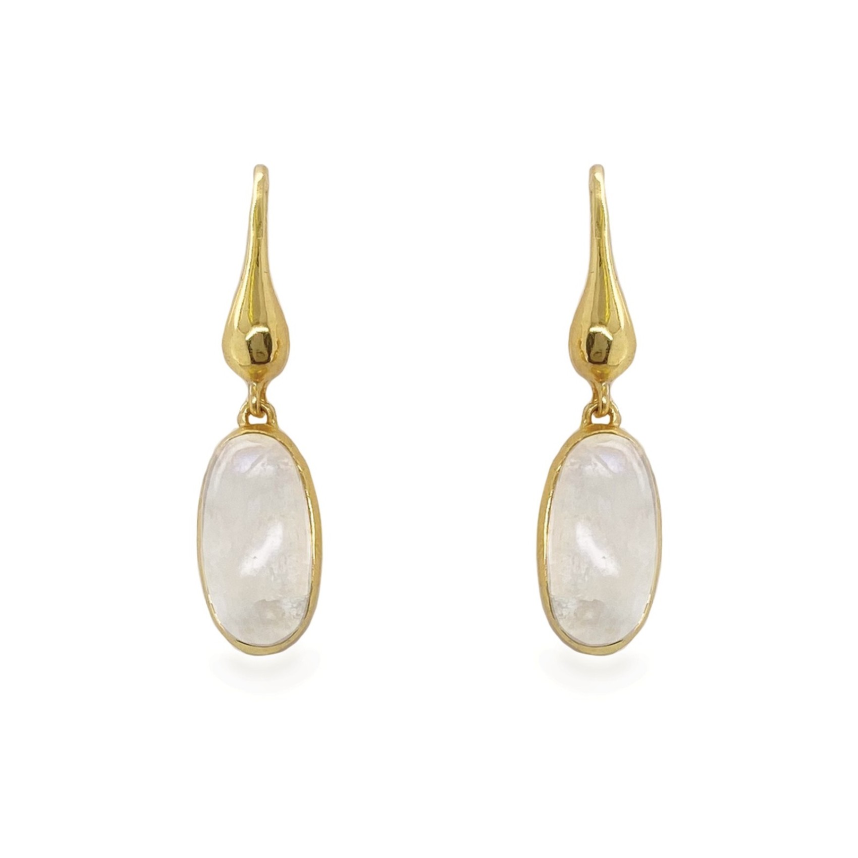 Attractive moonstone oval drop earrings with a modern-vintage feel. Handcrafted from 14ct gold plated brass featuring rainbow moonstone semi precious cabochons. Each gemstone is cut in beautiful facets and polished to bring out their natural beauty.