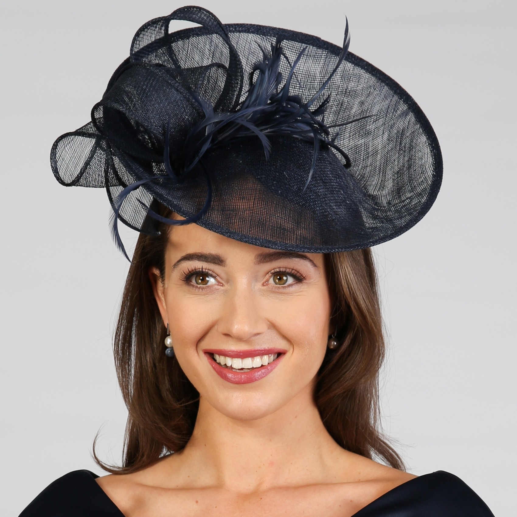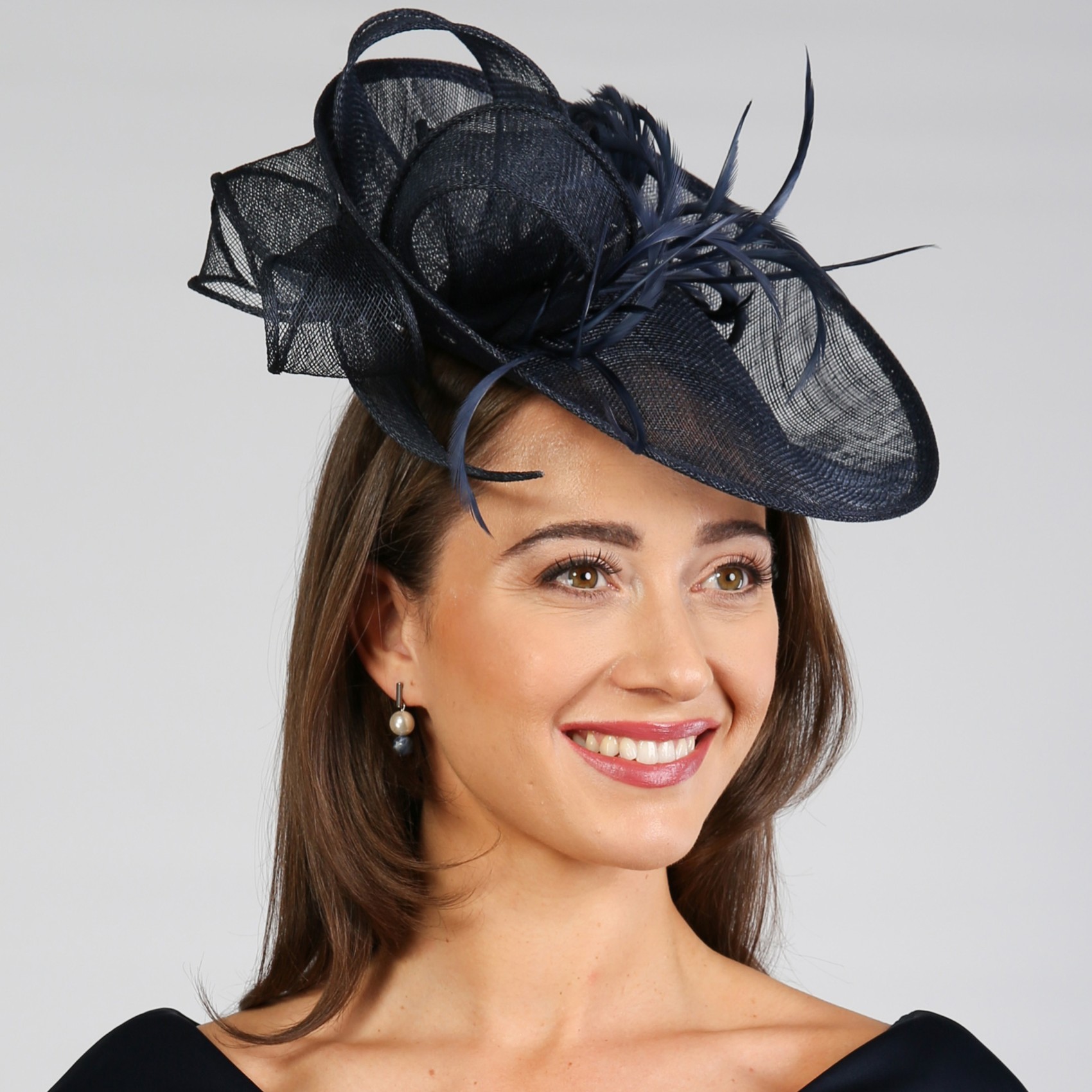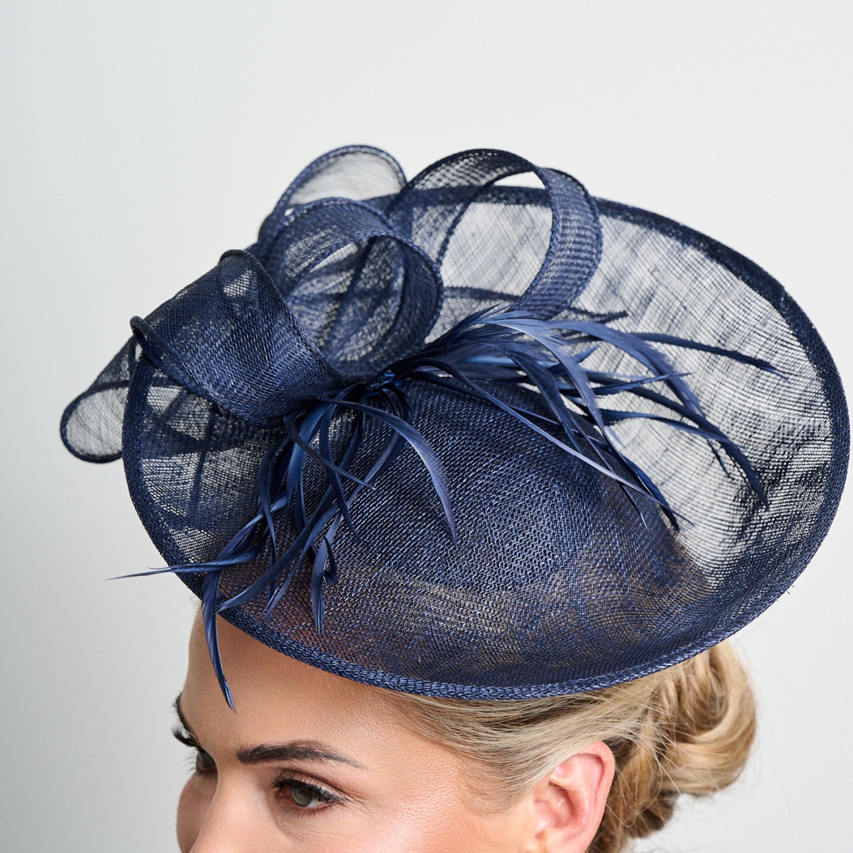 A stunning dark navy wedding fascinator crafted from a large, lightweight sinamay base decorated with delicate feathers and soft sinamay loops. A statement and elegant design this disk fascinator comes attached to a discreet, comfortable headband for ease of wear. From weddings to the races, this stylish navy hatinator is great for any special occasion. A flattering choice for a mother of the bride or groom this wedding fascinator will add the perfect finishing touch to your outfit.
