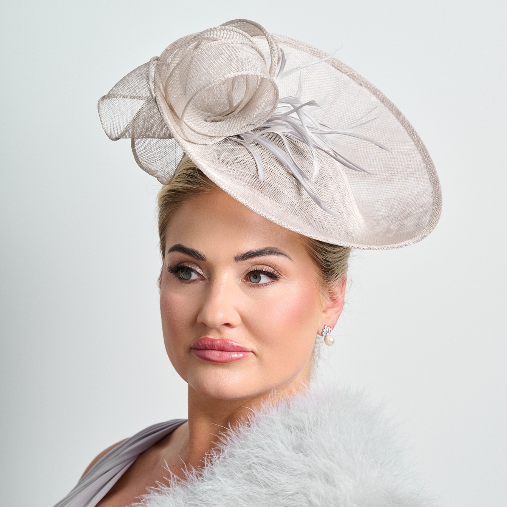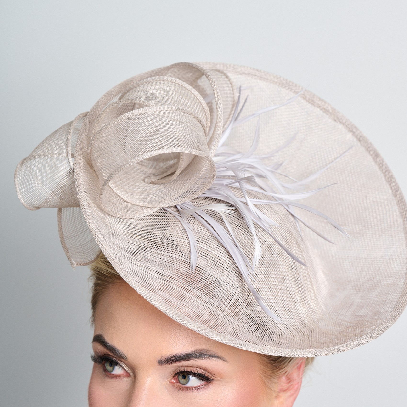 A stunning silver wedding fascinator crafted from a large, lightweight sinamay base decorated with delicate feathers and soft sinamay loops. A statement and elegant design this disk fascinator comes attached to a discreet, comfortable headband for ease of wear. From weddings to the races, this stylish silver gray hatinator is great for any special occasion. A flattering choice for a mother of the bride or groom this wedding fascinator will add the perfect finishing touch to your outfit.