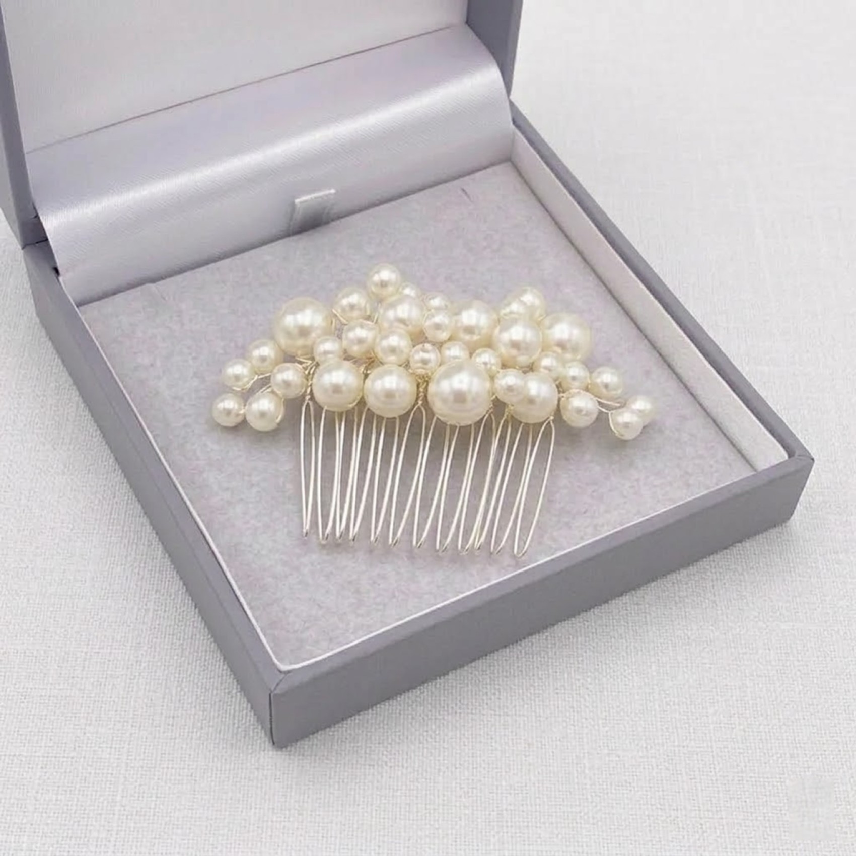 This dainty pearly comb adds the prettiest touch to wedding hair. Handcrafted with luminous multi size ivory pearls tuck this piece into the side of loose locks or a tousled bridal updo for an understated bridal look. A gorgeous hair accessory choice for bridesmaids, too!