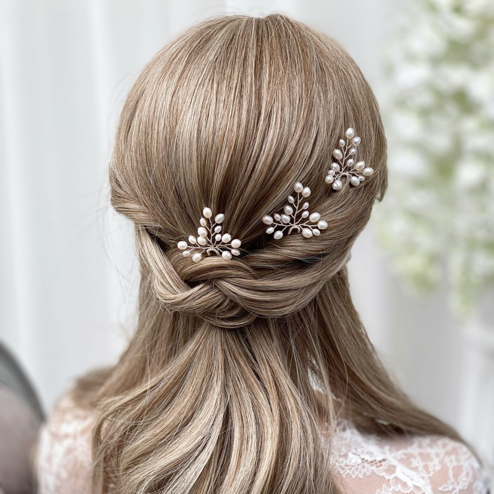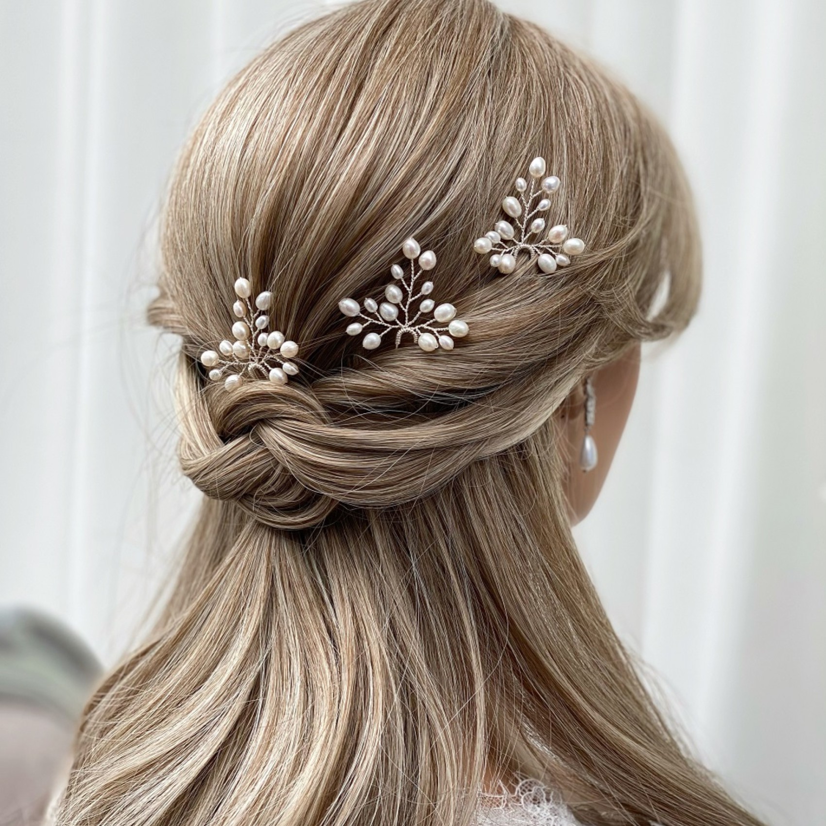 A beautiful freshwater pearl bridal hair pin handmade with delicate silver wire and luxury ivory pearls. Wear as a set of 3, a pair or alone to lend the prettiest pearly accent to wedding hair. A lovely choice for both brides and bridesmaids!
