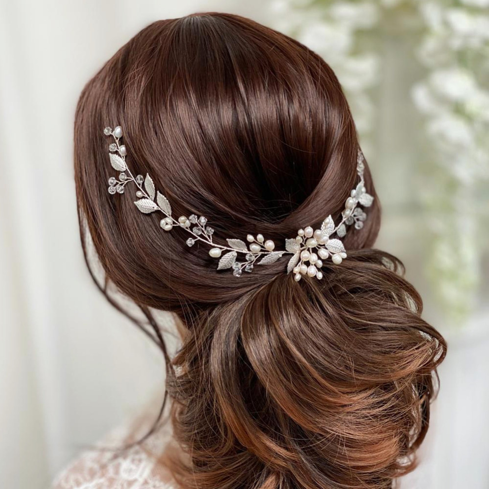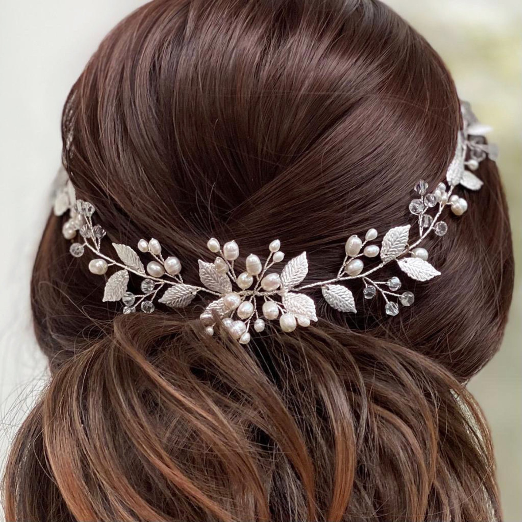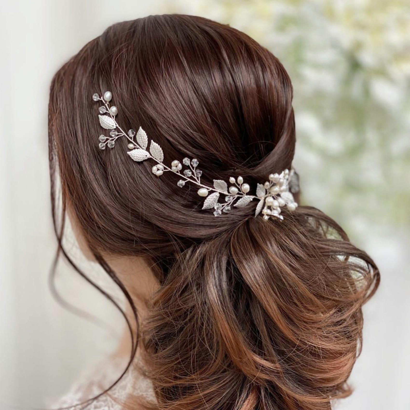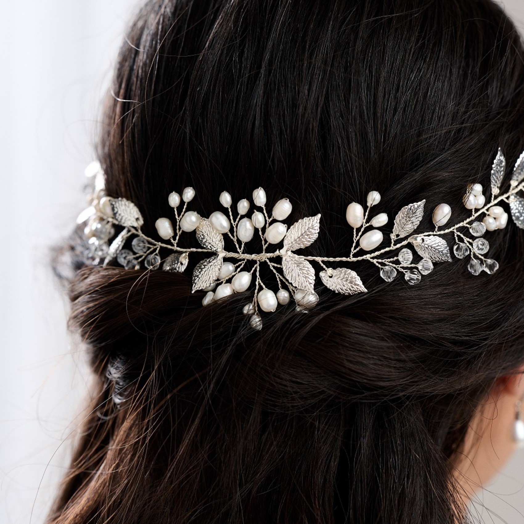 This beautiful wedding hair vine with delicate silver leaves, freshwater pearl buds and shimmering crystal adds a soft bohemian vibe to bridal tresses. The perfect headpiece for a woodland wedding this vine is lightweight and flexible making it incredibly versatile for different hairstyles. We love this piece styled at the back in a low bridal updo. Team with a cascading cathedral veil for an ethereal wedding look. Secures into the hair with pins.