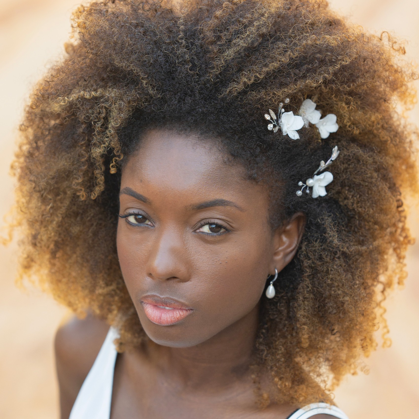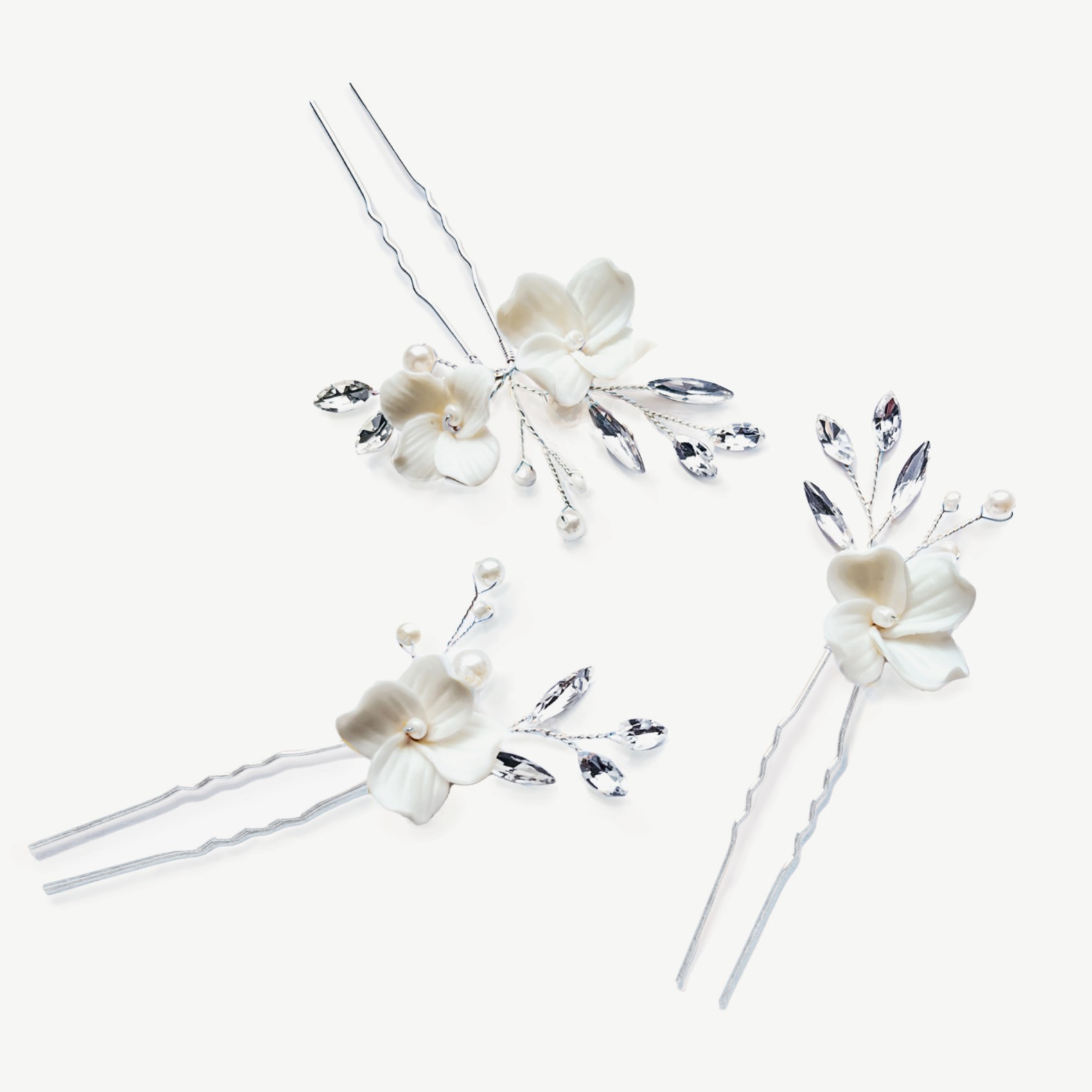 Wedding hair pins are really popular this season, and these are so pretty and with delicate boho styling. Featuring gorgeous hand sculpted ceramic flowers, accented with twinkling Austrian cut crystals and dainty ivory pearls. The pins come as a set of 3, with a small, medium and large flower design.