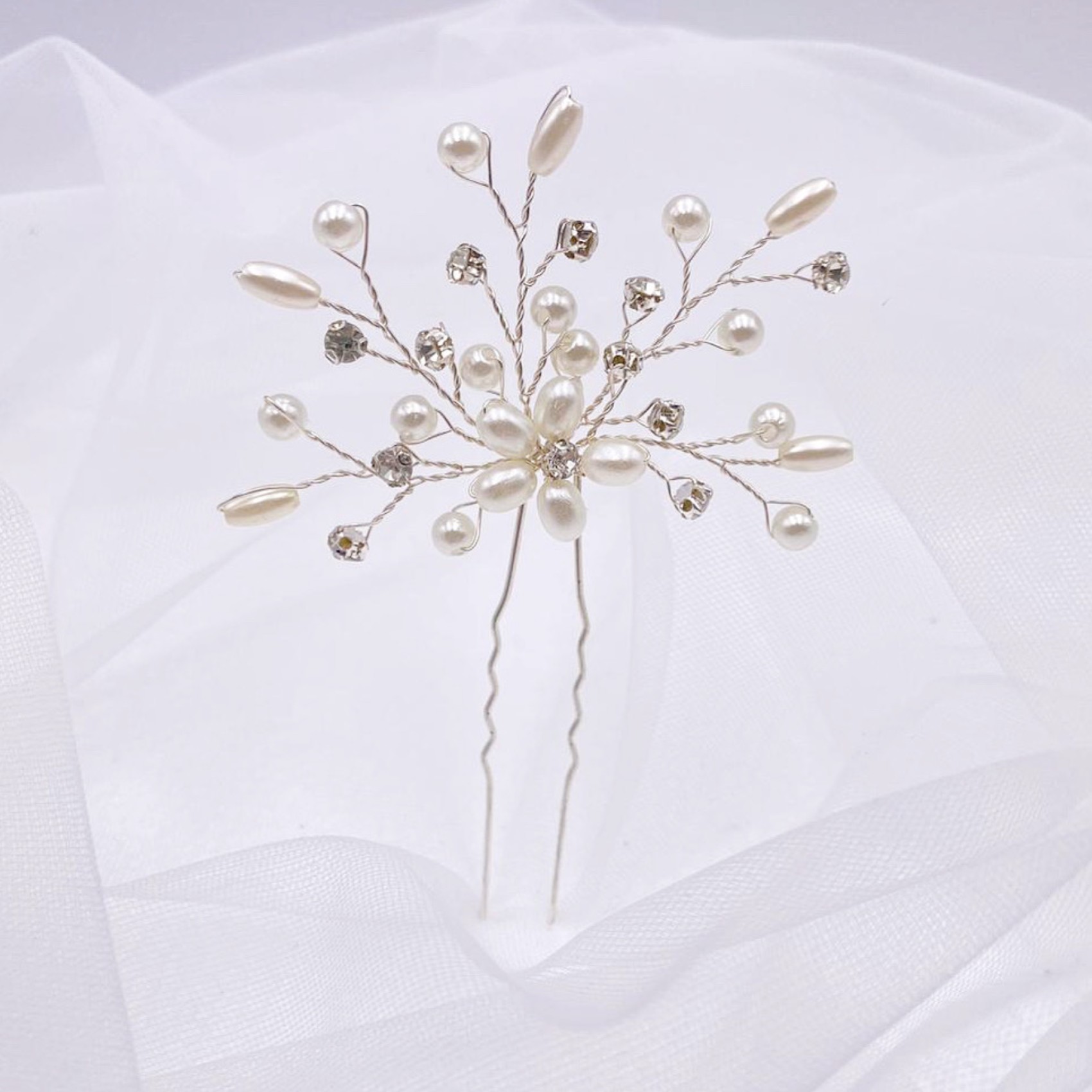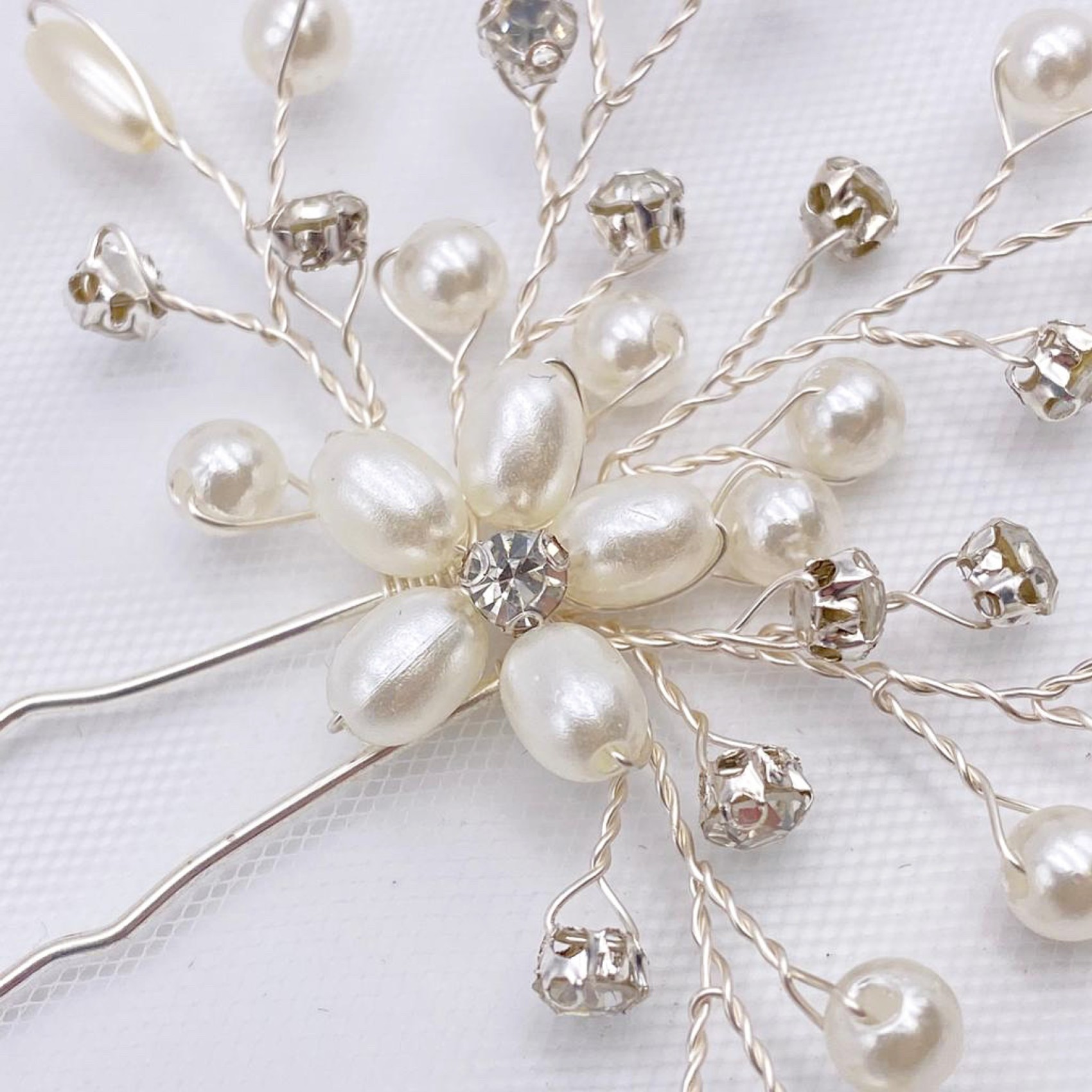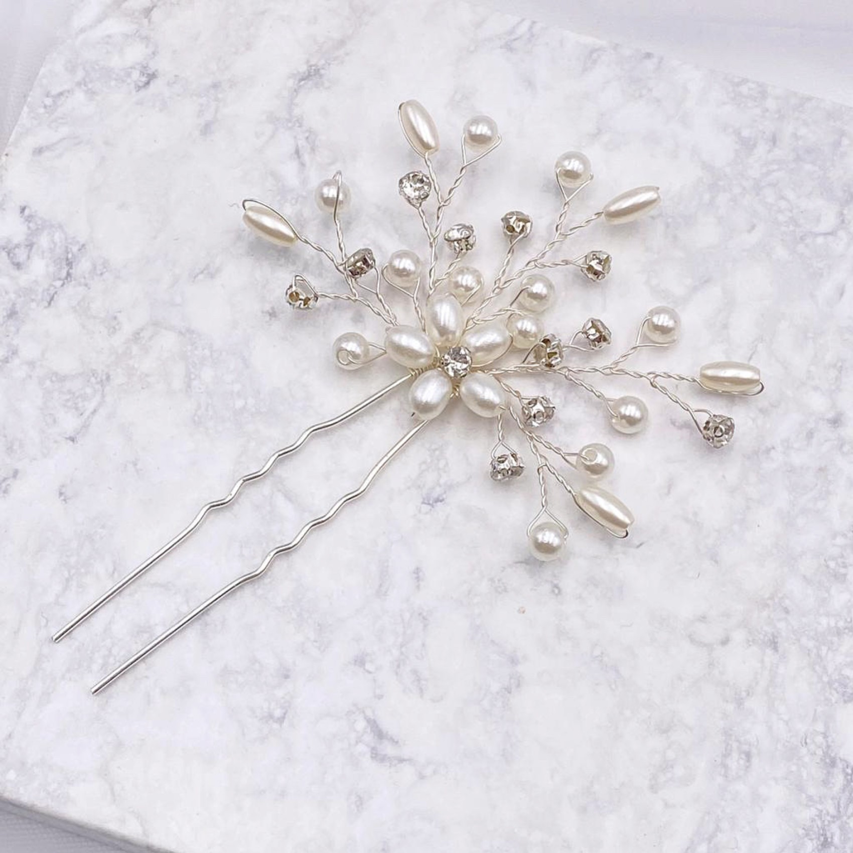 Delicate sprigs of ivory pearls and twinkling solitaires stem from a pretty pearl flower in this gorgeous wedding hair pin. Featuring a mix of round and seed pearls for the prettiest effect nestle this gorgeous hair pin in the side of a tousled updo for a dainty addition to your wedding hairstyle. Perfect for both brides and bridesmaids!