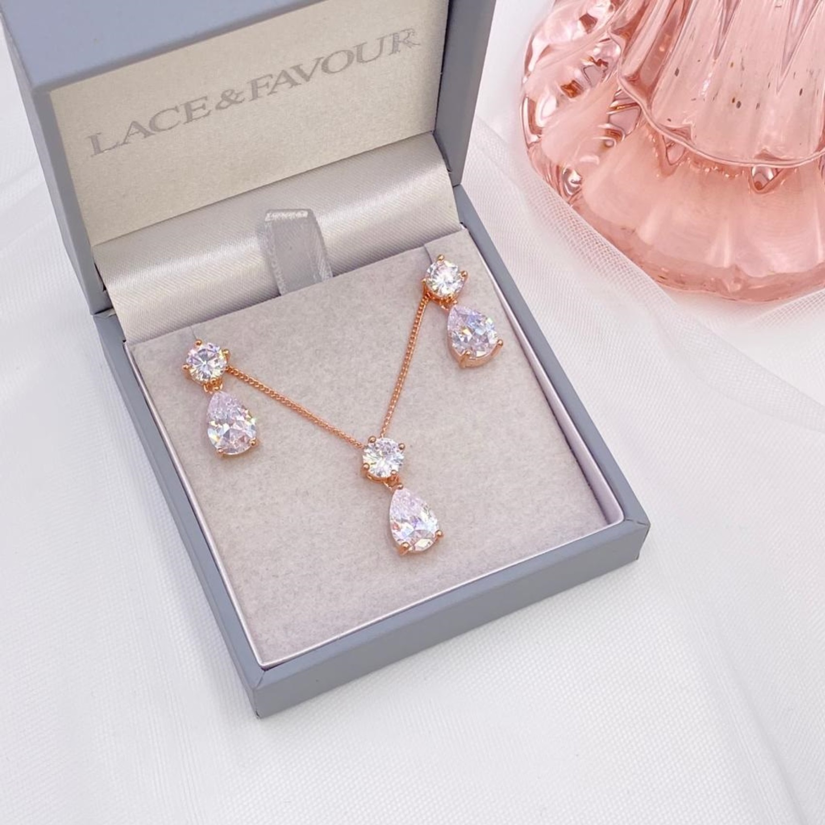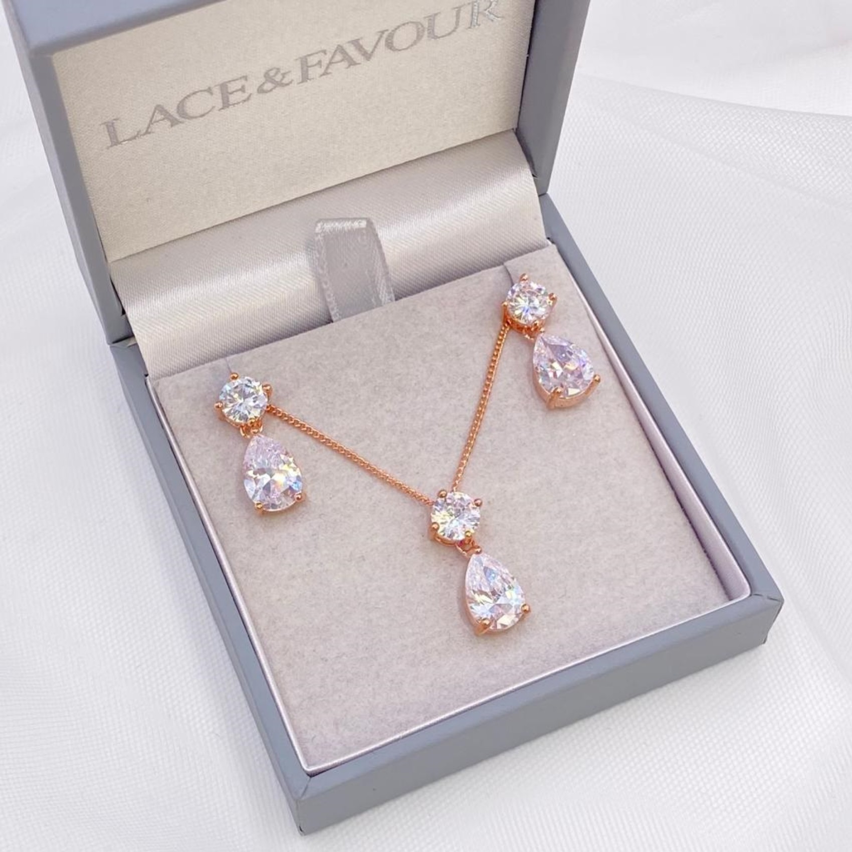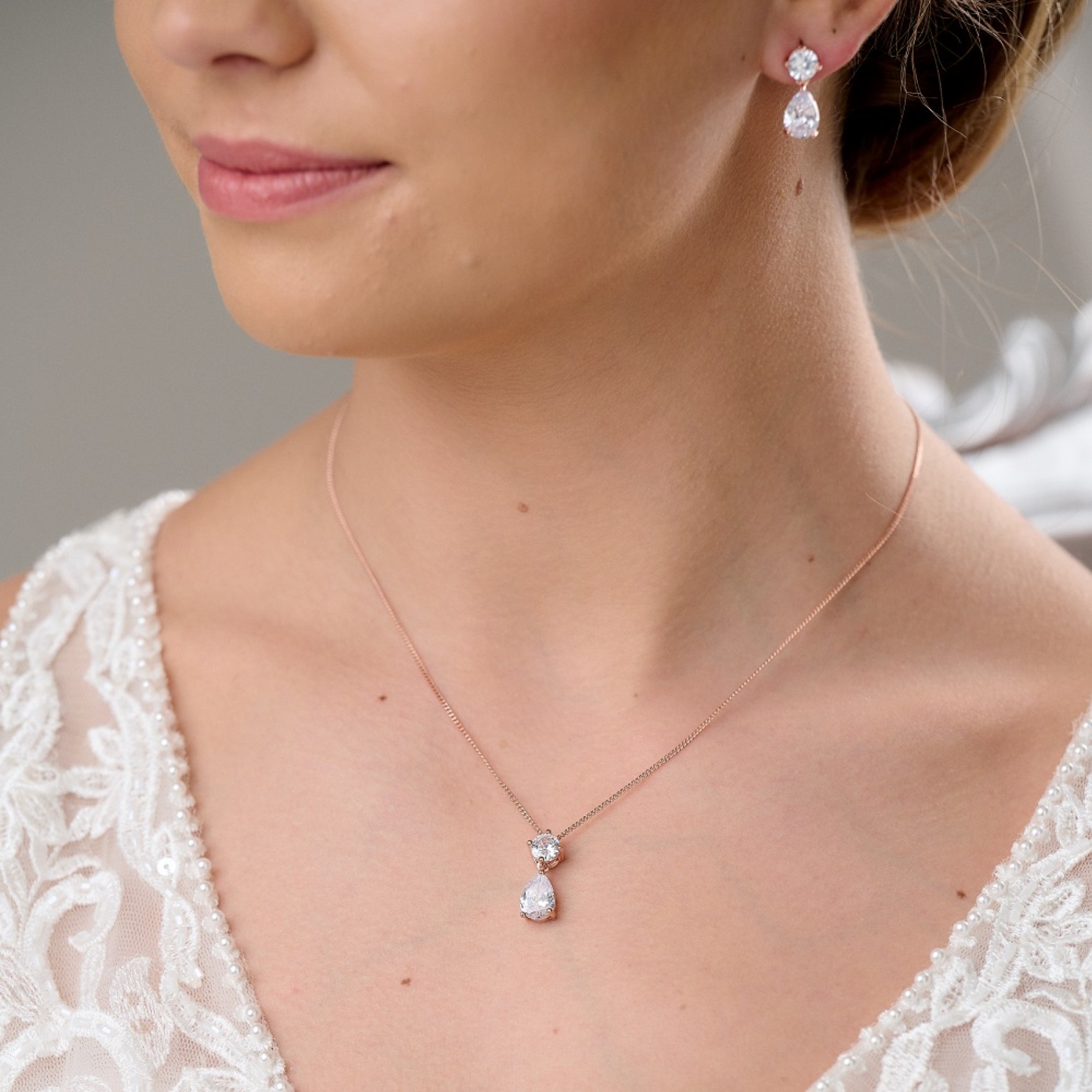 A timeless rose gold wedding jewelry set featuring dainty crystal teardrop earrings and a matching pendant. Embellished with glistening cubic zirconia crystals this dainty wedding jewelry set is perfect for a classic bridal look. This pretty gold jewelry also makes a gorgeous bridesmaid gift.