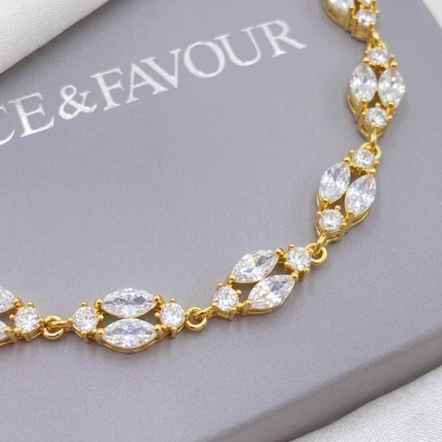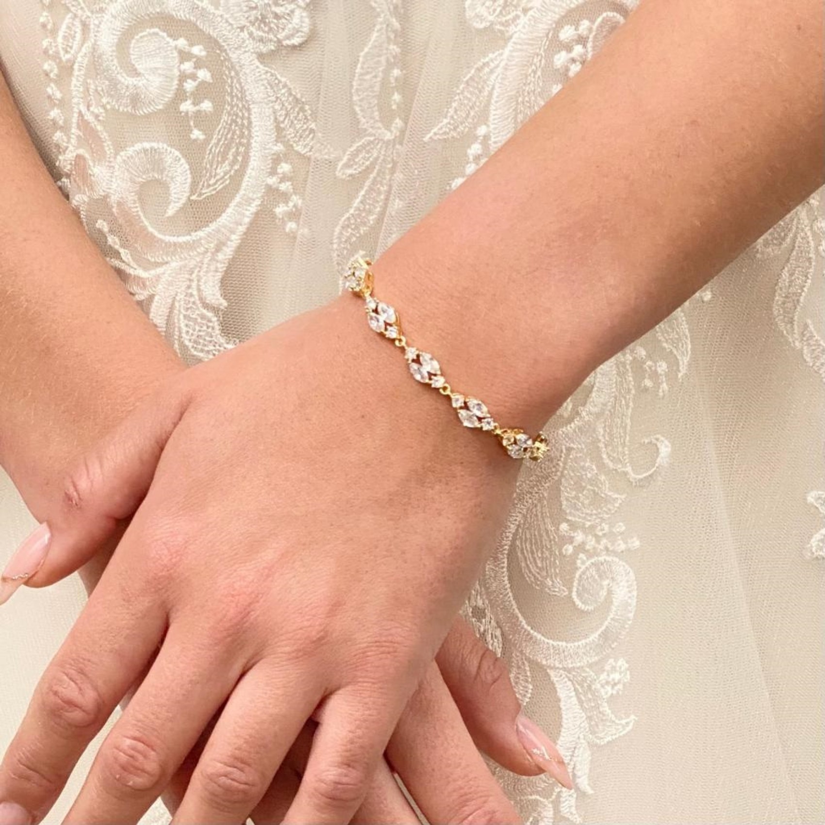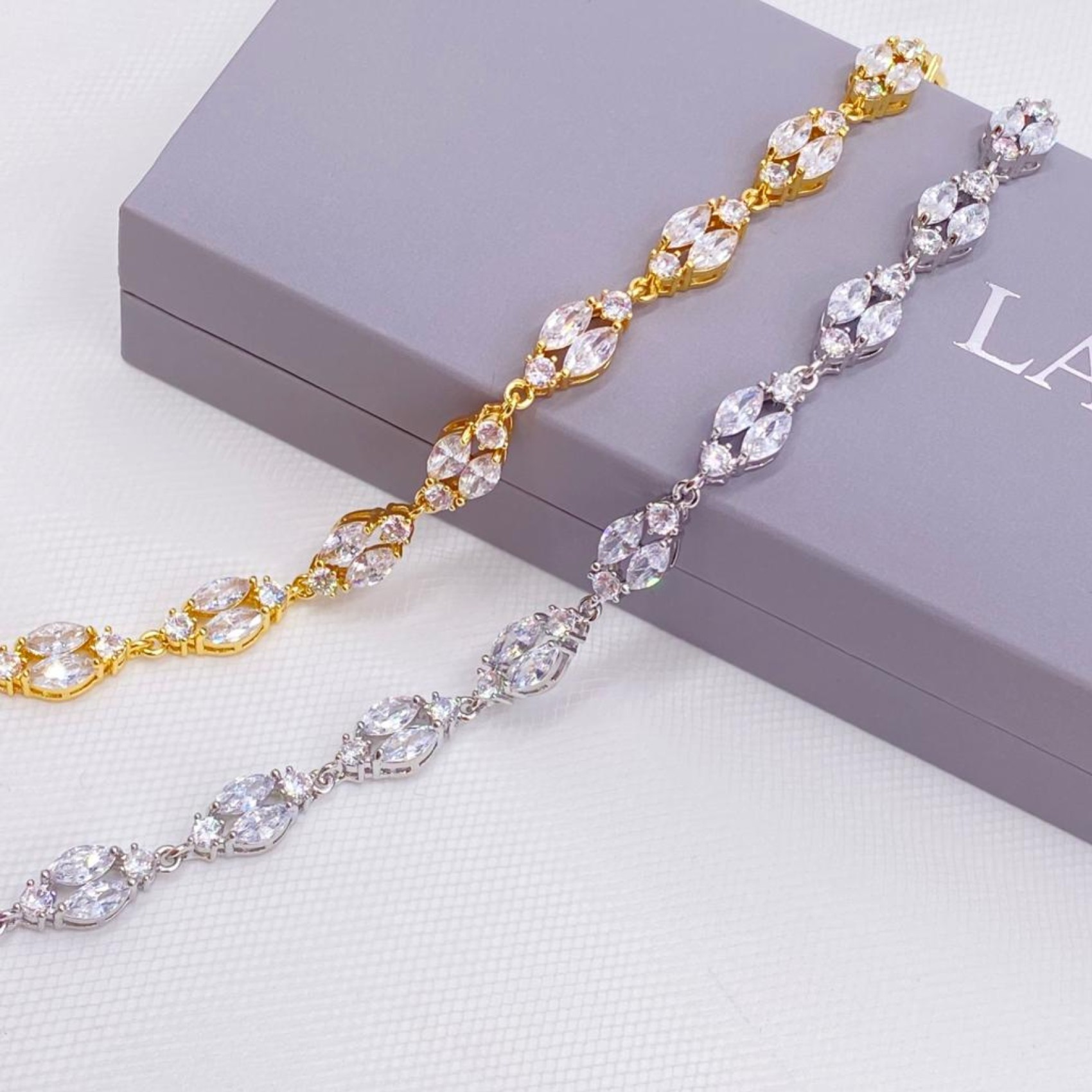 Our new Berkley bracelet adds sopshitcated sparkle to the wrist. A slender design adorned with CZ marquise crystals and dainty solitaires this beautiful bracelet teams brilliantly with a with a wide range of our wedding earrings. A polished piece of jewelry for brides or bridesmaids.