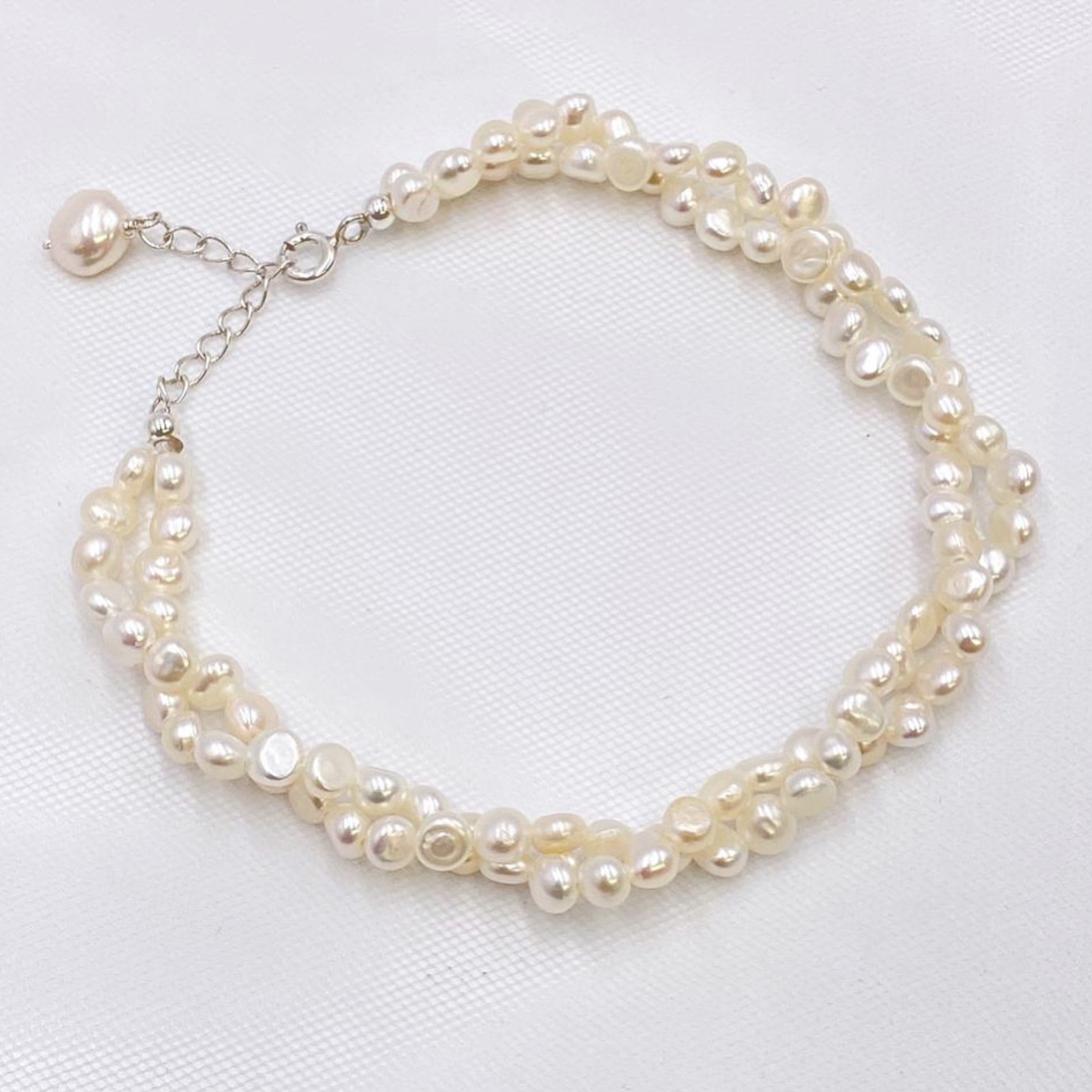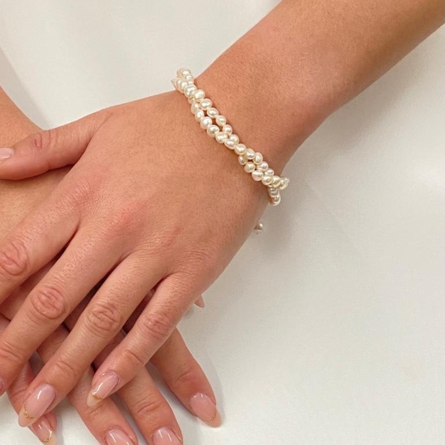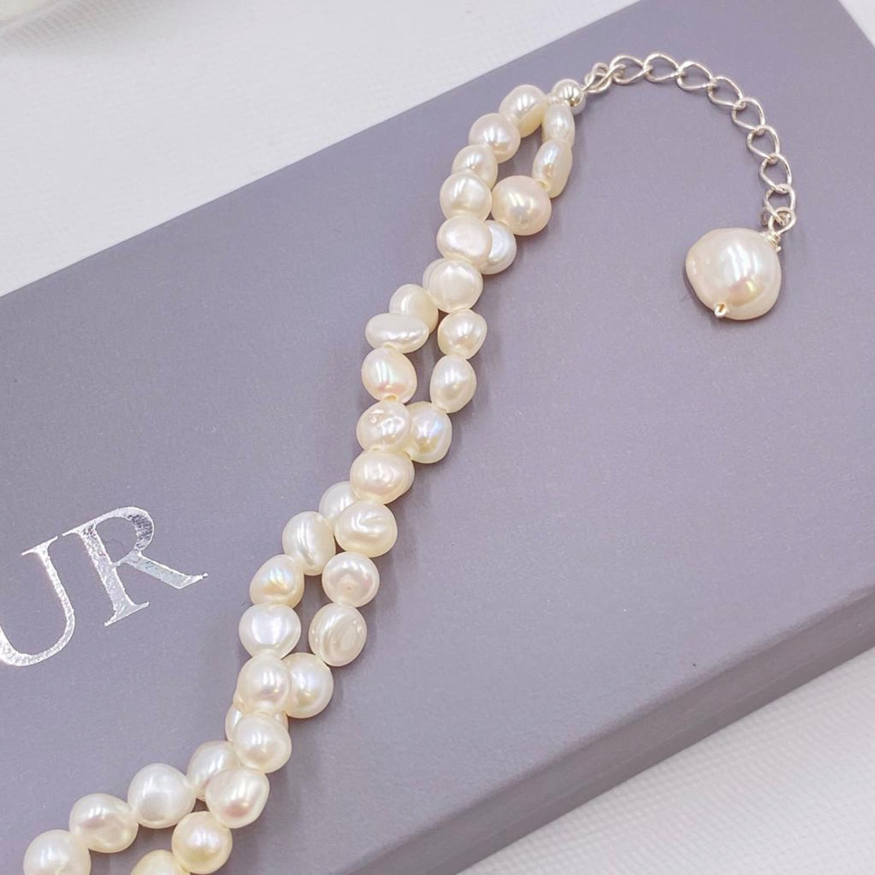 An attractive pearl wedding bracelet made up of two twisted strands of dainty ivory freshwater pearls the design fastens with a silver clasp and is finished with a delicate extension chain. A stunning choice for a romantic destination wedding wear this pretty piece with freshwater pearl earrings for a gorgeous bridal look.