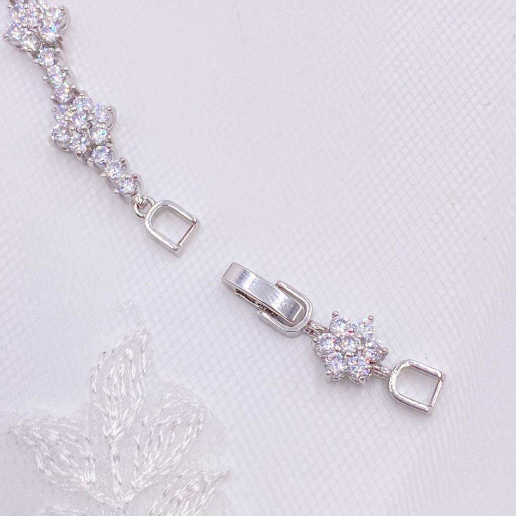 Add a touch of floral sparkle to your bridal look with this elegant CZ wedding bracelet. Featuring dainty crystal embellished flowers linked by a single row of twinkling solitaire stones. Made with high quality cubic zirconia crystals in rhodium plated settings this piece has a sophisticated sparkle that's both pretty and subtle. Comes with an optional extension chain.