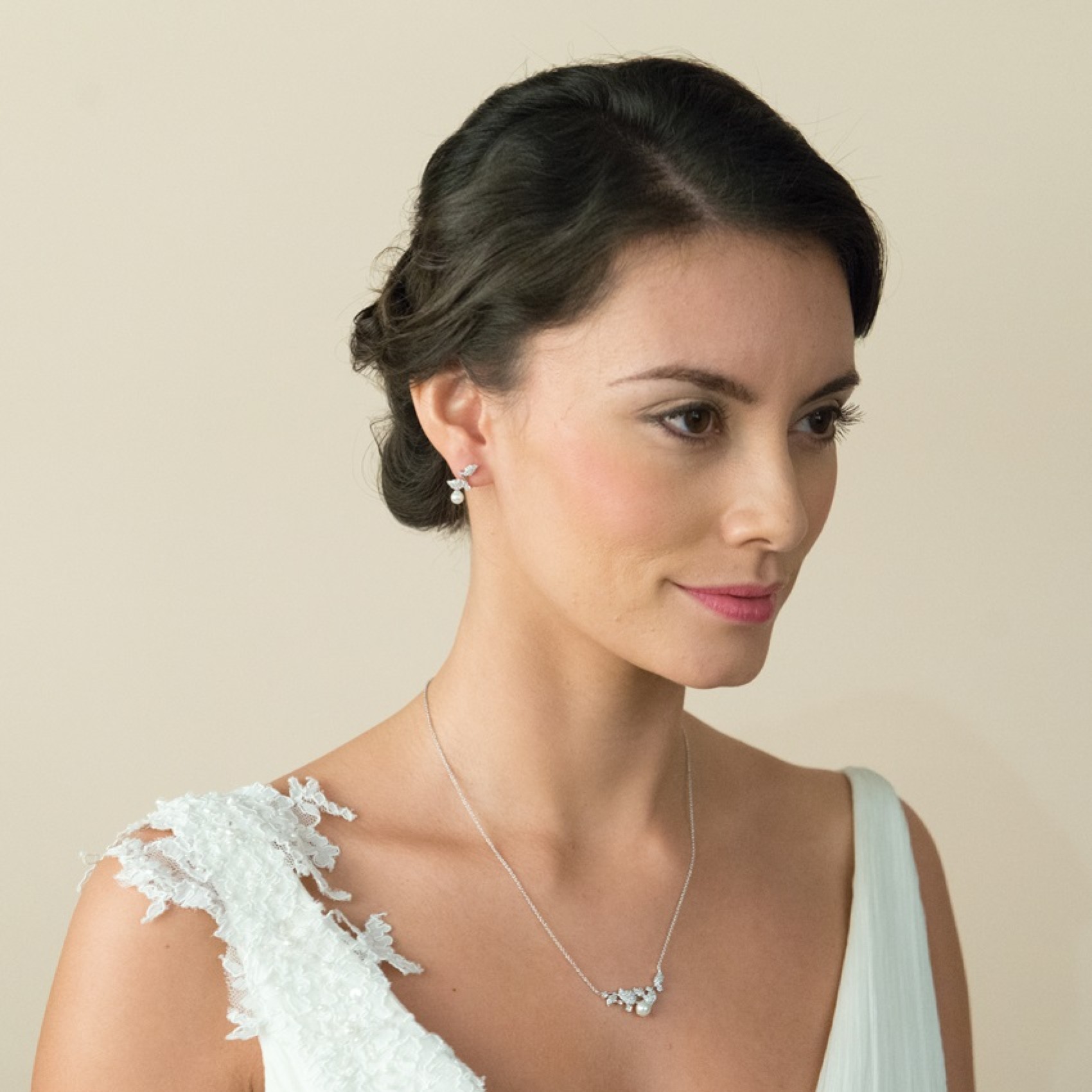 A beautiful crystal and pearl wedding necklace inspired by the beauty of nature. Featuring a single ivory pearl nestled beneath a delicate curved vine of leaves, embellished with tiny CZ crystals for a subtle shimmer. A pretty and romantic choice this contemporary pendant necklace is perfect for brides and bridesmaids alike.