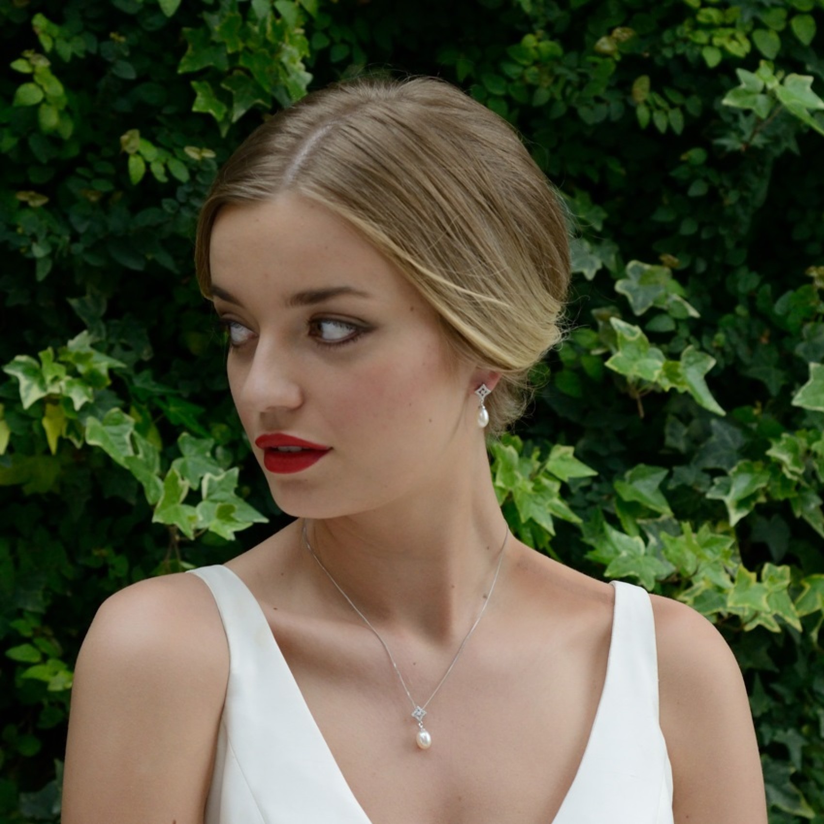 Beautiful and sophisticated Morocco pendant necklace by Ivory and Co. A single ivory pearl drop hangs below a petite diamond of shimmering pave set stones with one glistening solitaire stone in the center. The distinctly Moroccan-inspired design adds an edge to this classic pearl pendant and makes a stunning complement to a 1920's bridal look.