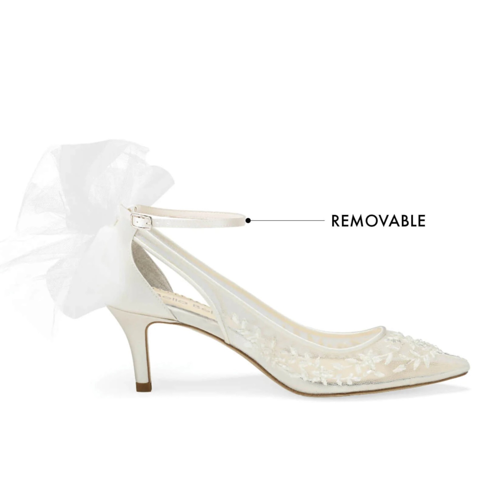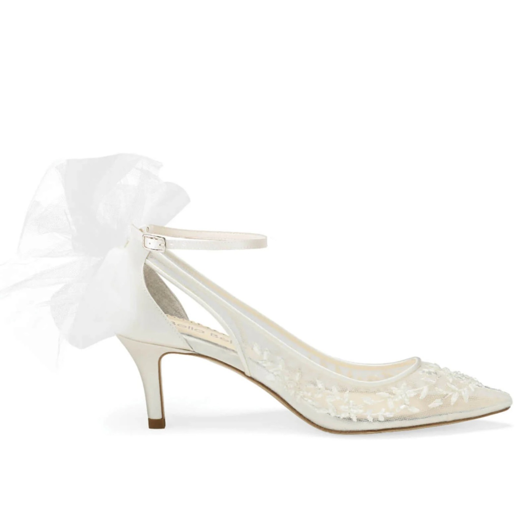 The Bella Belle Esther bridal shoe blends comfort and elegance in a 2.5-inch ivory mesh lace kitten heel. A removable tulle bow and an optional ankle strap make these beautiful lace kitten heels easily customized to suit your wedding look. Hand-beaded floral lace adds a romantic touch, while the low-cut vamp hugs your foot for a slimming, flattering fit.
