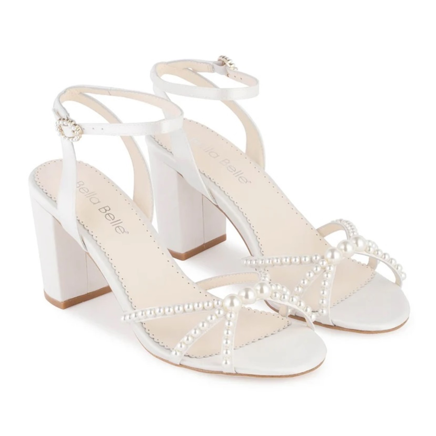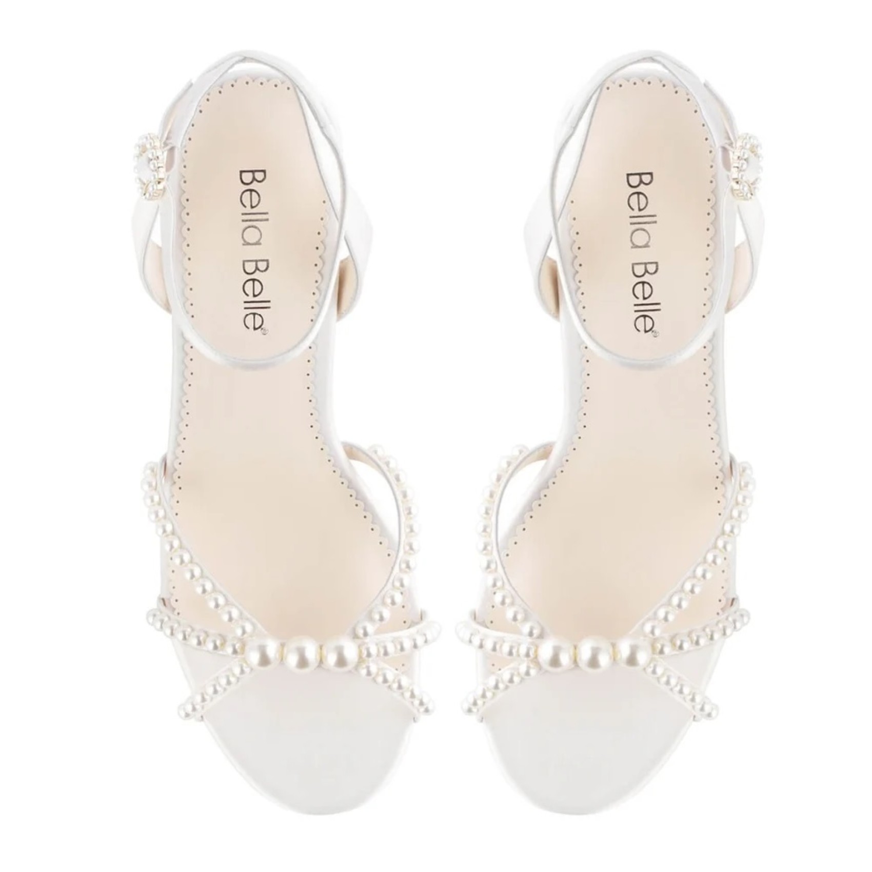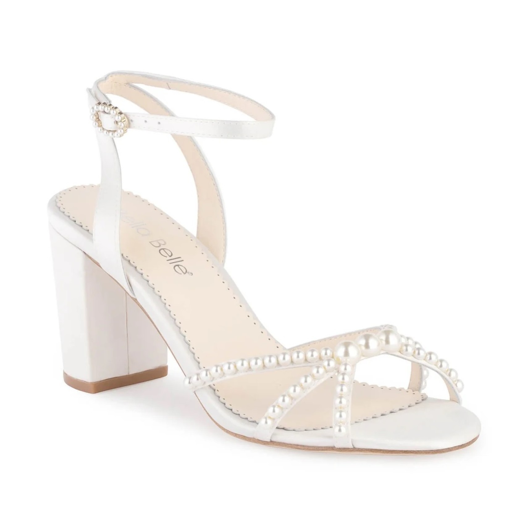 The Bella Belle Lilia bridal shoe is a 3-inch ivory pearl block heel sandal made for brides who want to feel bold, beautiful, and secure. Pearl-lined caged straps form an elegant open toe, perfect for showing off your pedicure. The ankle straps and matching pearl buckles offer stylish support draped in luxury. With its sturdy heel and exquisite detailing, these pearl strappy heels are made for brides who want glamor without sacrificing comfort.