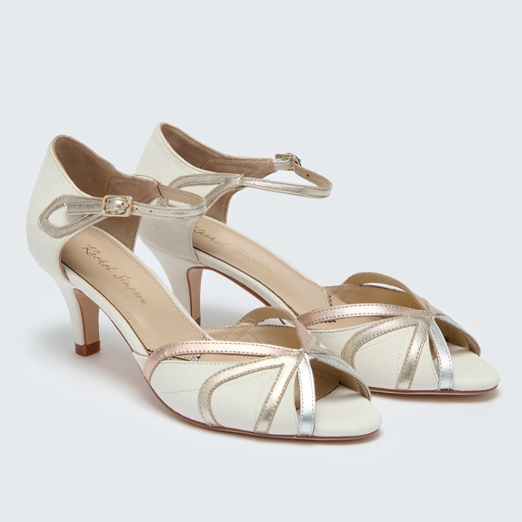 Introducing Connie, the perfect fusion of vintage charm and modern elegance, with a distinctly Rachel Simpson signature style. Crafted from soft ivory suede, the delicate teardrop shaped straps in mixed metallic leathers—gold, silver, and rose gold—create a beautifully unique and eye-catching detail. Sitting on a perfectly balanced 60mm heel, Connie offers exceptional comfort and support, ensuring you can glide effortlessly from day to night. A timeless choice for your wedding, special occasion or to simply add a touch of elegance to your wardrobe.
