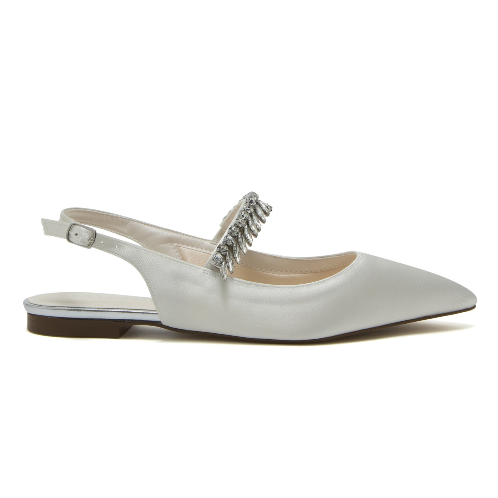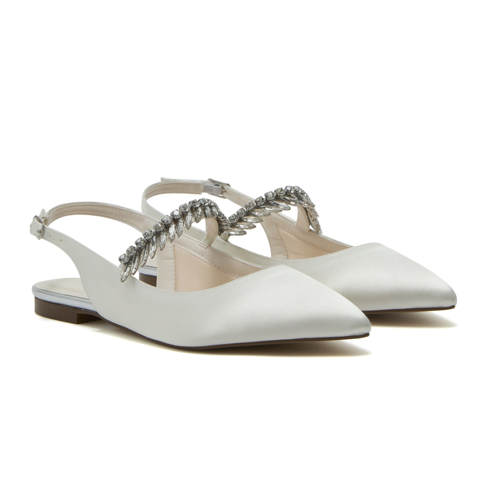 Taking a simple slingback pump and adding some statement sparkle, the Freya Flats are a stylish new pair of wedding shoes in the Rainbow Club 2025 bridal collection. Beautifully-crafted from lustrous ivory satin, they have pointed toes, are embellished with silver crystal diamante detail across the foot and have buckled slingbacks. A contemporary take on a classic shape, these elegant flat wedding shoes have the glamor factor.