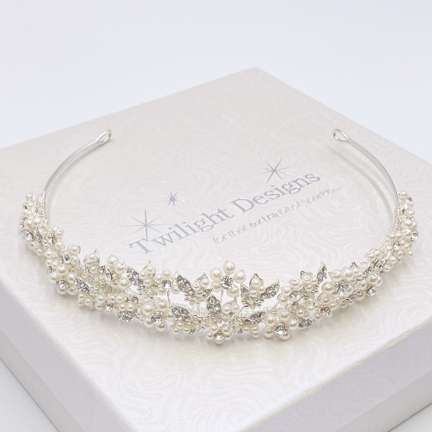 Floral and feminine this gorgeous bridal tiara is delicately detailed with dainty ivory pearls and crystal embellished leaves for pretty sparkle. Wear with a beautiful bridal updo for a classic look or team with loose curls for a more relaxed feel.