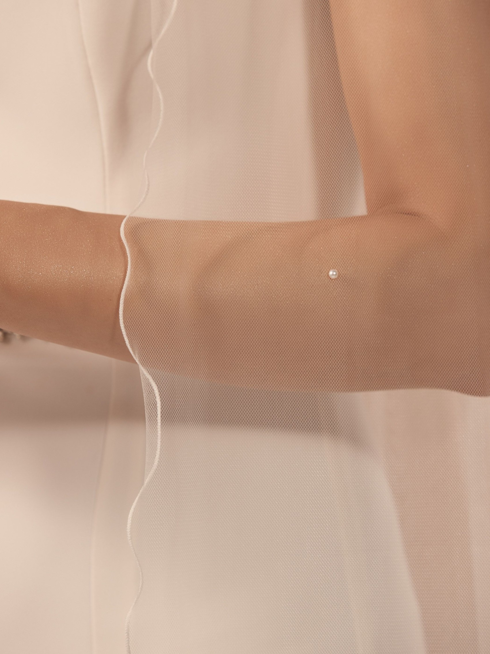 A simple yet attractive single tier wedding veil for the understated bride. Made from a single layer of soft ivory tulle this veil is lightly scattered with 33 pearls and finished with a corded edge.