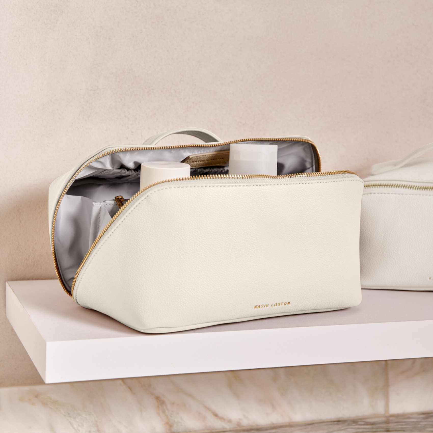 Level up your get-ready routine with Katie Loxton's Large Makeup And Wash Bag in Off White. Its zip-around closure allows effortless access to your belongings, while its wipeable lining means there's no need to worry about spillages. Designed for makeup enthusiasts, this bag lays flat on any surface, revealing centre dividers and pockets for seamless organisation. It's the perfect blend of style and function!
