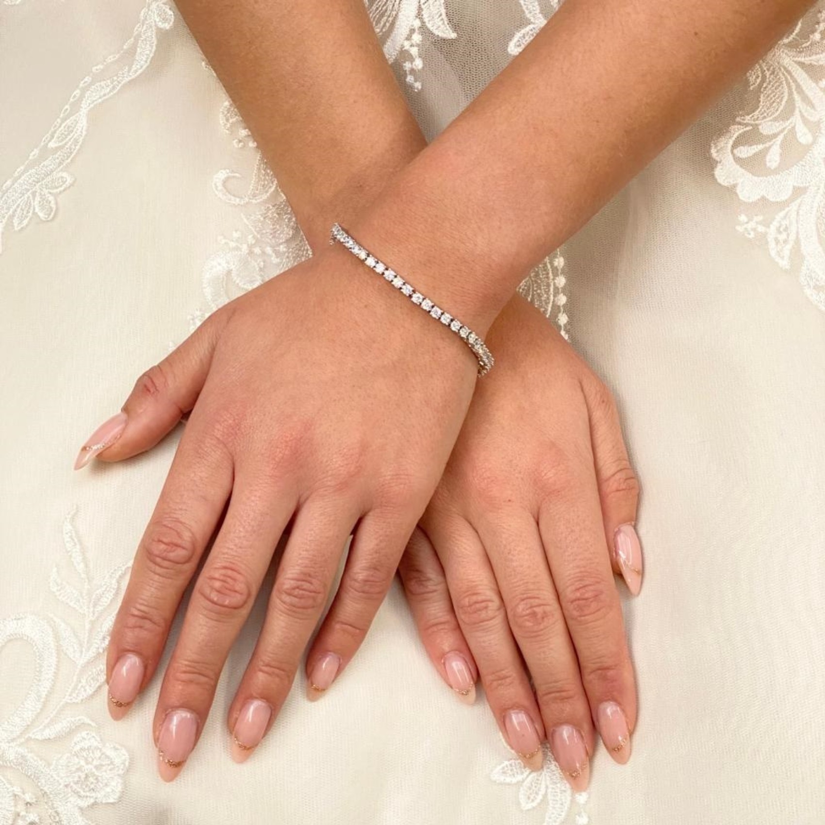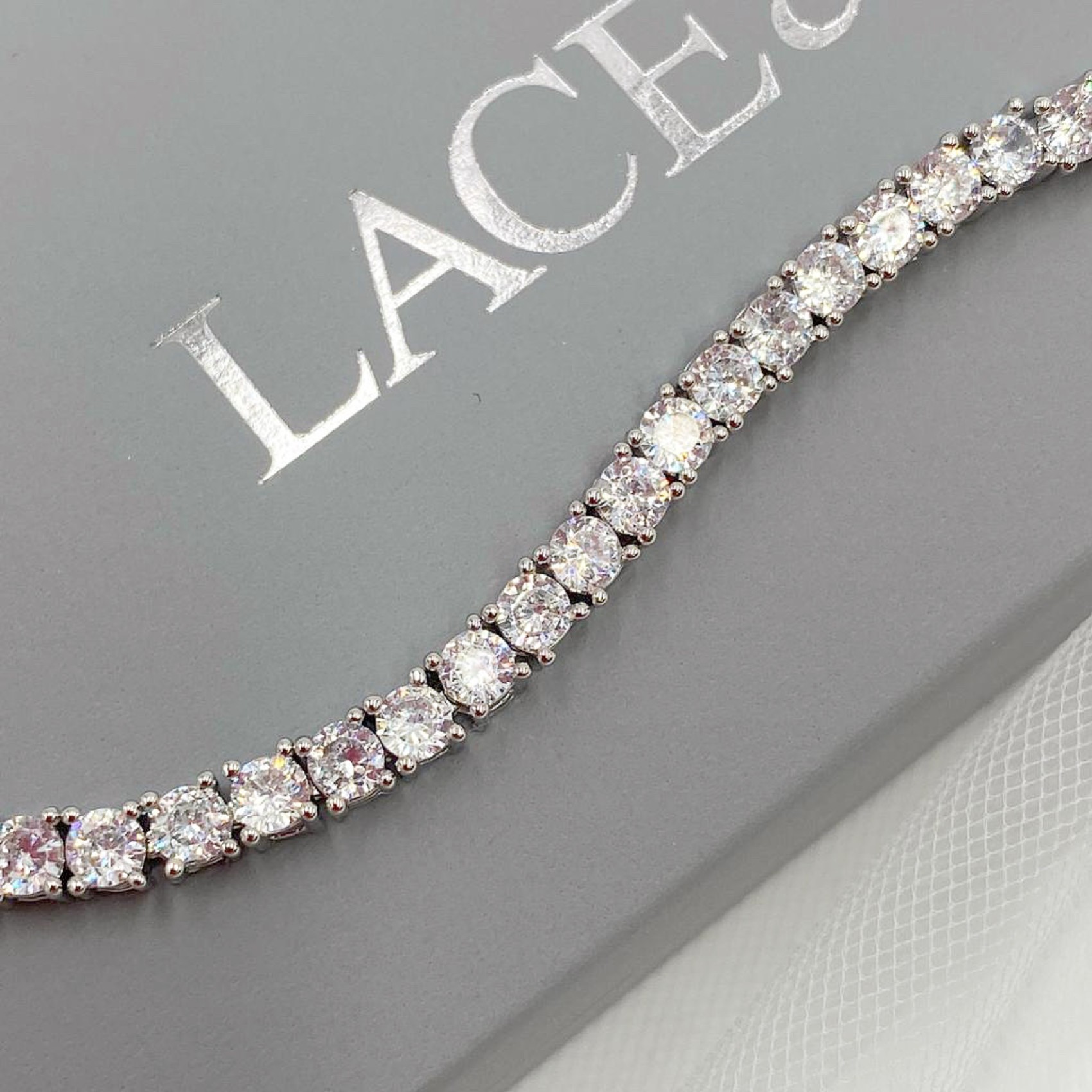 A delicate line of twinkling cubic zirconia crystals encircle the wrist in this slim silver tennis bracelet. A dainty and elegant choice for brides and a stunning jewellery gift for bridesmaids too.