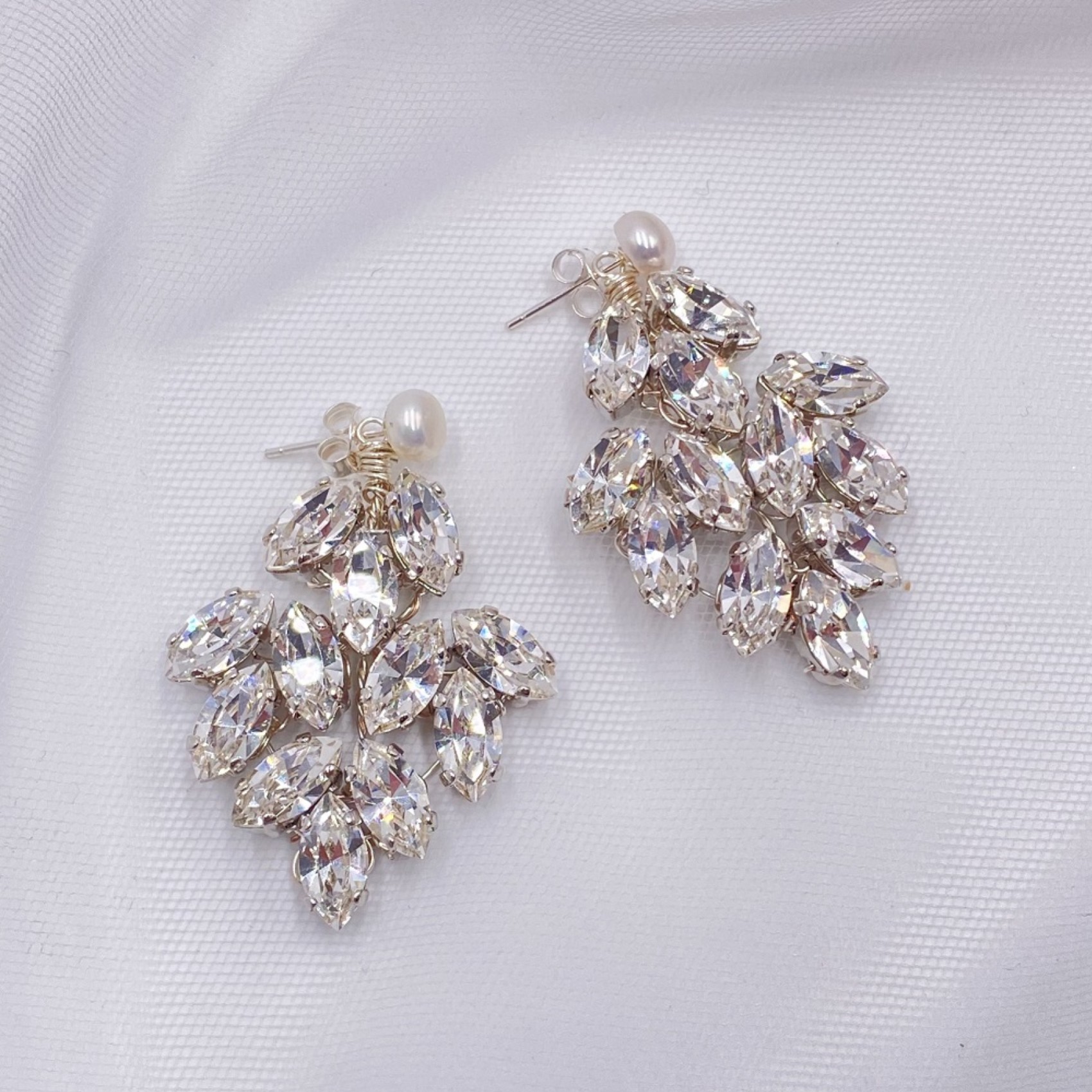 Clusters of Swarovski crystal give every bride the sparkling statement on their special day. Detachable fitting leaving single freshwater pearl studs to wear for any occasion. These crystal chandelier earrings are the perfect match to our Radiance headpiece.