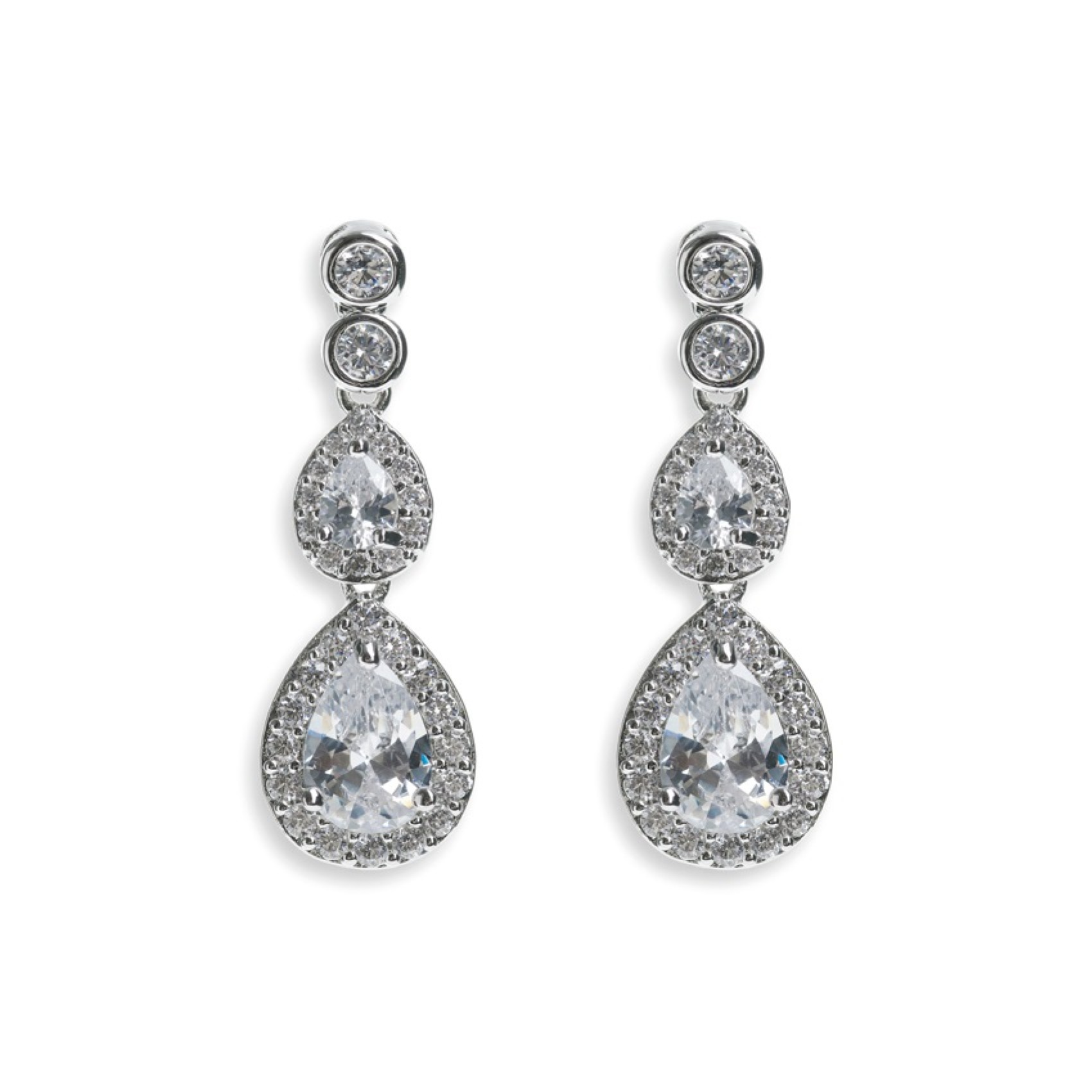 Elegant and timeless crystal drop earrings by award-winning bridal label Ivory and Co. Featuring a duo of small encased cubic zirconia crystals suspending a drop of two teardrop crystals, each trimmed with twinkling pave set crystals. These mid-sized drop earrings imbue a subtle amount of sparkle and are a beautiful complement to a classic or vintage-inspired bridal look.