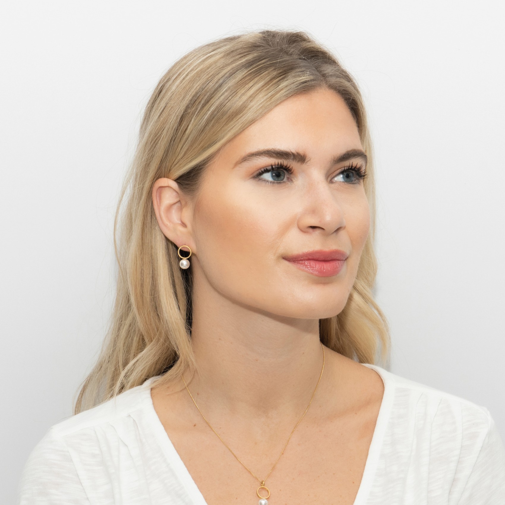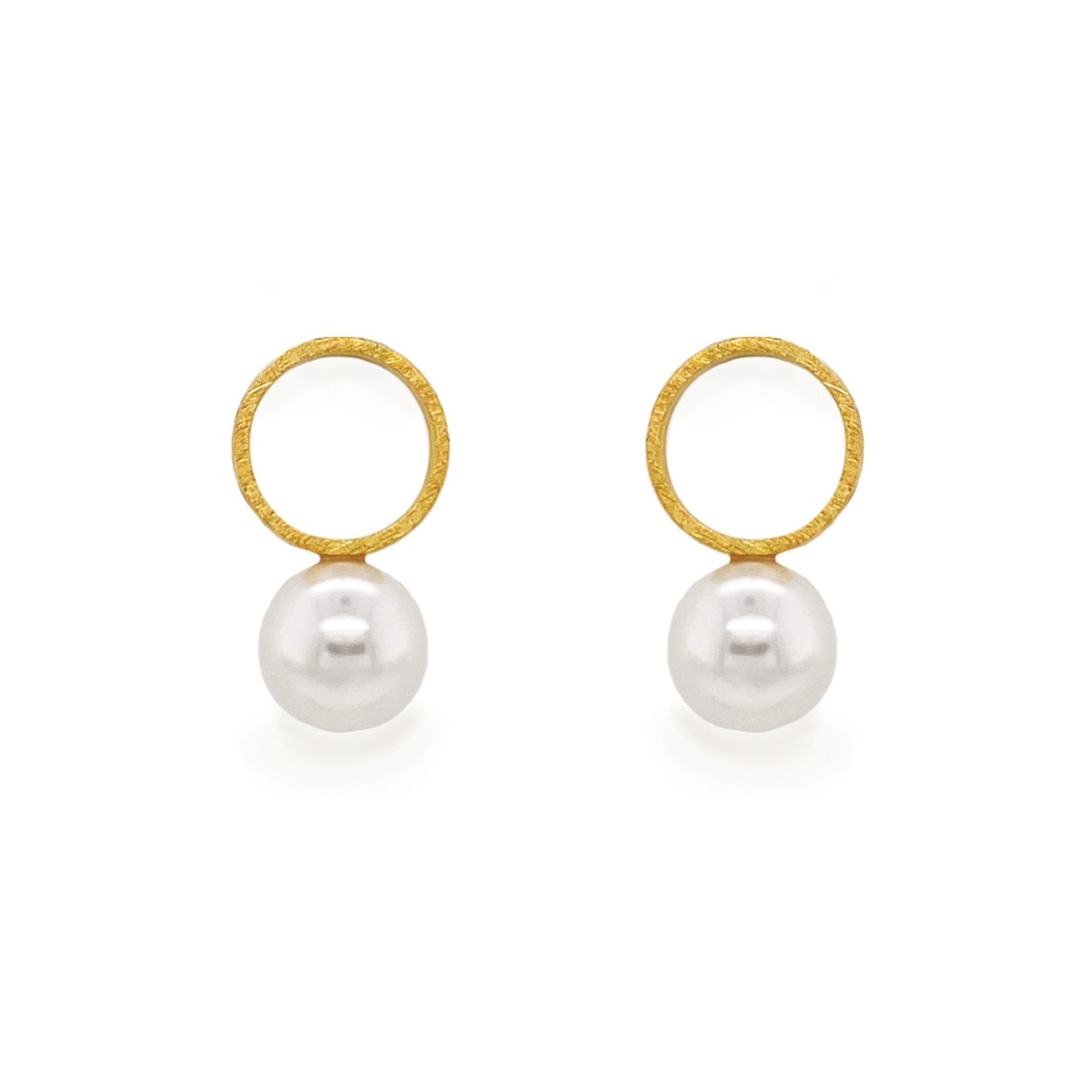 Contemporary chic circle design pearl earrings by Sarah Alexander. Stunning in their simplicity this timeless pair are set in 14ct gold plated vermeil on sterling 925 silver in a brushed effect finish. Featuring lustrous pearls in natural ivory these earrings are an elegant choice for brides and bridesmaids alike.