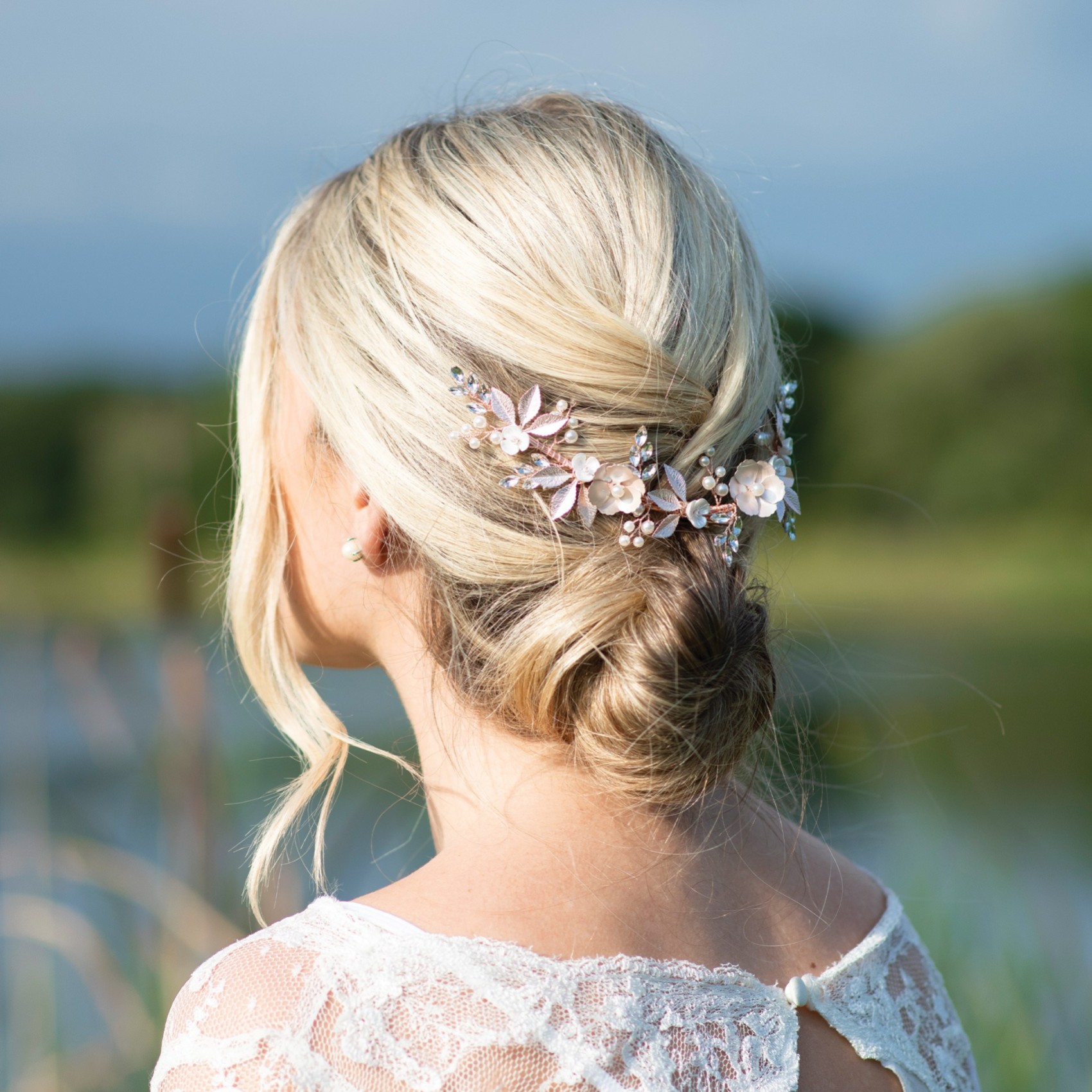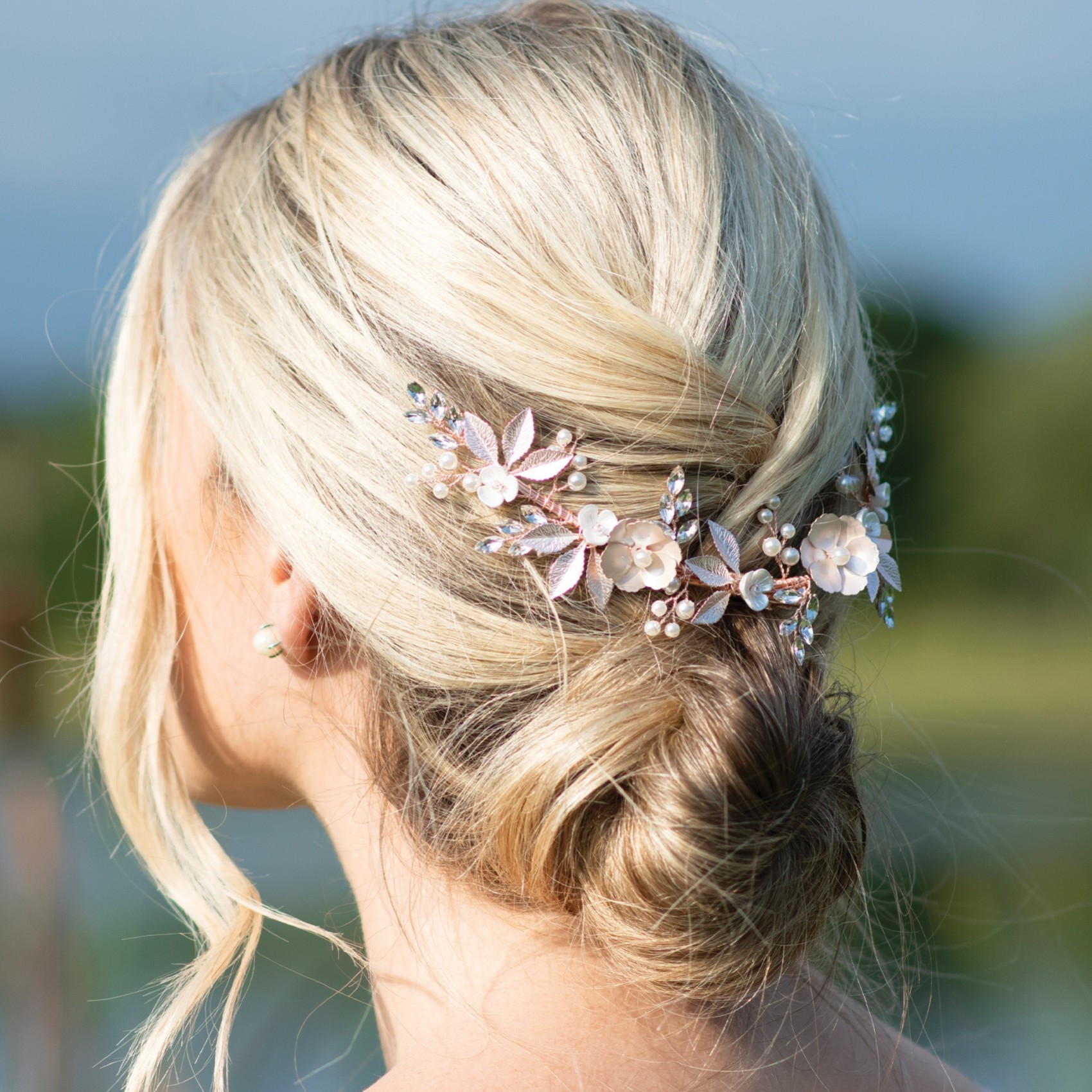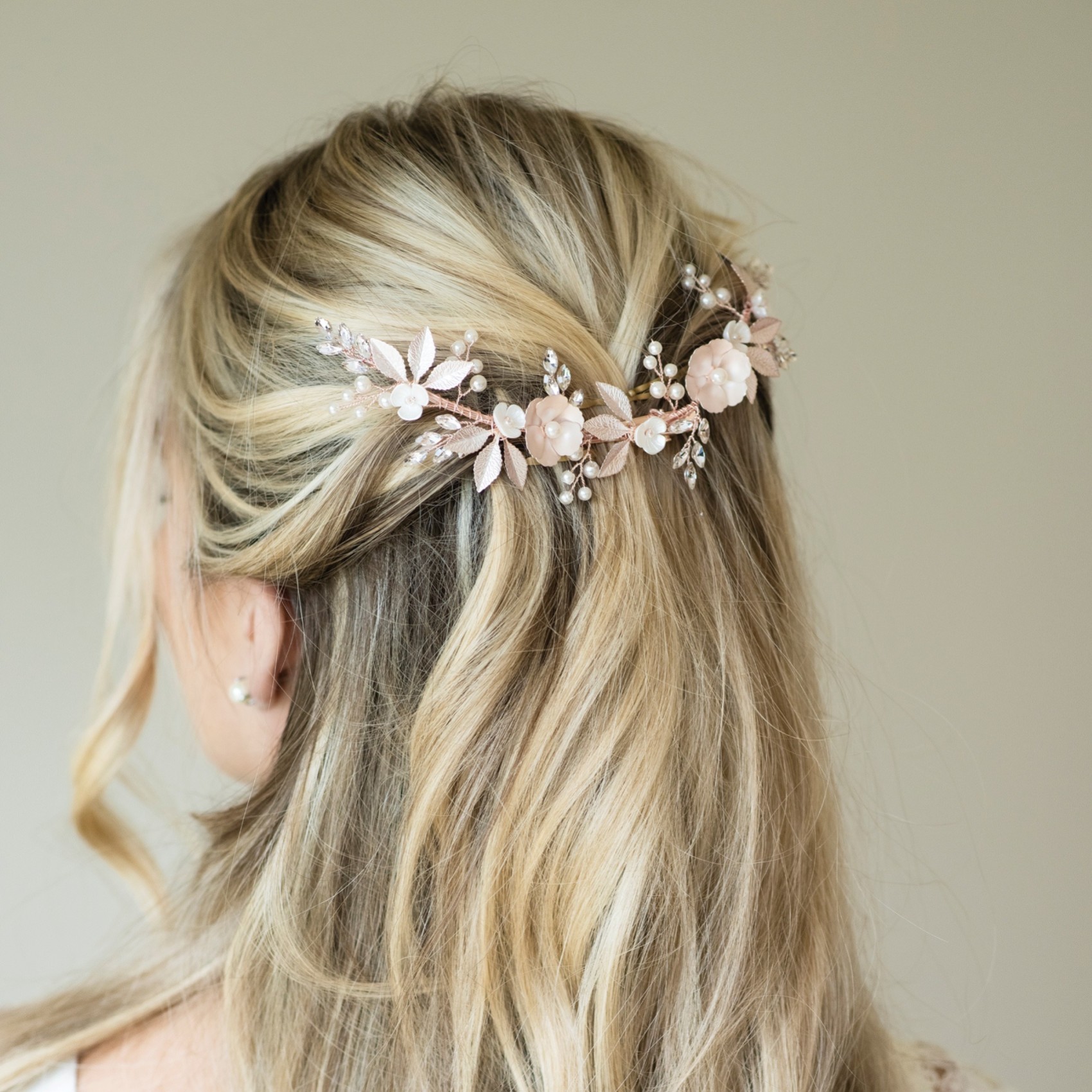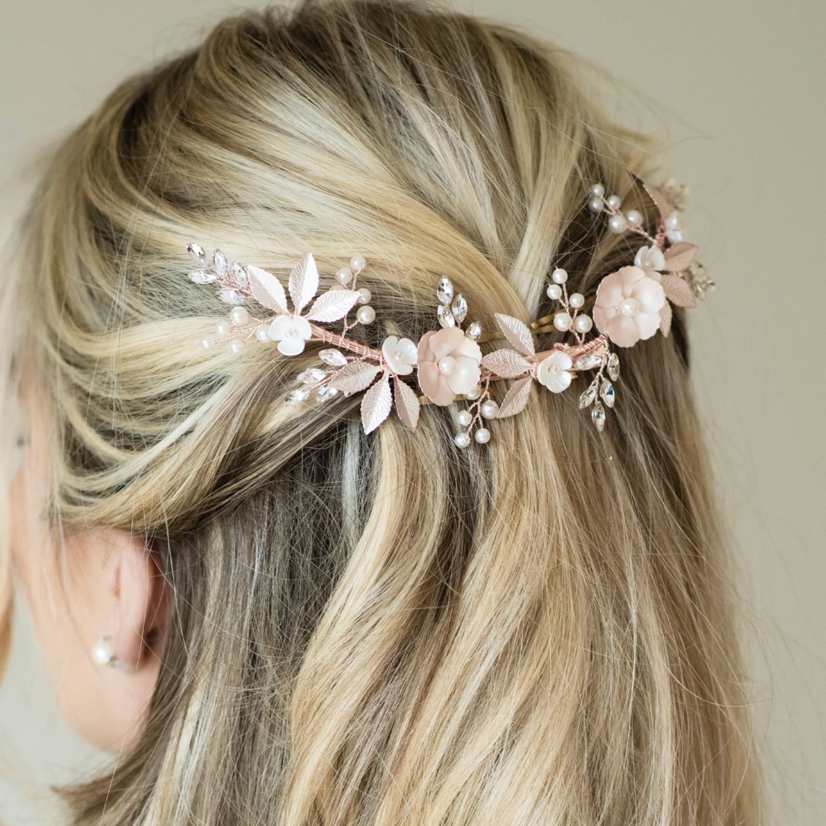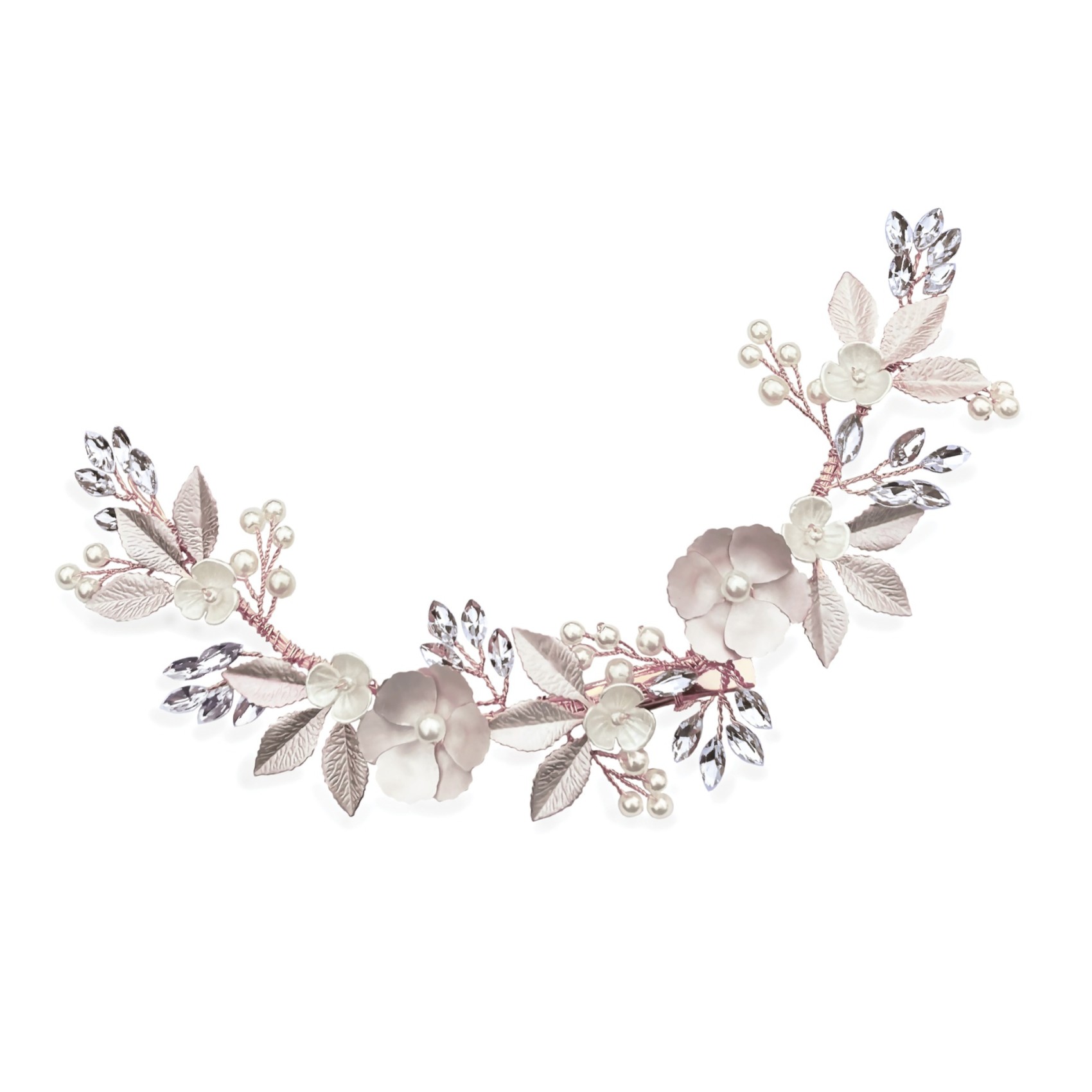 A beautiful statement floral hair clip for a relaxed, boho wedding look. Hand enamelled rose gold flowers and leaves, together with smaller ivory flowers are scattered between sparkling crystal leaves and dainty pearl sprigs. Fresh and informal for Spring and Summer weddings this pretty hair vine looks gorgeous paired with floaty and romantic dresses.