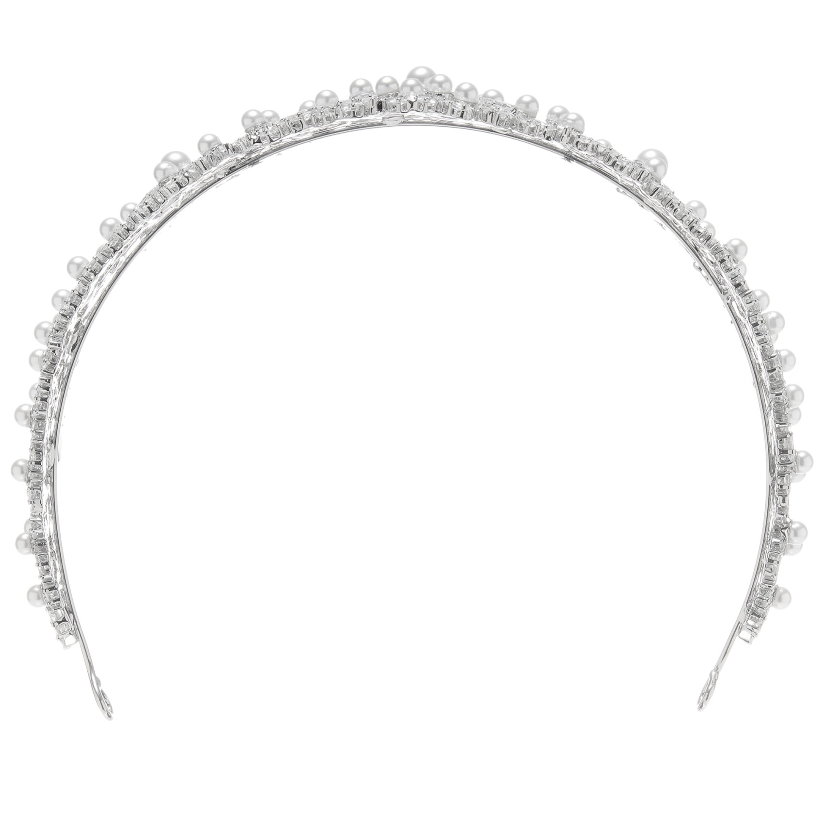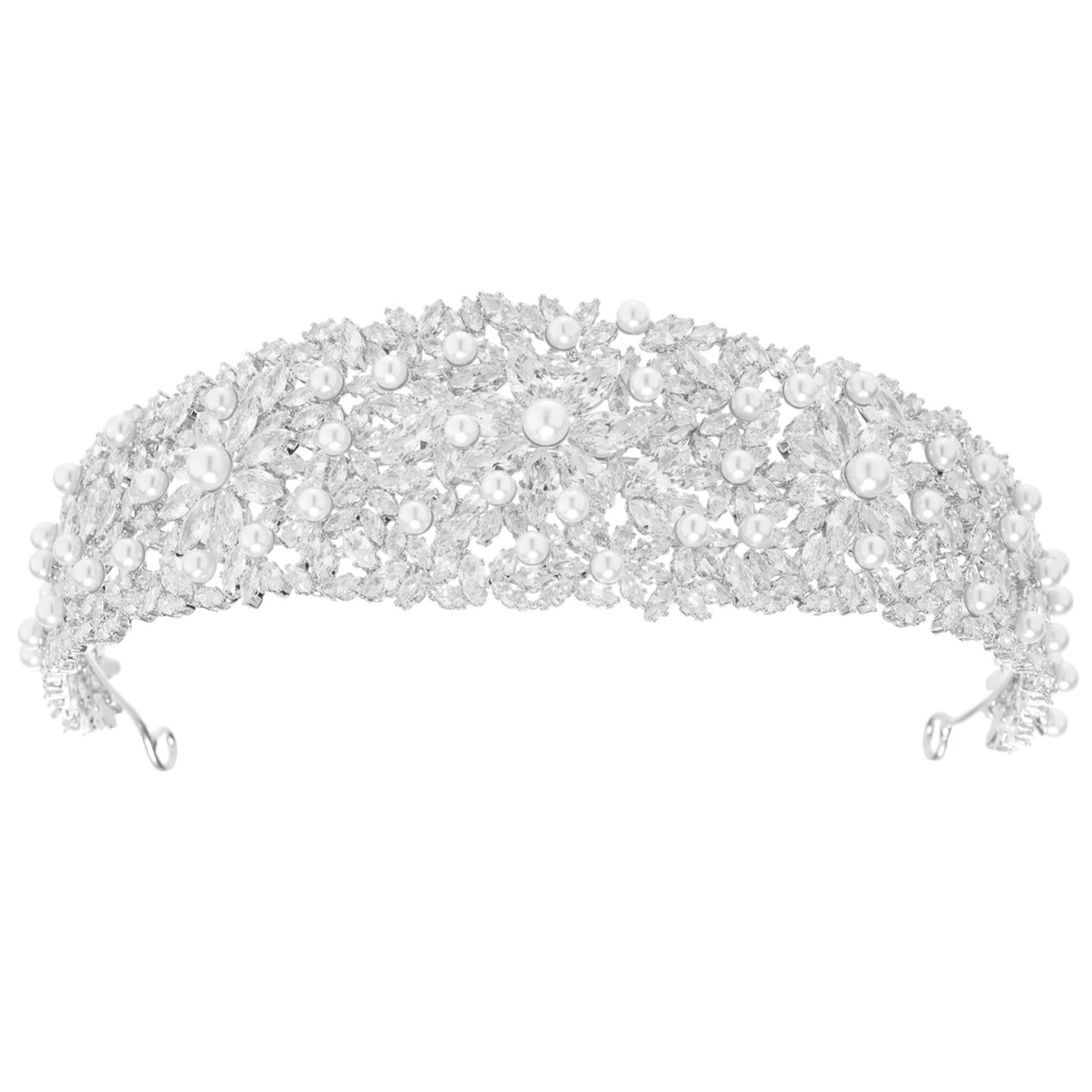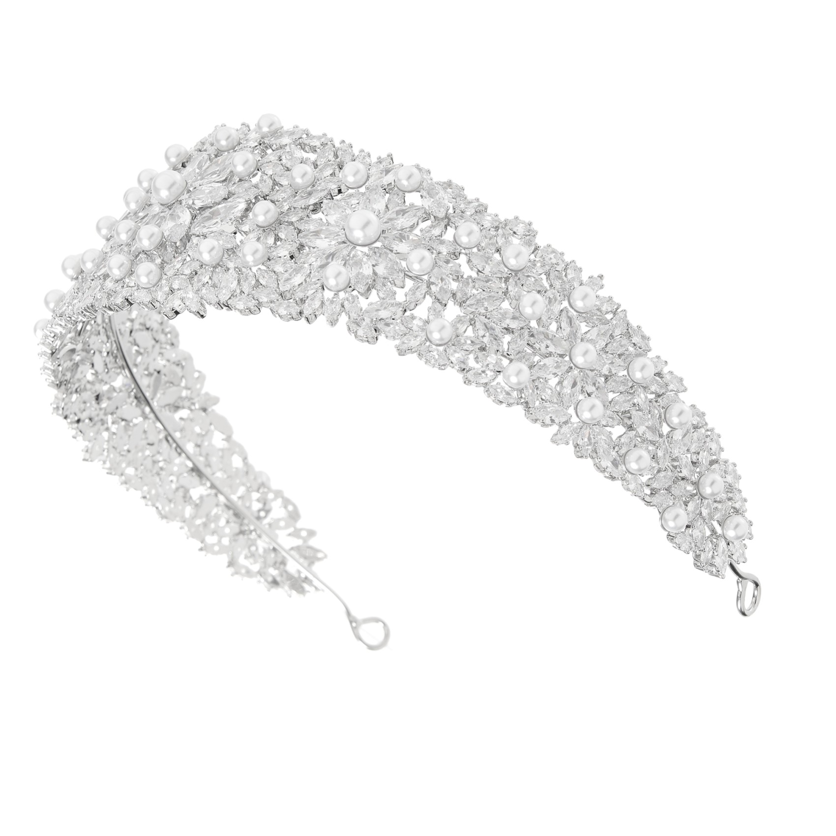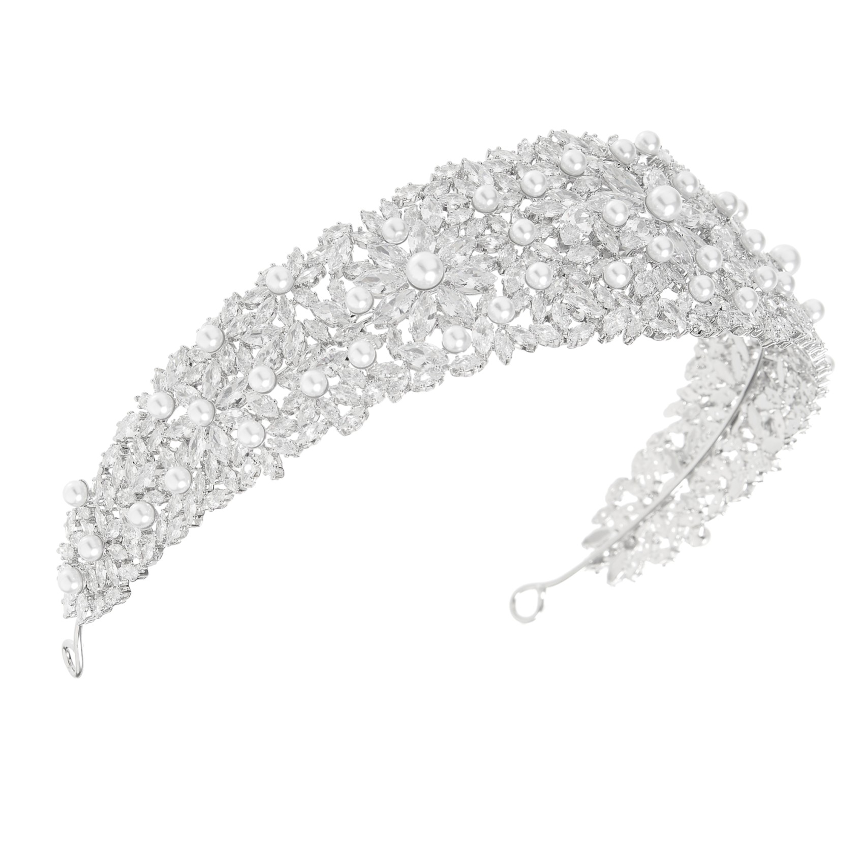 This stunning statement tiara is not for the faint hearted bride! Featuring a wide band design embellished with dozens of glistening cubic zirconia crystals and dotted with pretty pearls to finish. A sparkling bridal crown that will instantly make you feel like a princess style Martinique with a beautiful updo or tumbling waves for a glamorous wedding day look.