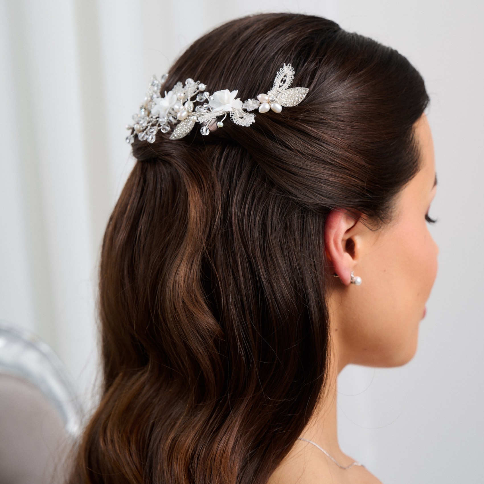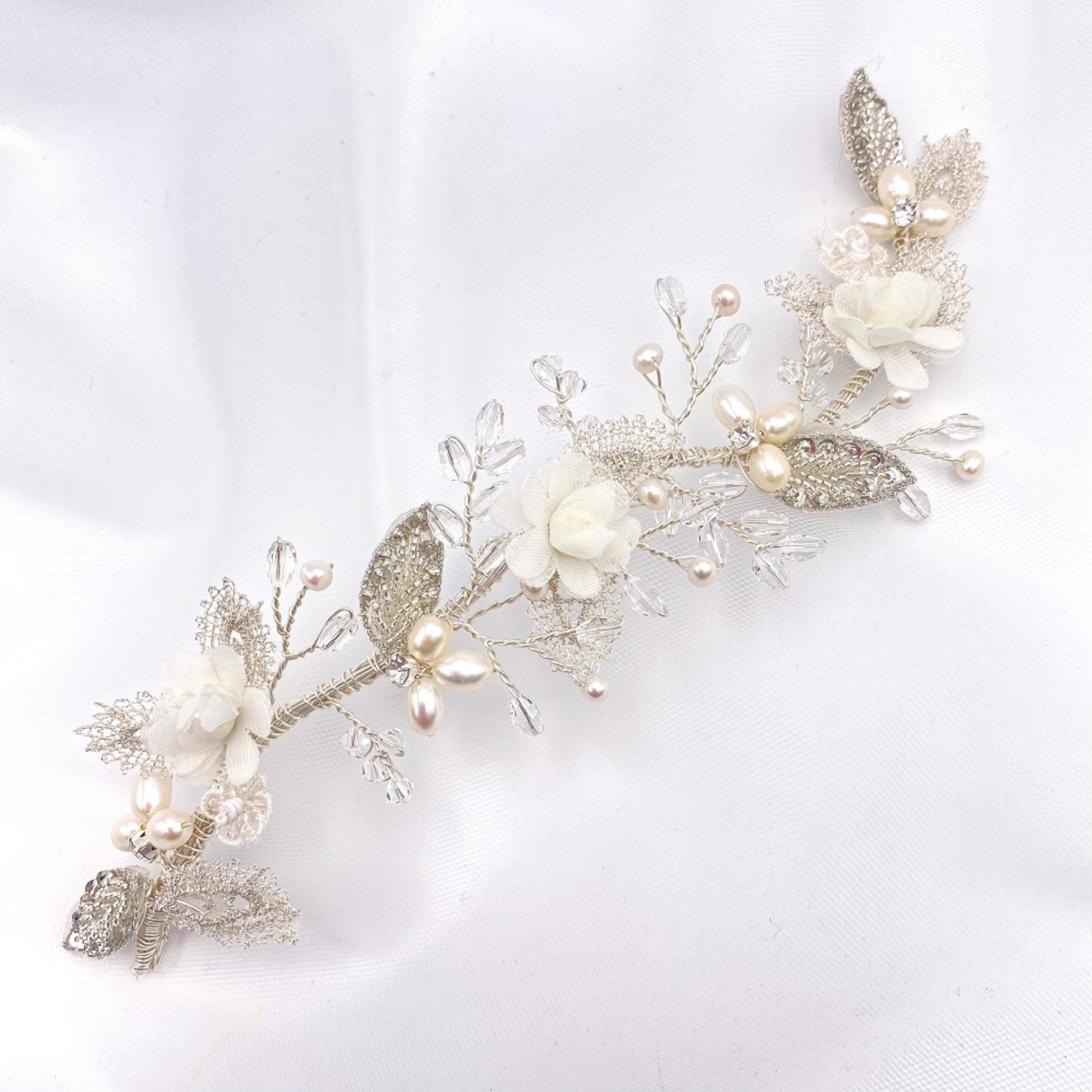 A pretty trailing vine of ivory fabric flowers, beautiful beaded leaves and shimmering pearls and crystals make up this feminine bridal hair piece. Wear in the side of a bridal updo or at the back of the hair with a floral wedding dress for an utterly romanic bridal look. Secures into the hair with pins using the small wire loops at each end of the vine.