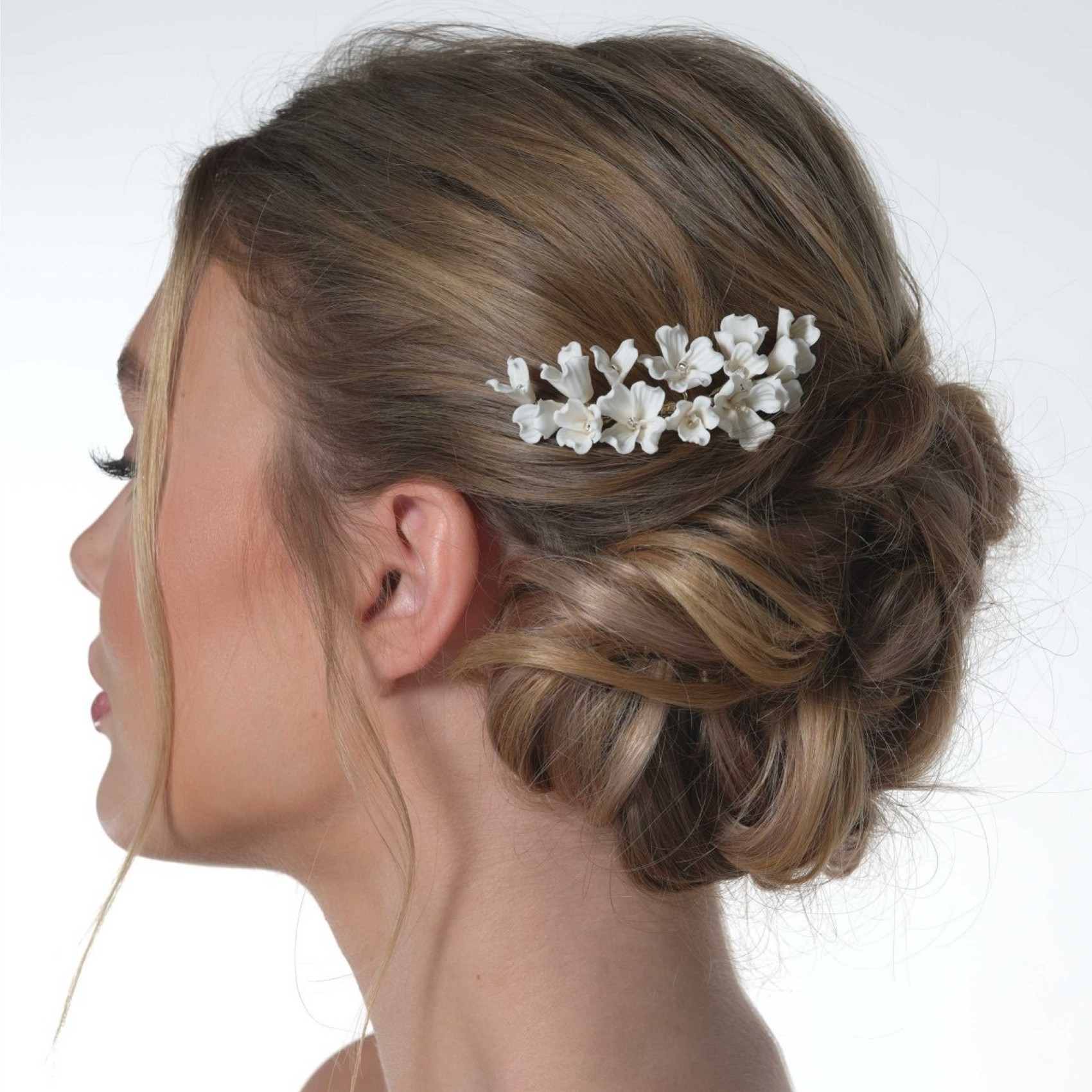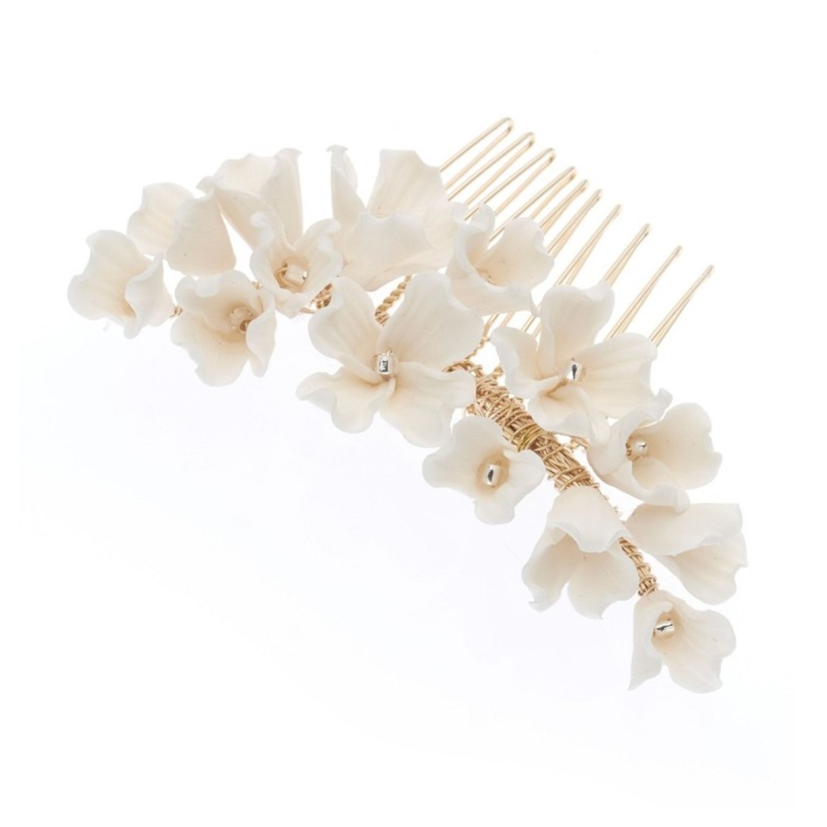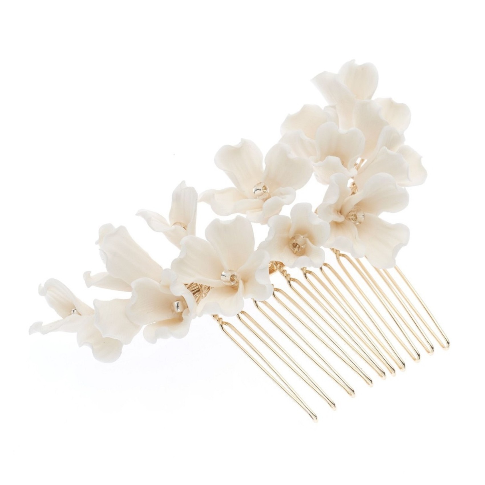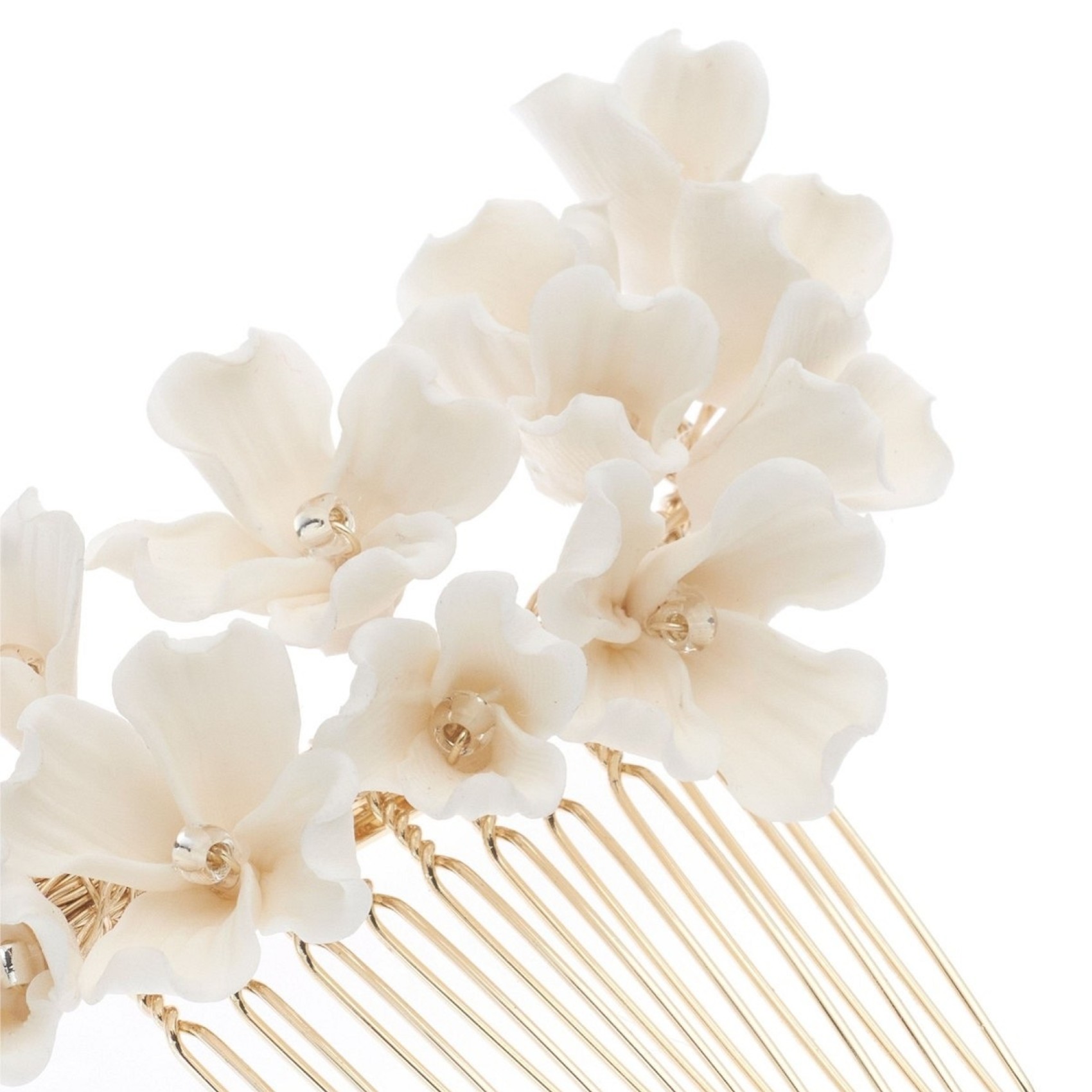 This gorgeous floral hair comb lends a beautifully feminine touch to wedding hair. Featuring intricately made ivory porcelain flowers hand wired to a gold hair comb wear this in the side of an updo or in the centre of the hair above a veil for a dreamy bridal look.