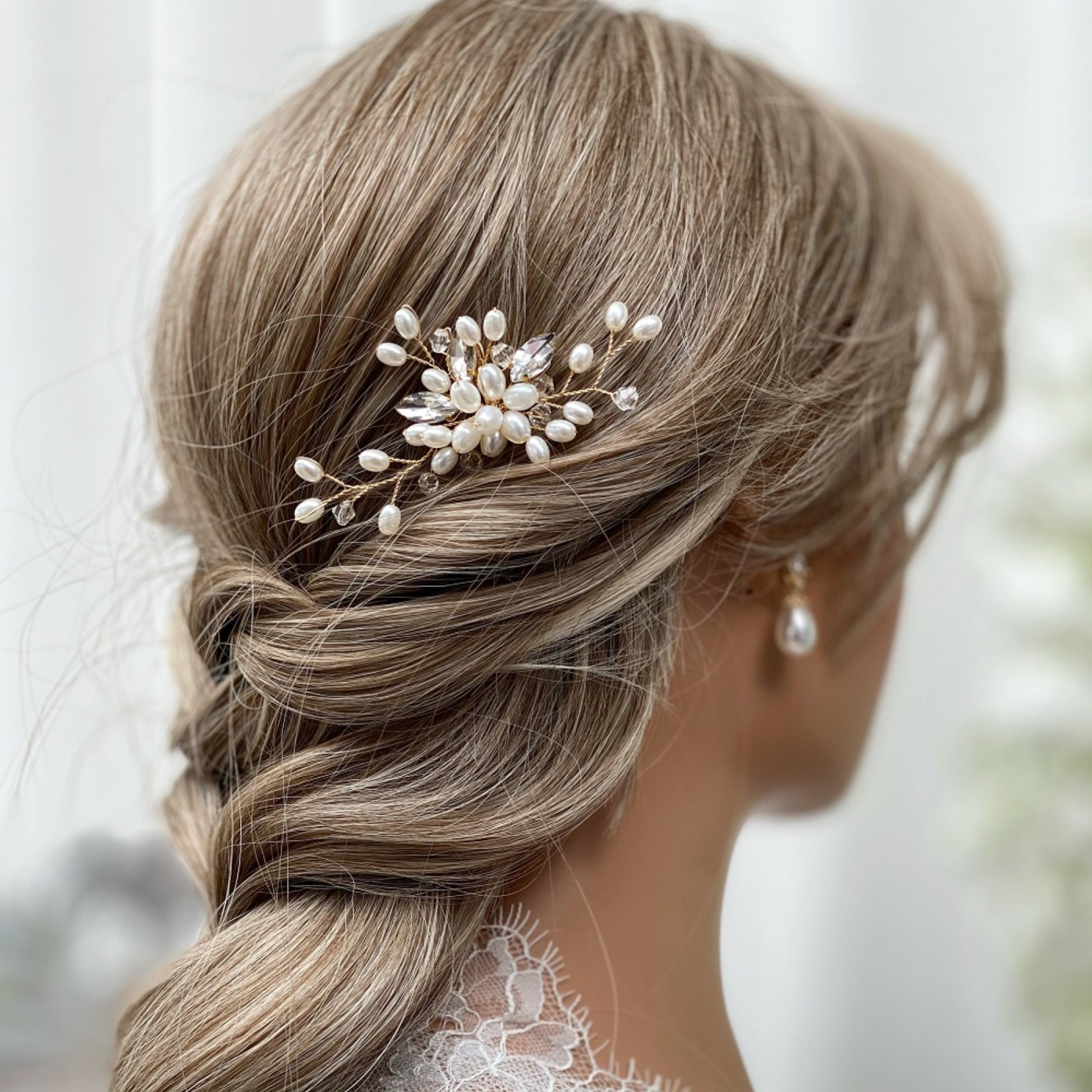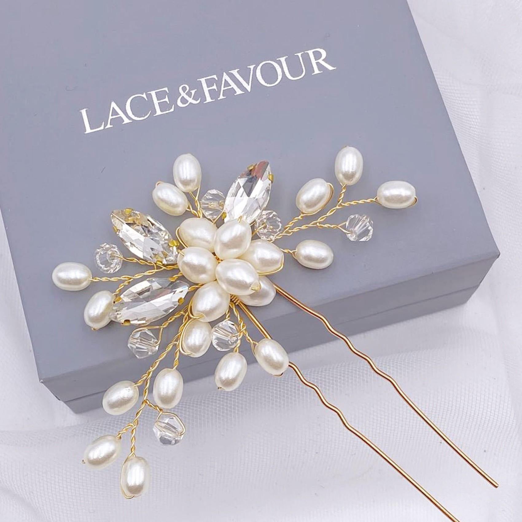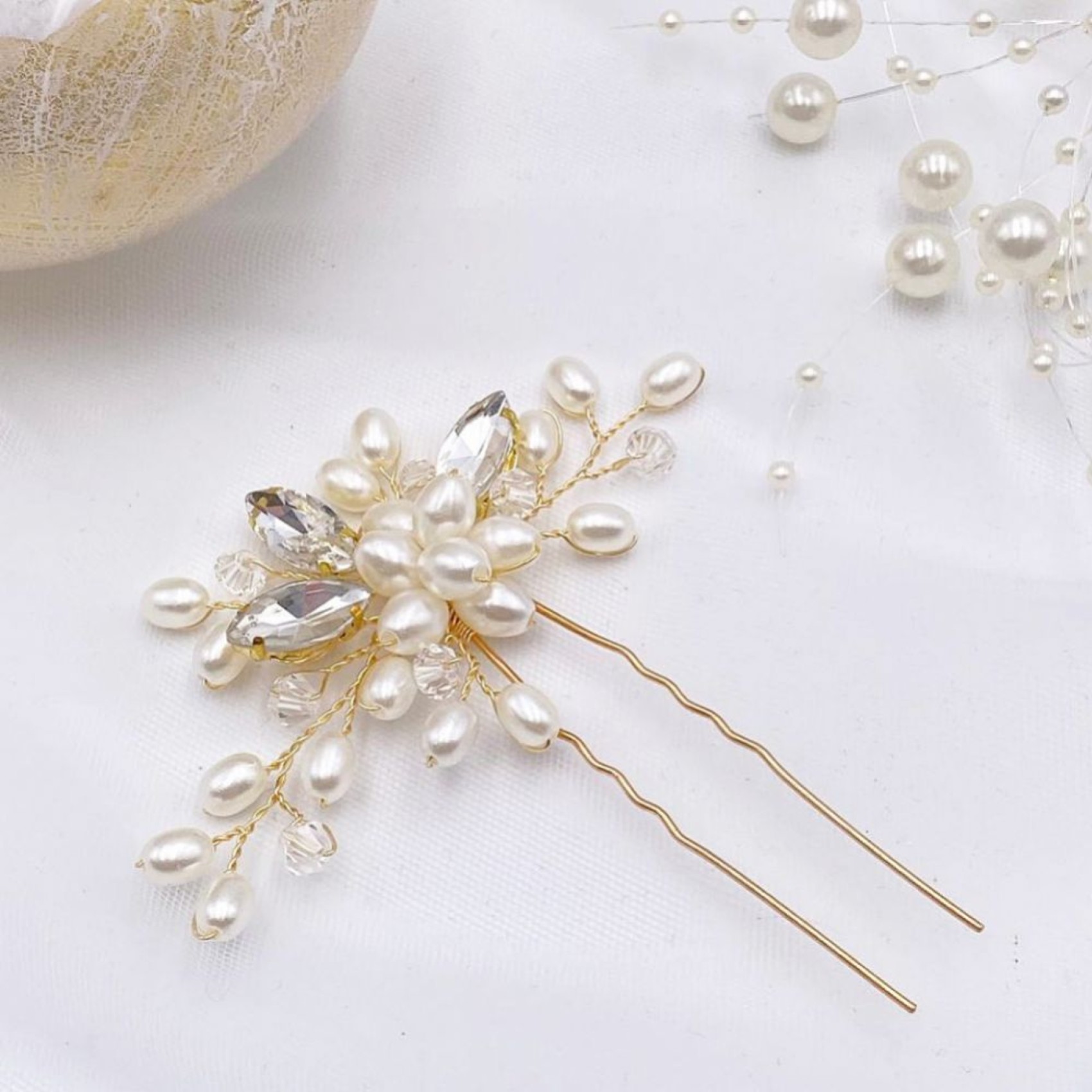 A stylish classic wedding hair pin made with a cluster of luminous ivory pearls and delicate sprigs of twinkling marquise crystals and clear beads. This pretty gold hair pin looks beautiful worn alone in the hair or for bolder look, wear two or three pins. Perfect for brides and bridesmaids alike and this dainty hair accessory makes a beautiful wedding gift.
