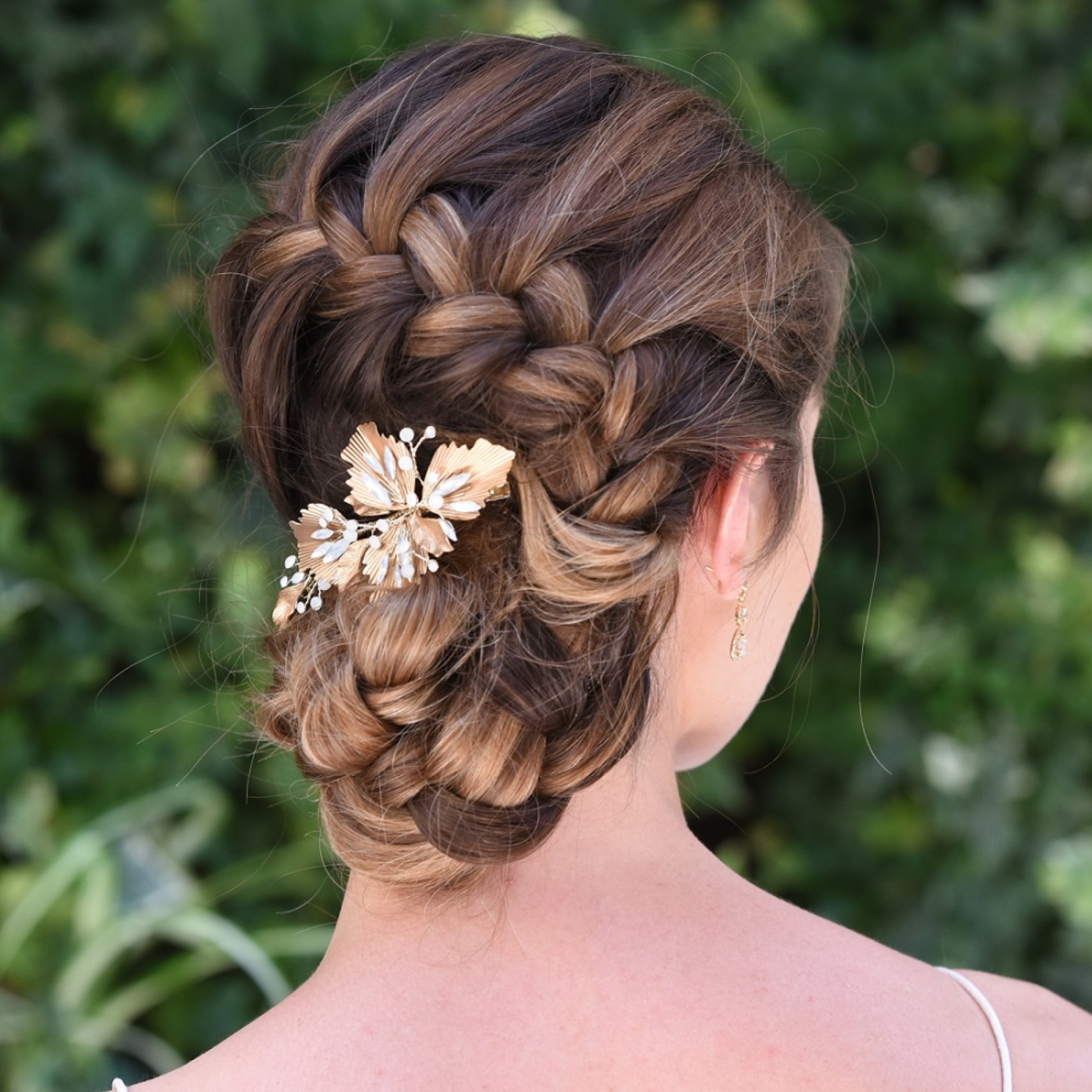 An unusual bridal hair clip with Art Deco accents. Featuring a stylised bronze enamelled leaf sunburst with sprays of glistening opal solitaire and marquise crystals. This design looks stunning either at the back of the hair above a bun or tucked in the side of any hairstyle. Secures into the hair with a small crocodile clip. Perfect for brides and bridesmaids alike.