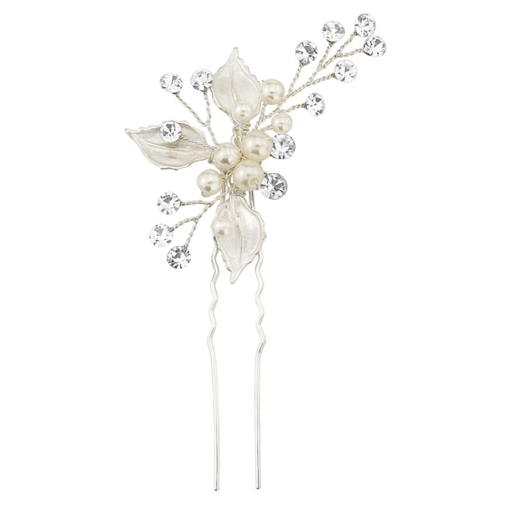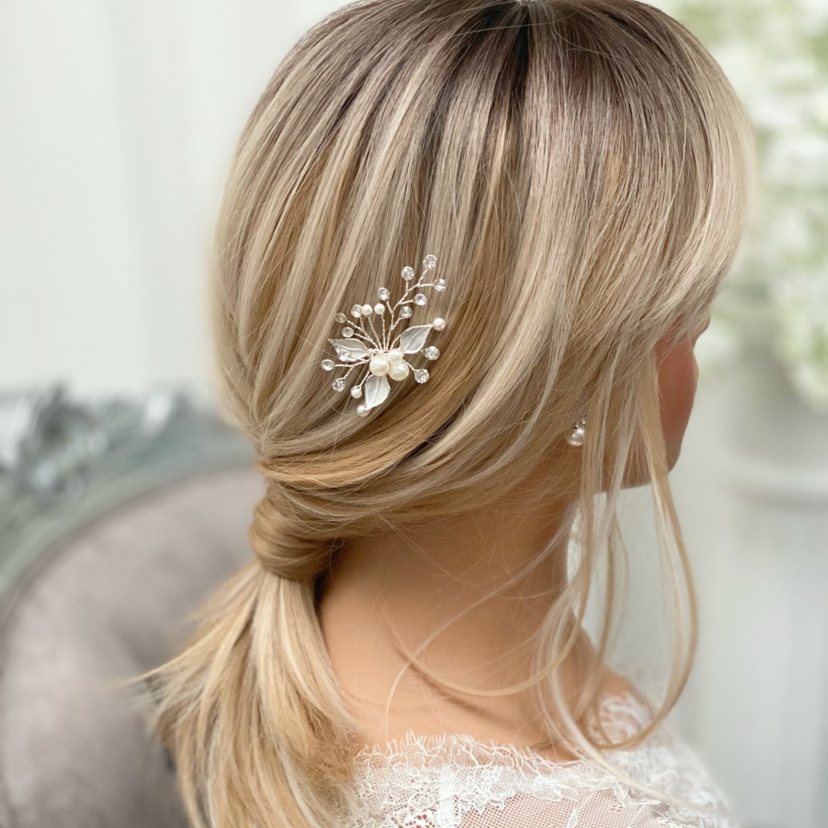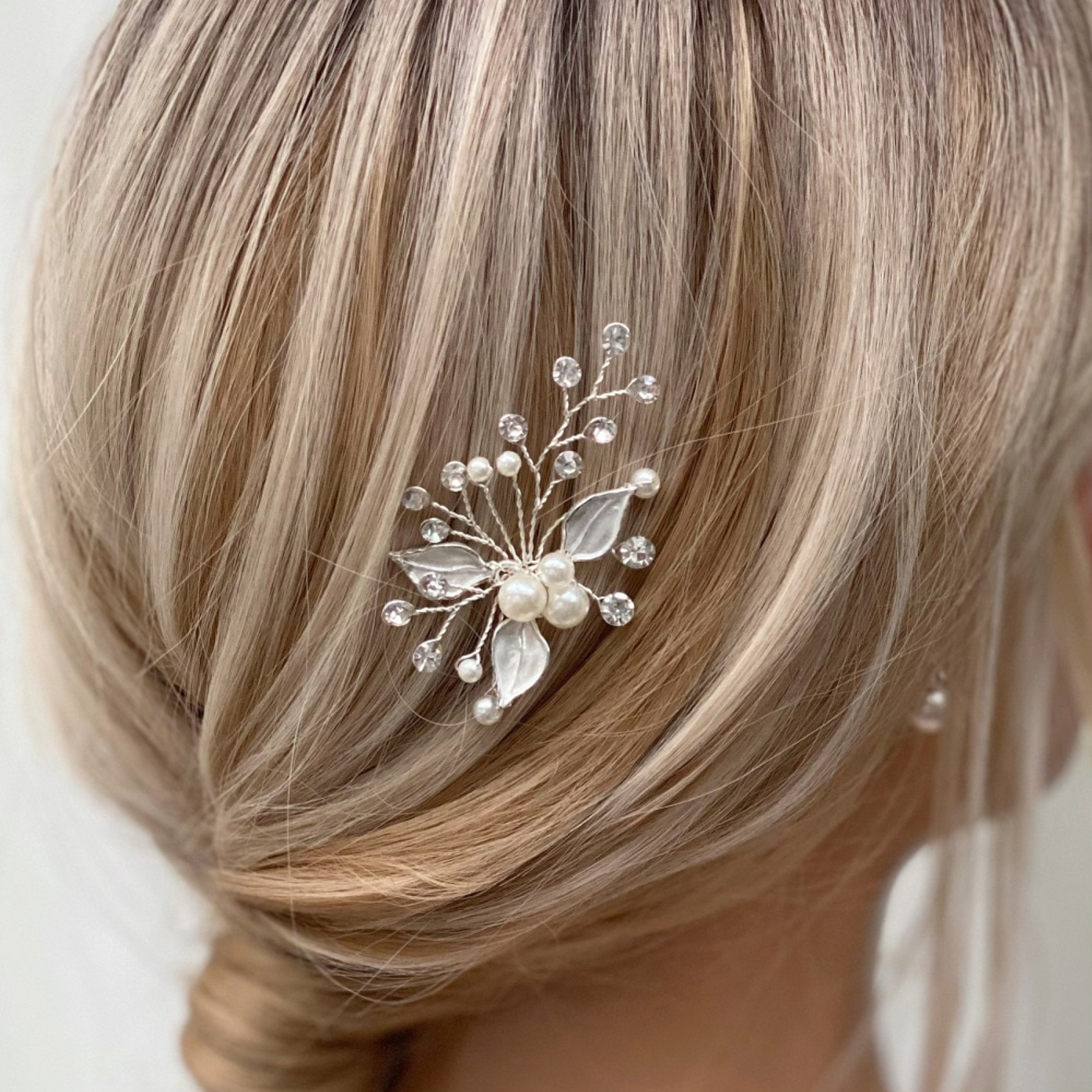 Adorned with pretty ivory pearls, twinkling crystals and silver hand painted leaves, this gorgeous floral spray hair pin is the perfect accessory for bridal and bridesmaid hair. Nestle a single pin in the side of an up-do or cluster 2 or 3 together for a dainty addition to wedding hair.