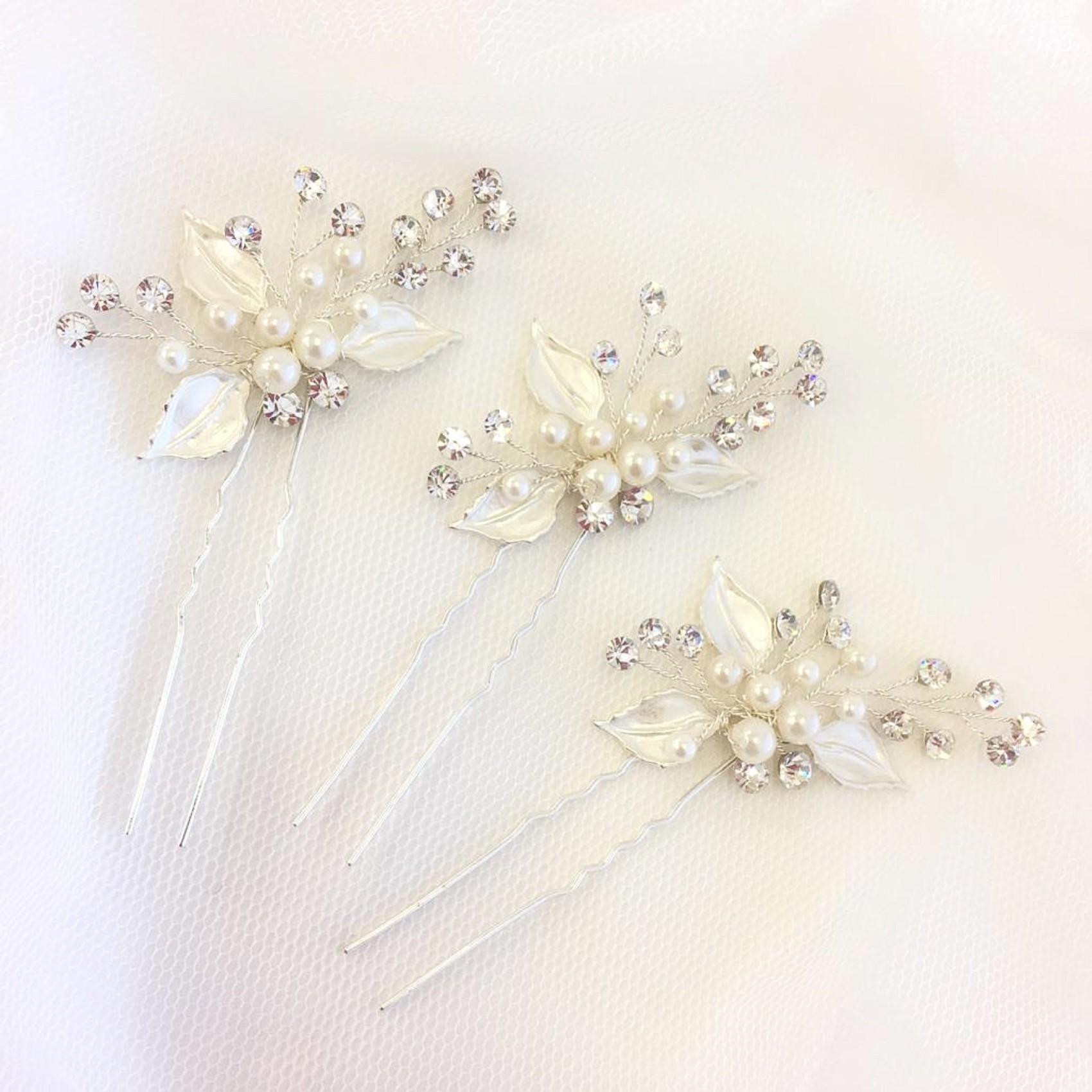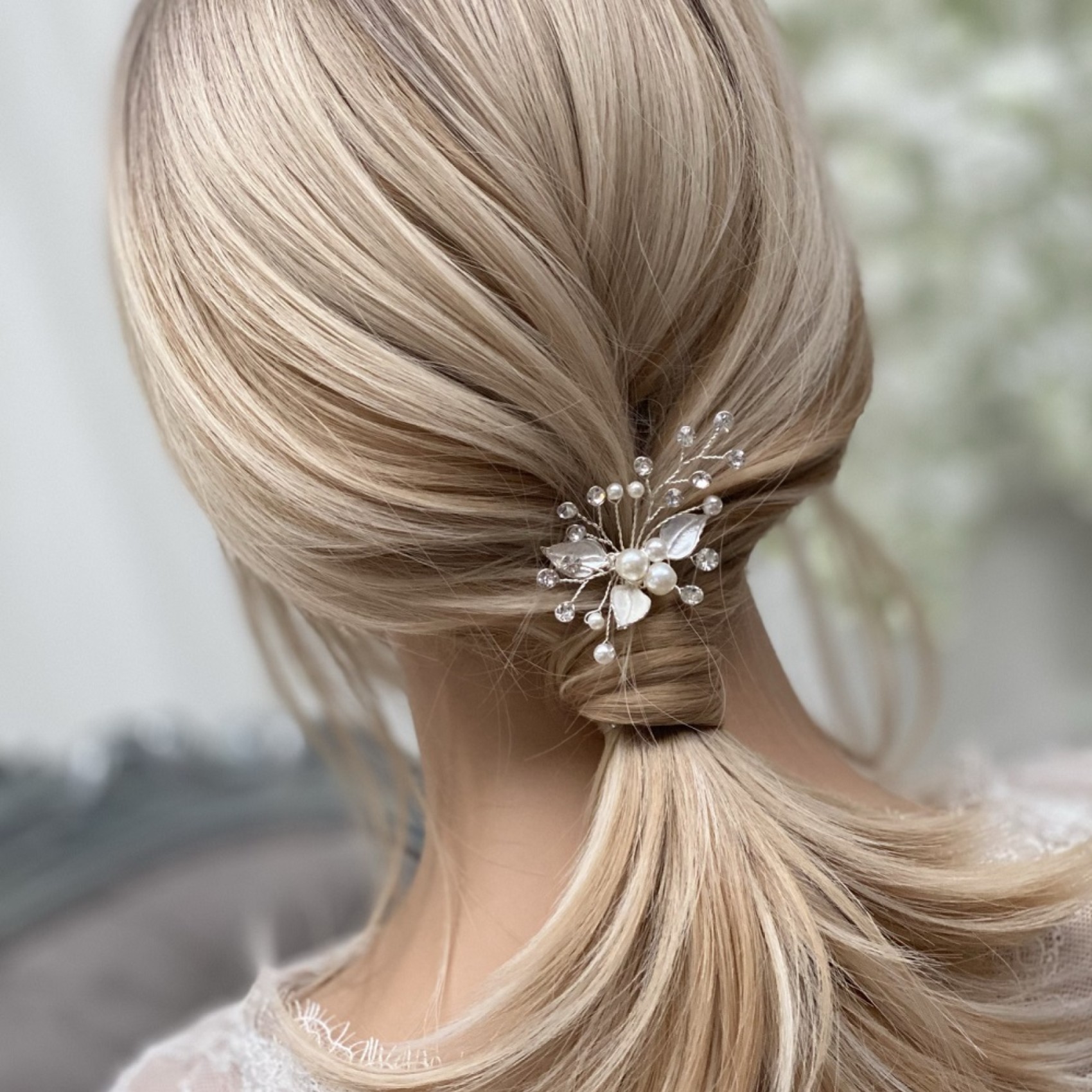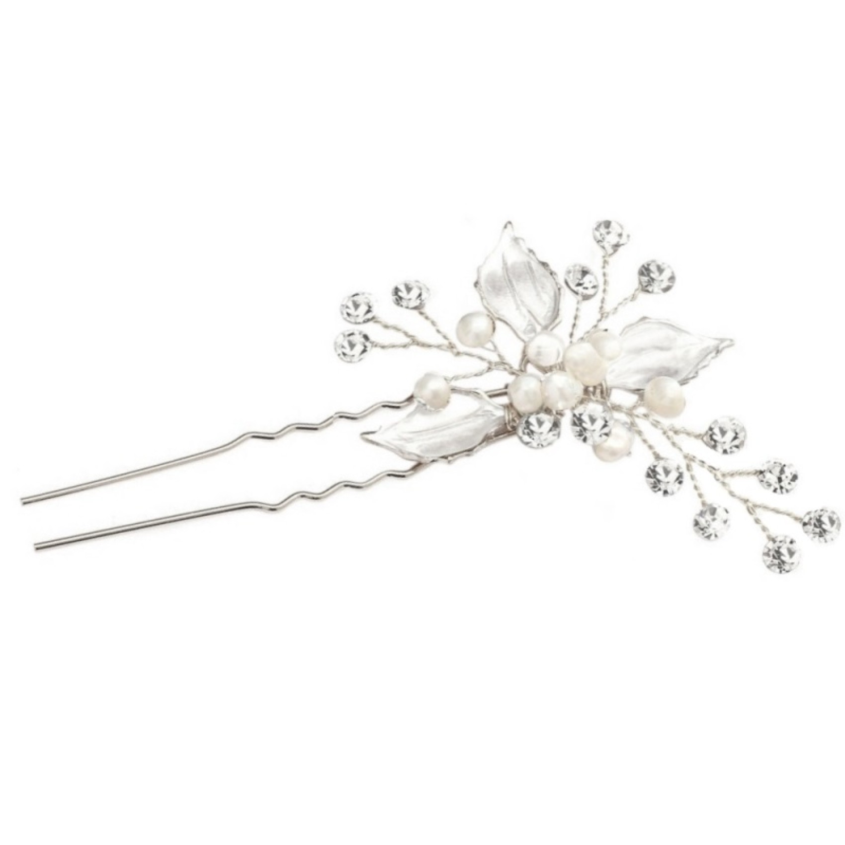 Adorned with pretty ivory pearls, twinkling crystals and silver hand painted leaves, this gorgeous floral spray hair pin is the perfect accessory for bridal and bridesmaid hair. Nestle a single pin in the side of an up-do or cluster 2 or 3 together for a dainty addition to wedding hair.