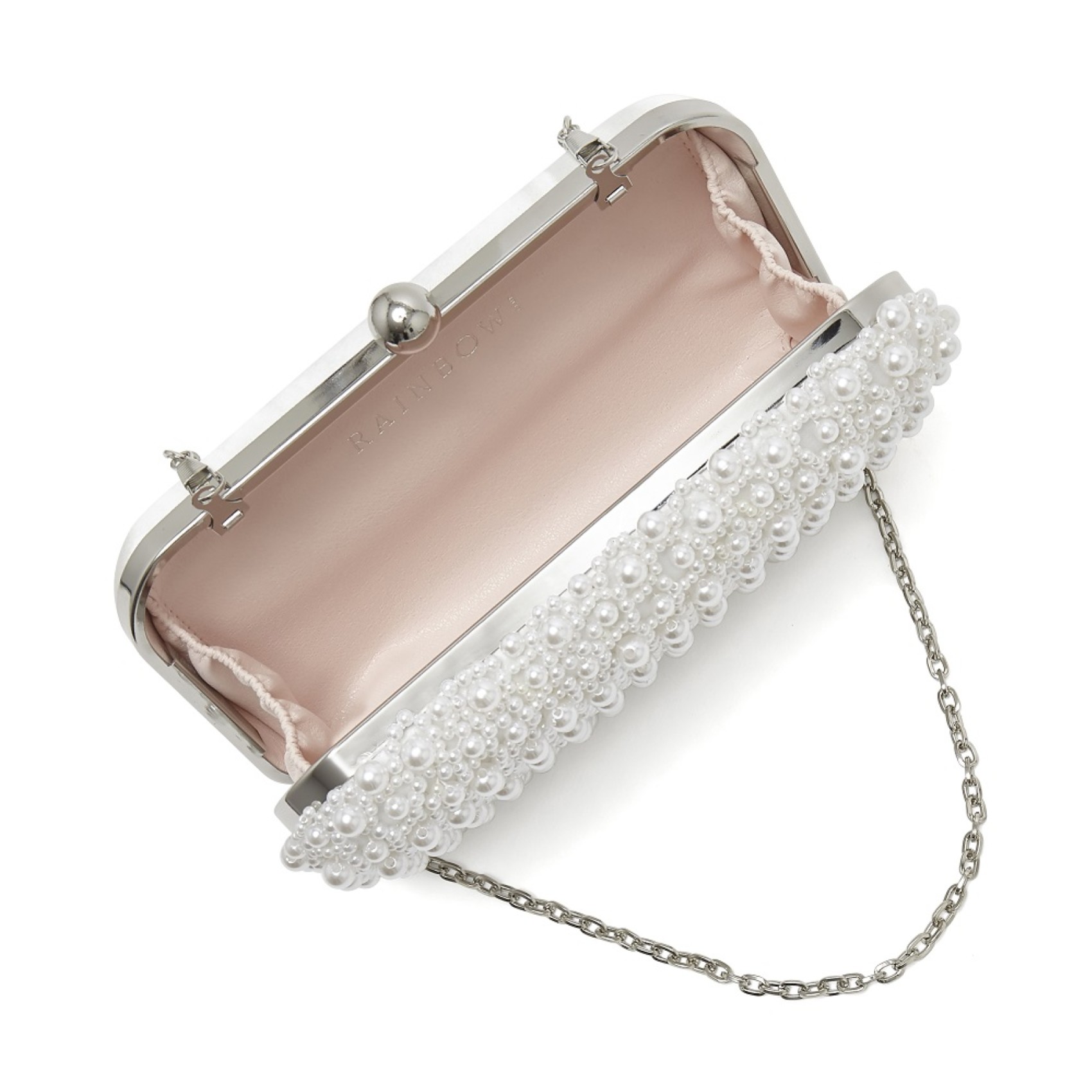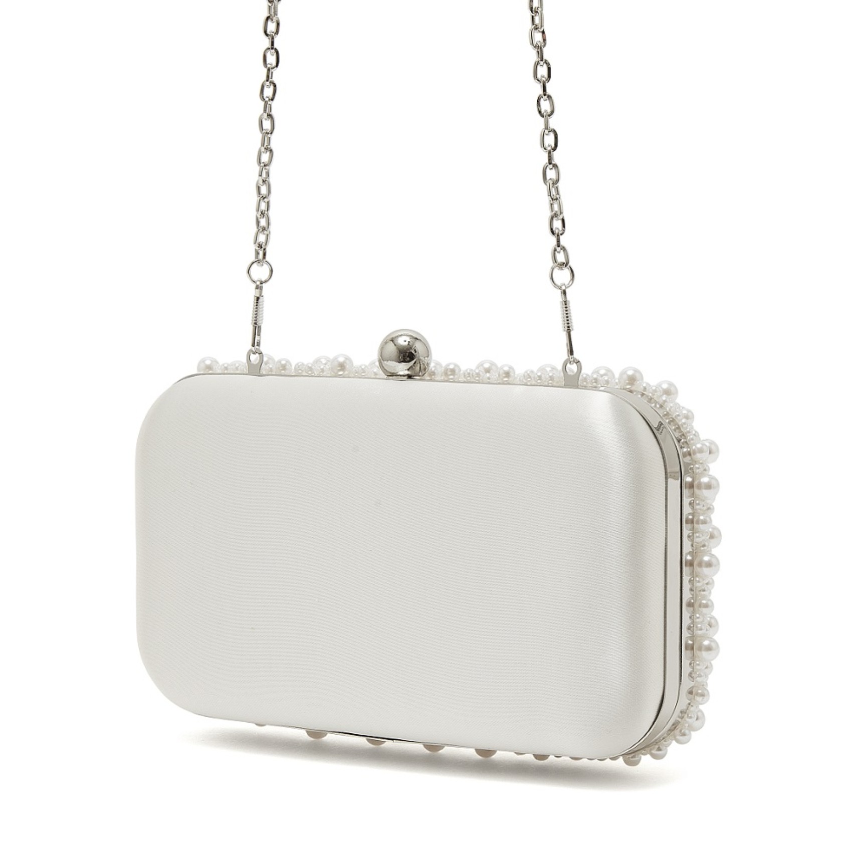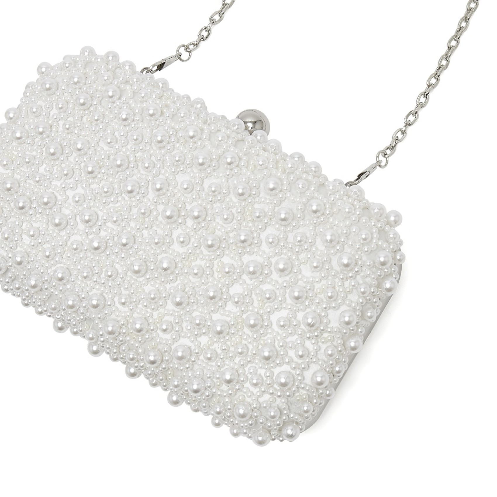 A real show-stopper of a bridal clutch, the Cora handbag is a statement style in our handbag collection. It has an ivory satin base covered in shimmering pearls, a rounded case-like shape, a silver clasp, an inside slip pocket and a detachable shoulder chain. It is also possible to dye it to a colour of your choice, to perfectly match your outfit. Whether you're a bride to be, a bridesmaid, a mother of the bride or a wedding guest, this beautiful handbag is sure to have impact on the big day.
