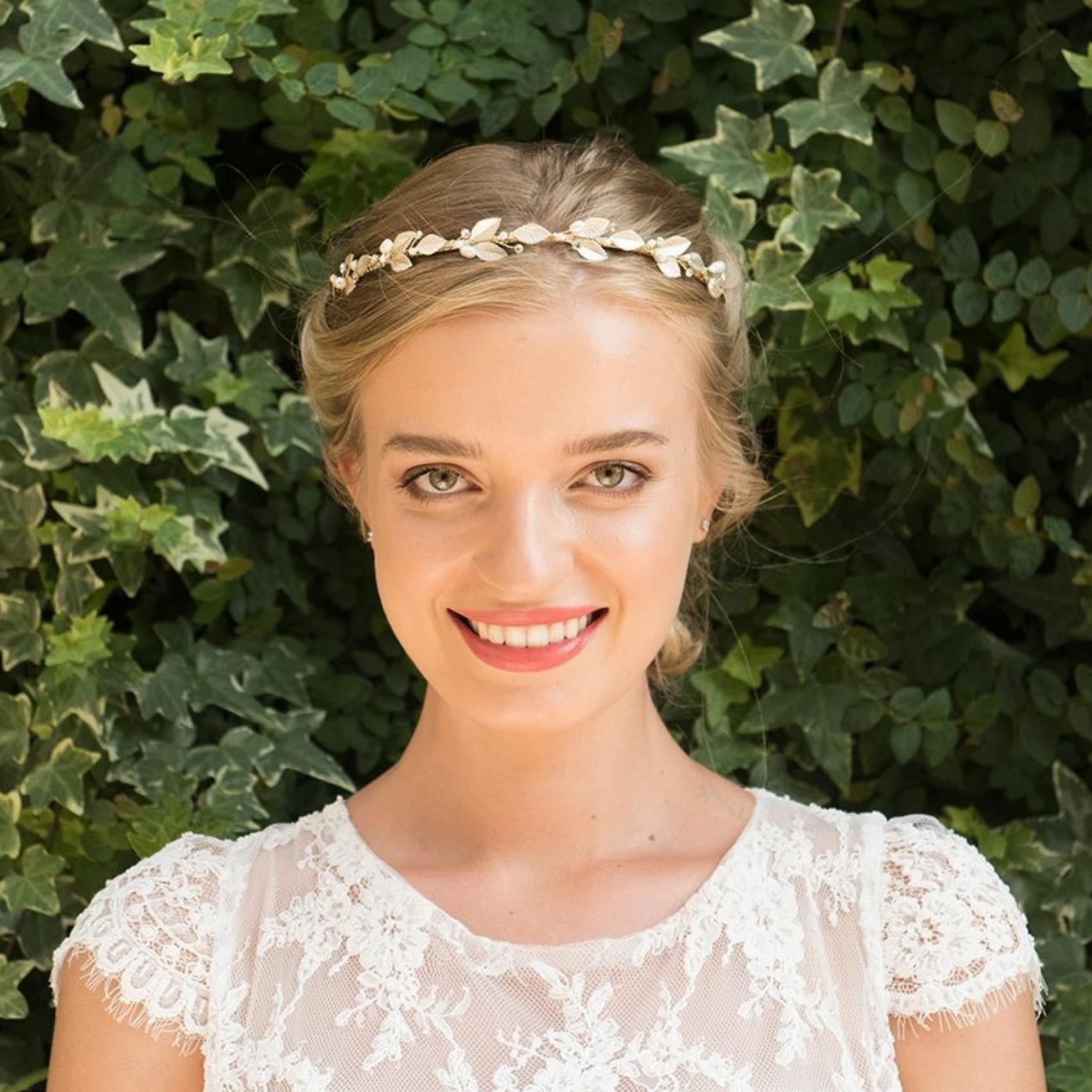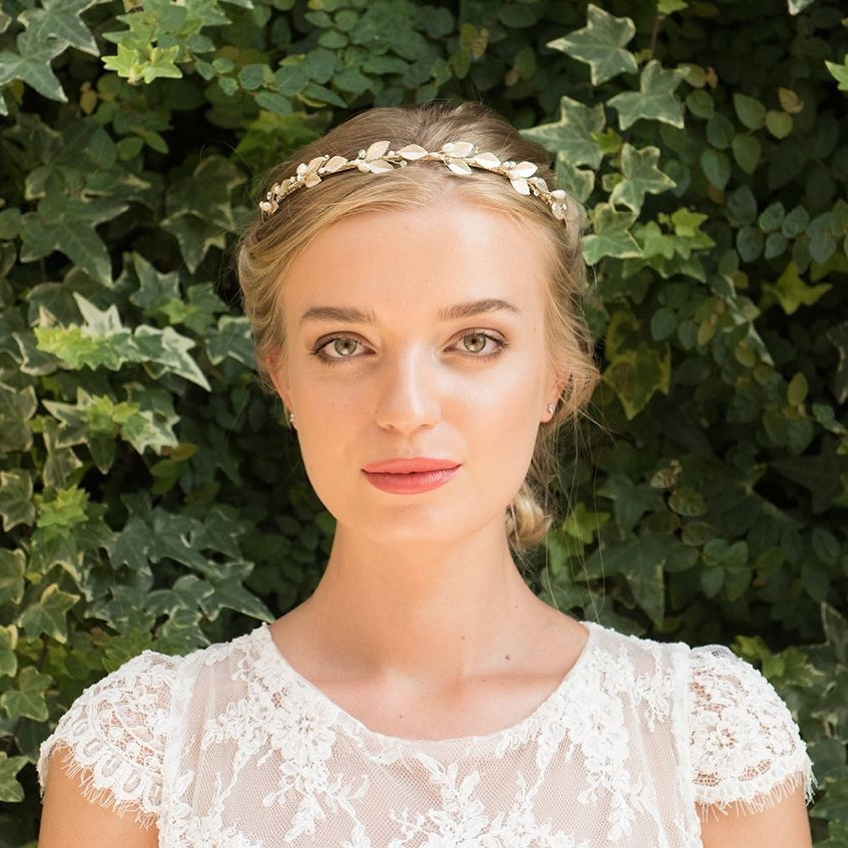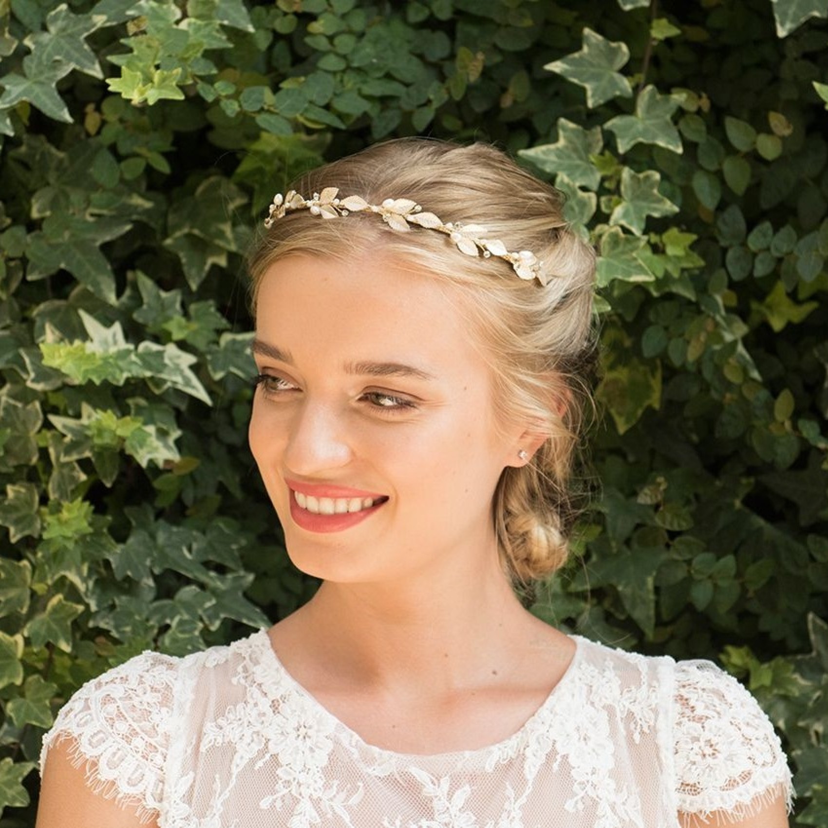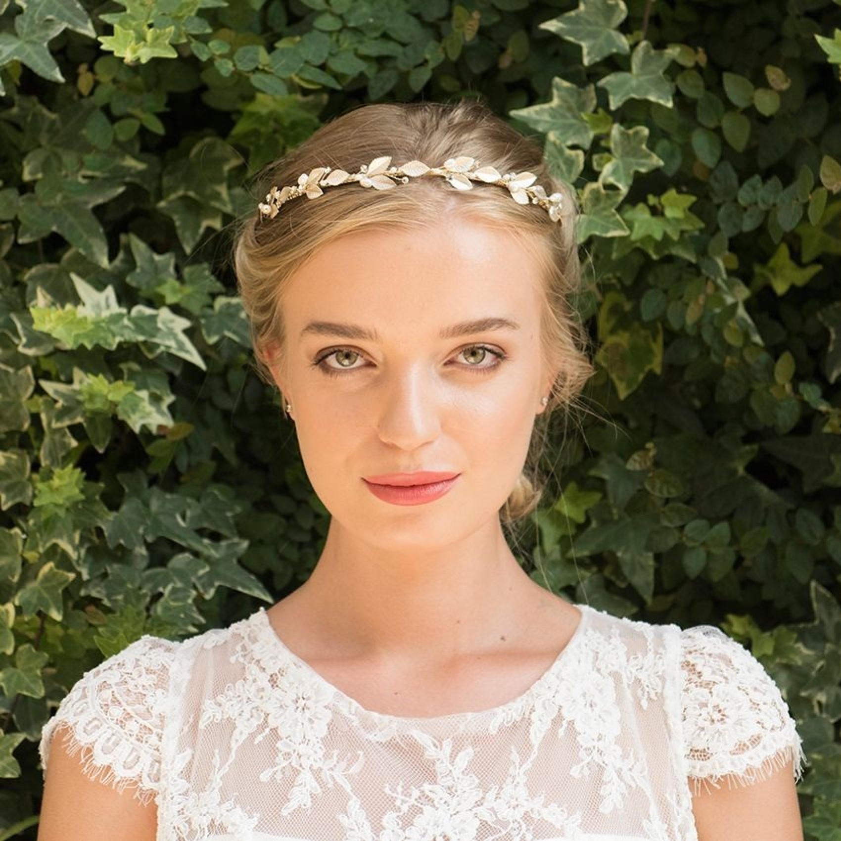 A beautiful bohemian-inspired bridal headband made up of delicate hand-enamelled champagne gold leaves, interspersed with twinkling solitaire crystals and gorgeous ivory freshwater pearls. This simple yet pretty floral headpiece is perfect for woodland or destination beach weddings. The dainty design also makes this piece ideal for bridesmaids.