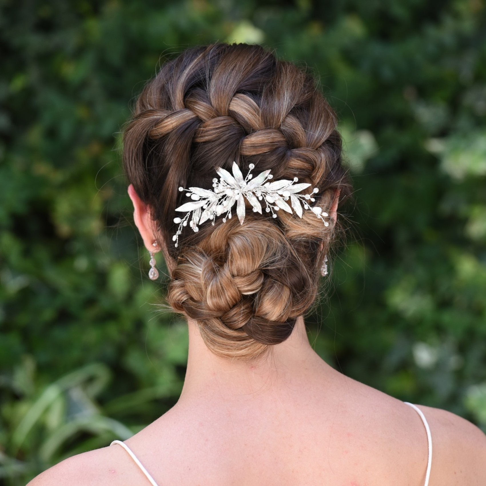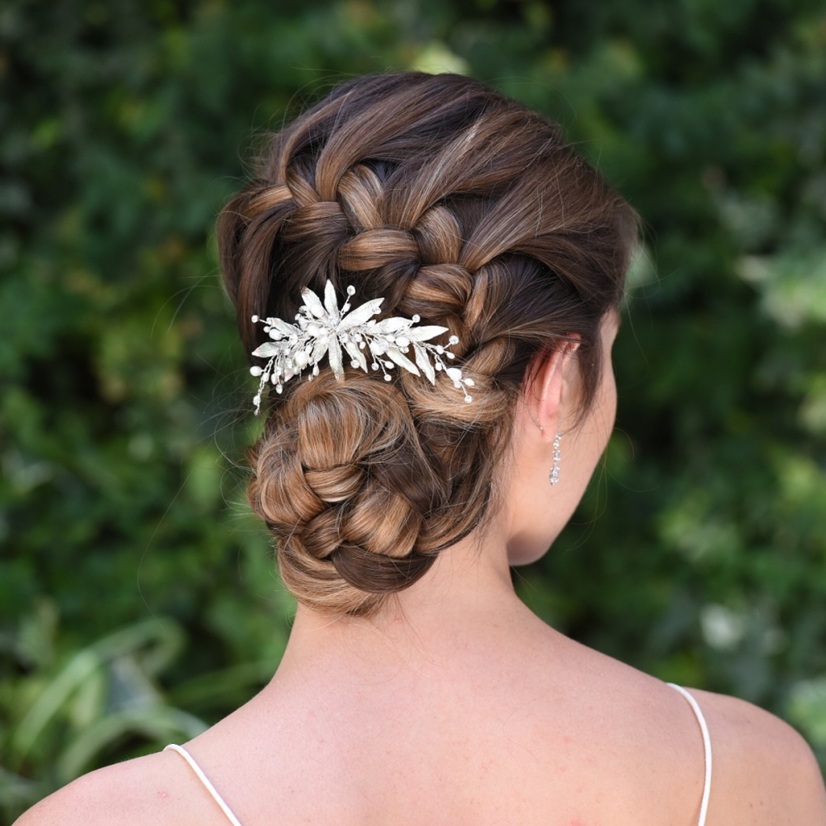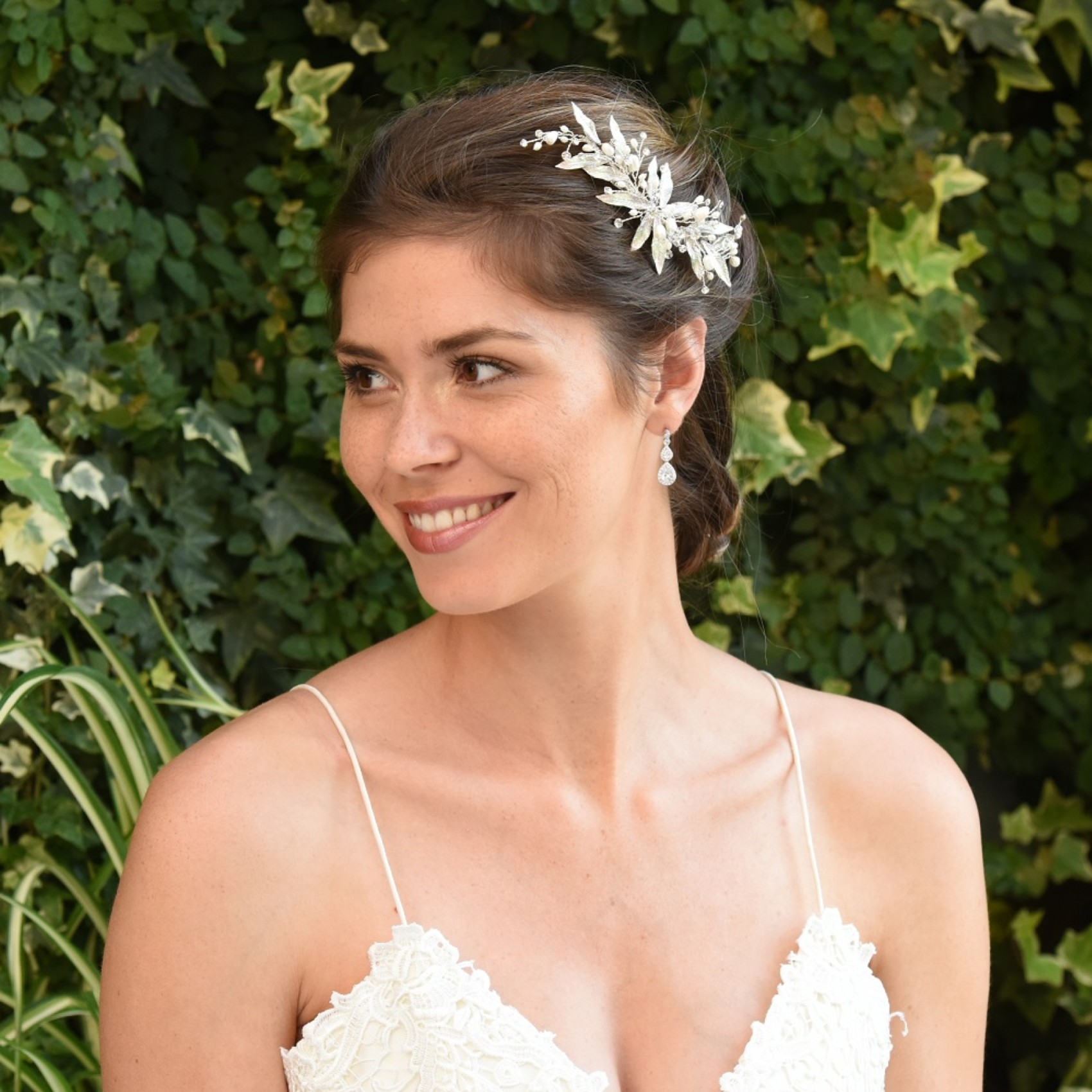 Nieva is a gorgeous and very delicate wedding hair clip. Dazzling cut solitaire crystals are set in a stunning organic hand enamelled leaf design and embellished with dainty ivory freshwater pearls and finished with sprigs of twinkling solitaires. This design is perfect for outdoor ceremonies and beach weddings. Secures into the hair with a small crocodile clip for maximum versatility. Please above a soft chignon or slide into the side of the hair.