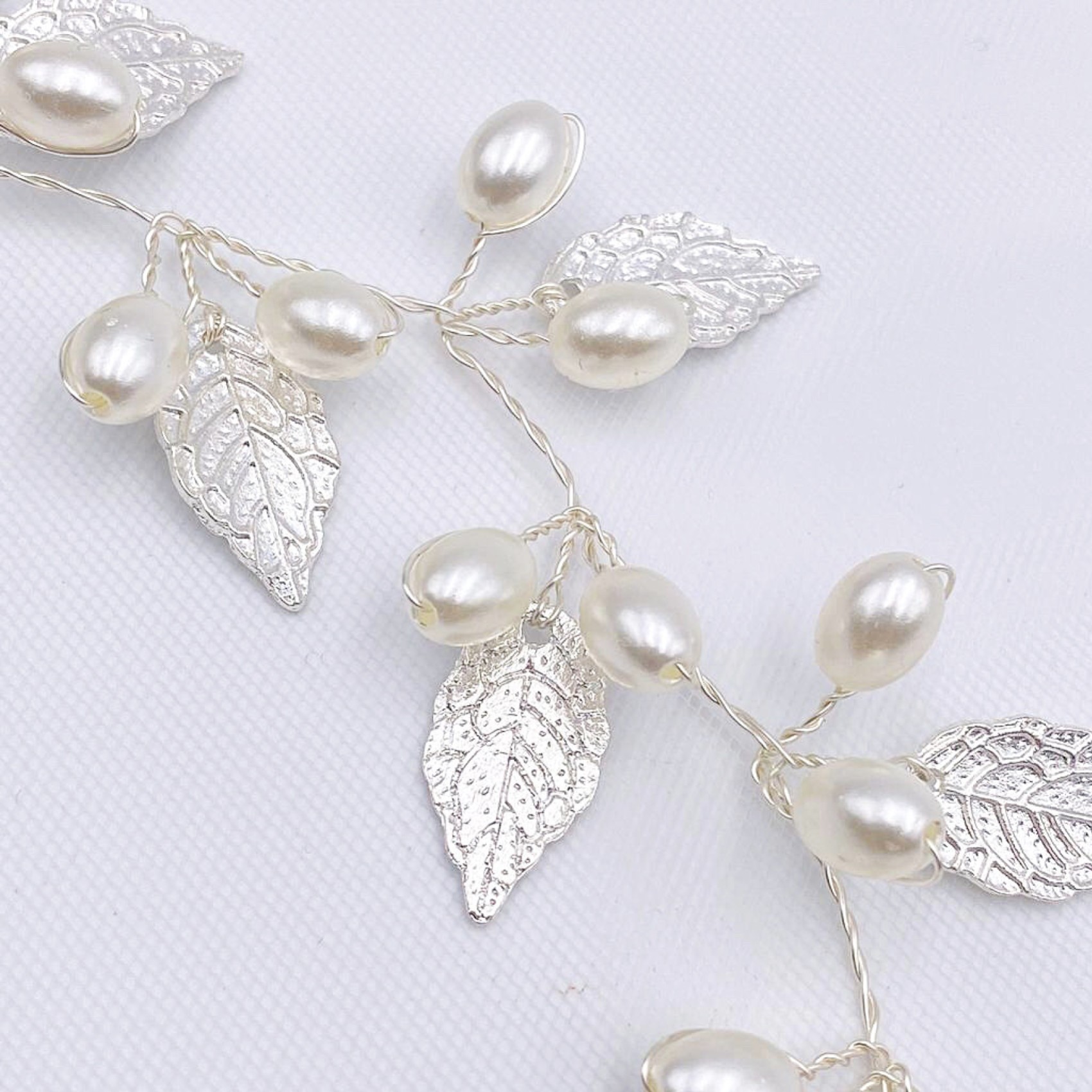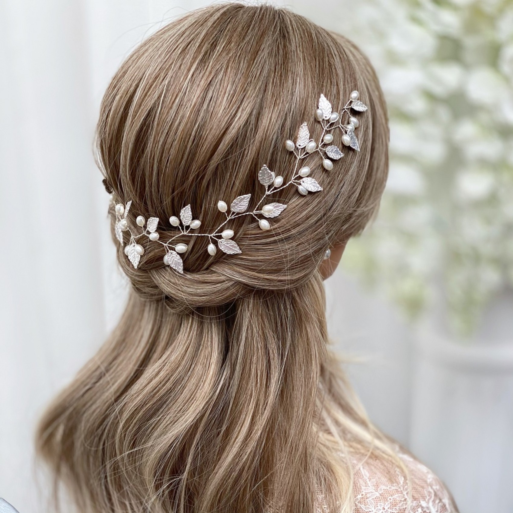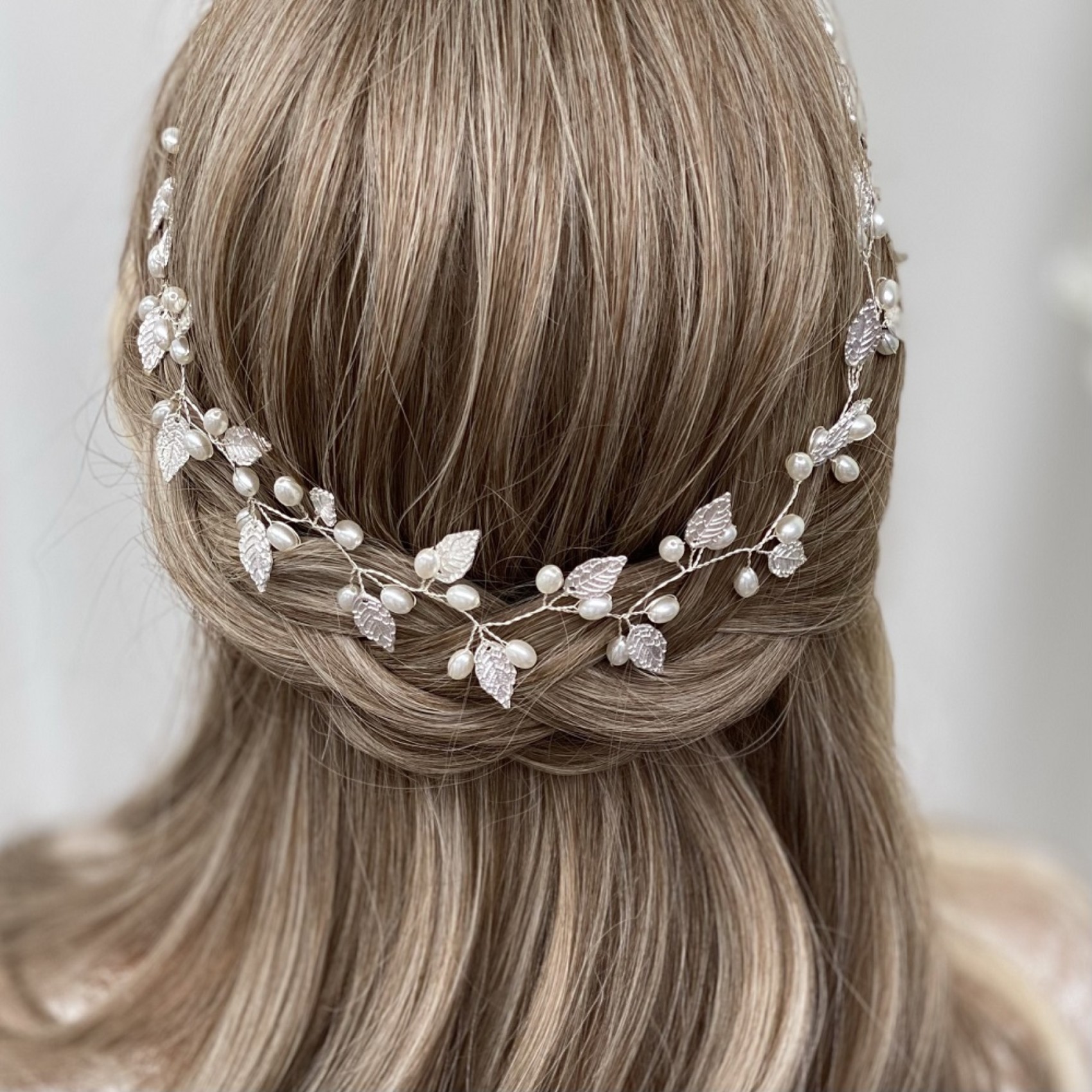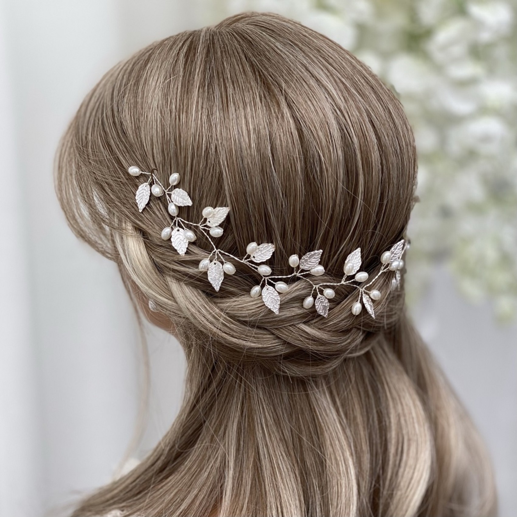 Adorned with delicate silver leaves and luminous ivory pearls, this long floral hair vine adds a touch of bohemian beauty to wedding hair. Wear as a bridal halo, weaved into a braid or wrapped around a bun. Secures into the hair with pins using the small wire loops at each end. A stunning bridal headpiece for an Autumn or woodland wedding this hair vine is perfect for brides looking for a striking yet delicate accessory.