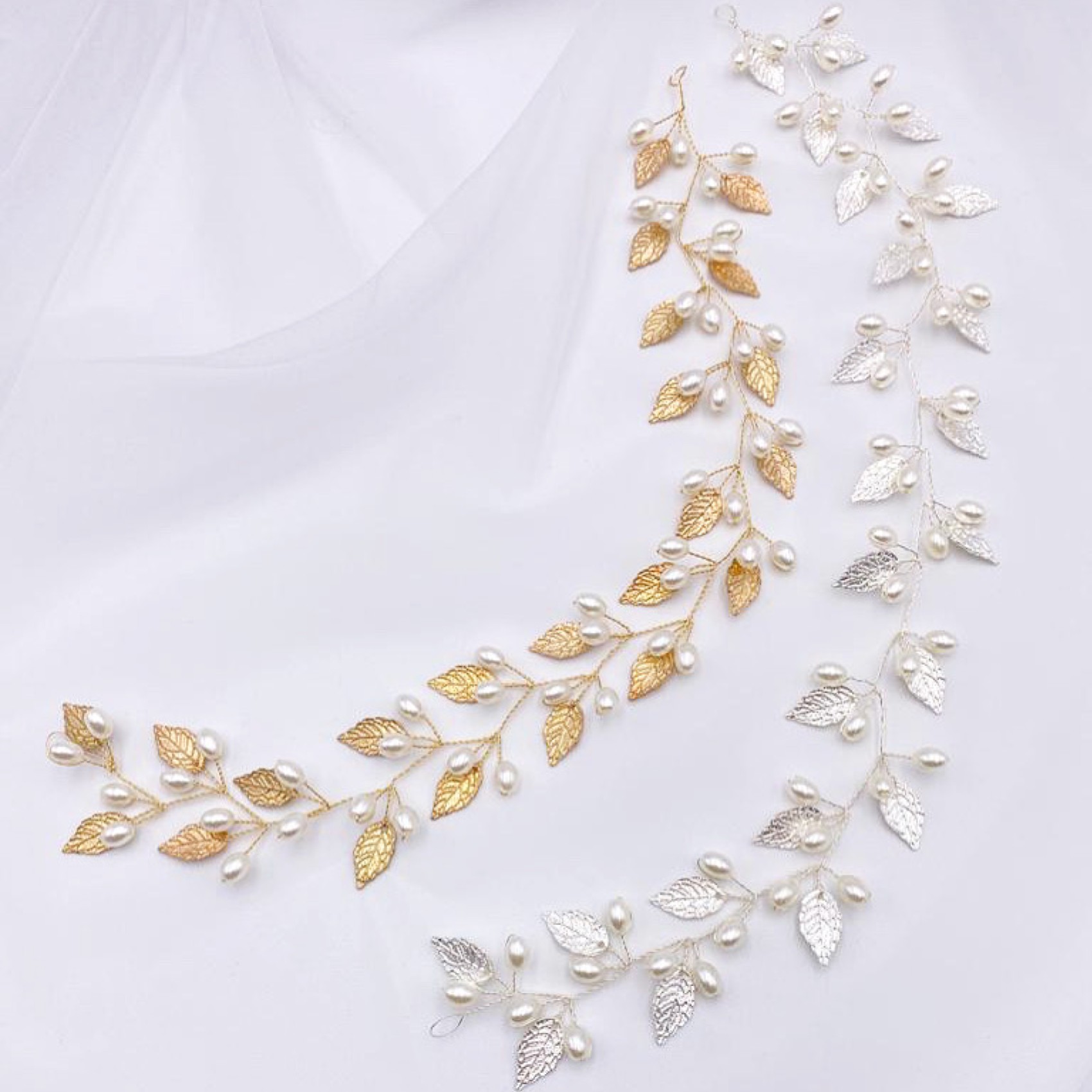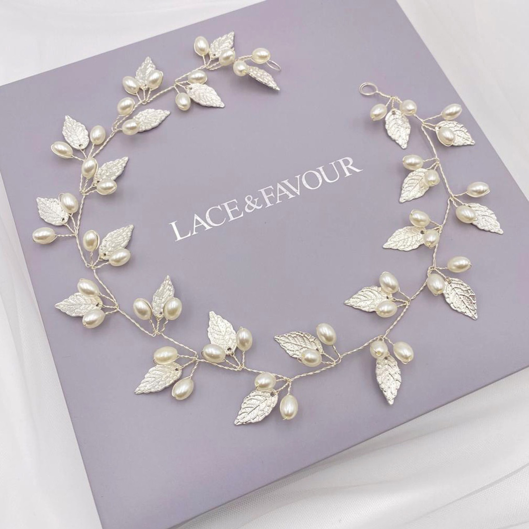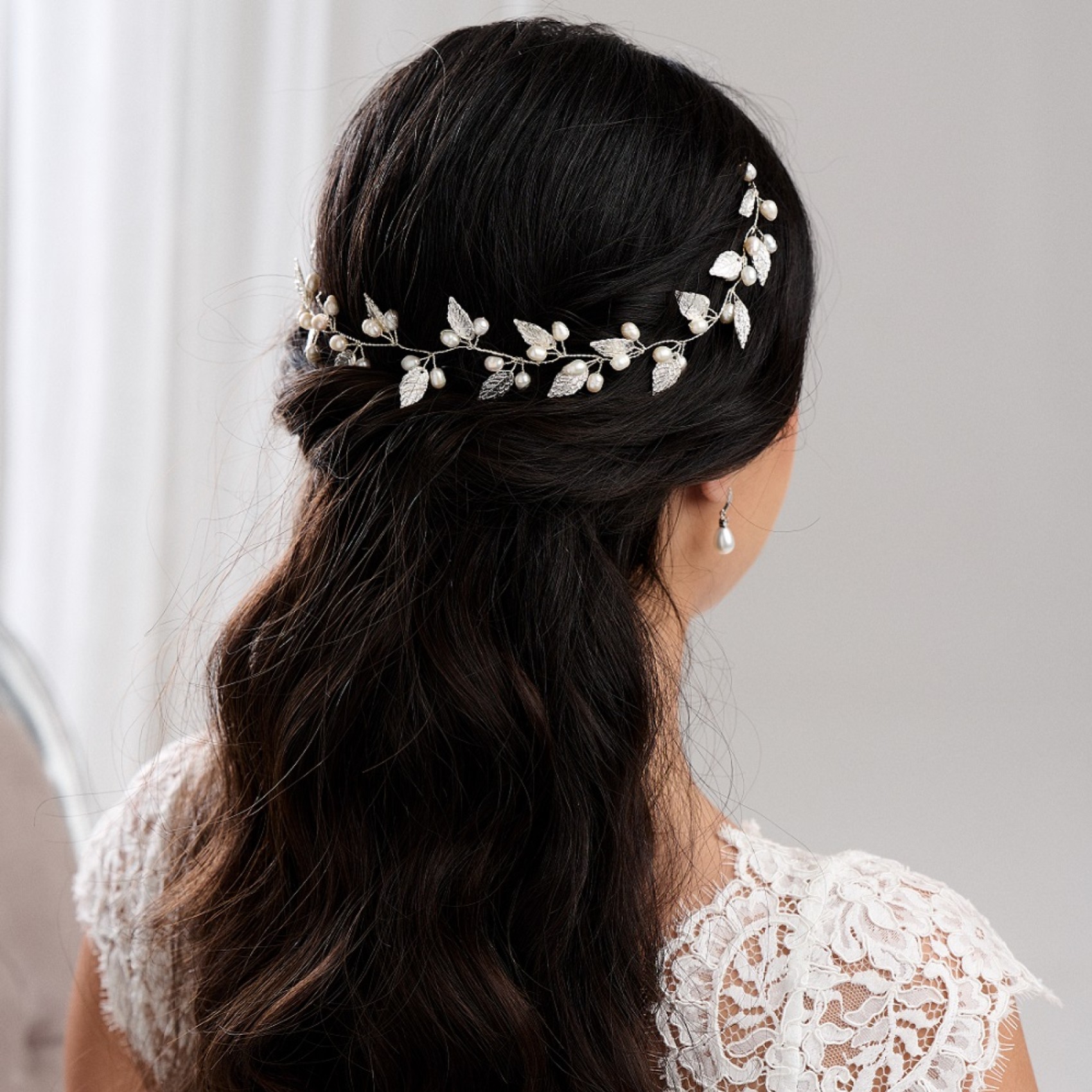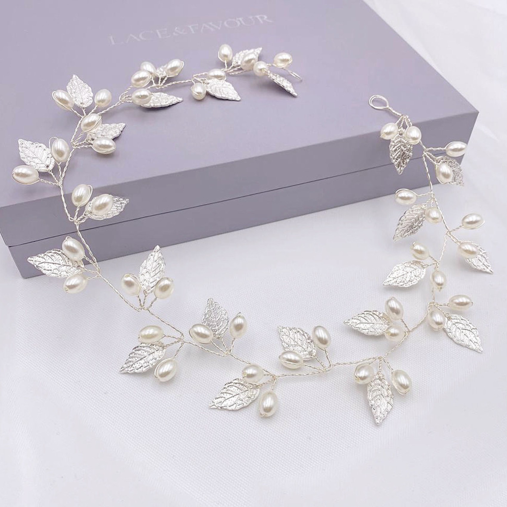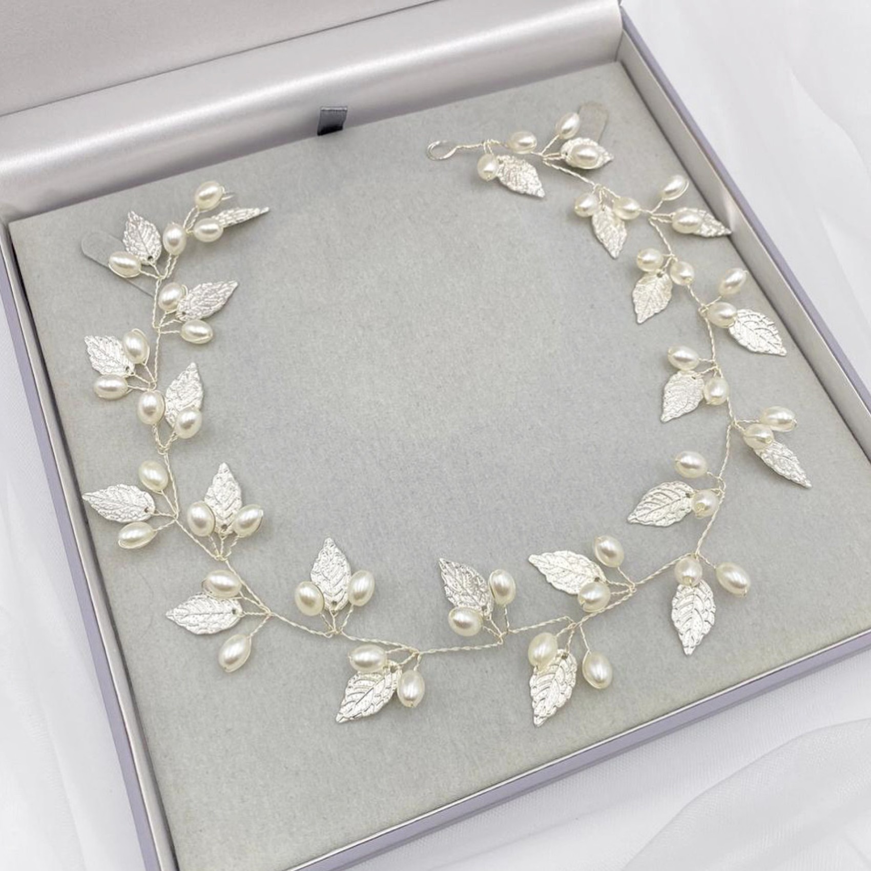 Adorned with delicate silver leaves and luminous ivory pearls, this long floral hair vine adds a touch of bohemian beauty to wedding hair. Wear as a bridal halo, weaved into a braid or wrapped around a bun. Secures into the hair with pins using the small wire loops at each end. A stunning bridal headpiece for an Autumn or woodland wedding this hair vine is perfect for brides looking for a striking yet delicate accessory.